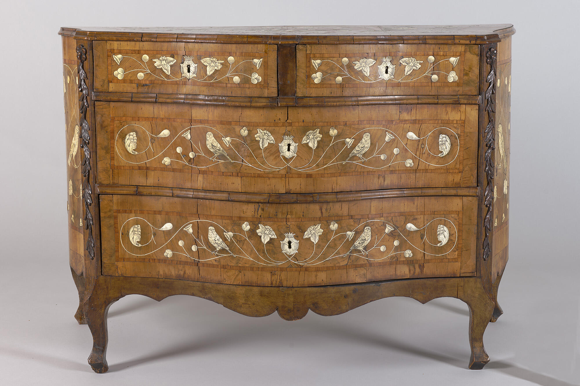 Italian, Veneto, Chest of Drawers (Cassettone), 1750–1799 (inlays: early 1800s). Walnut, pine, rosewood, and bone with bronze fittings, 82.9 x 122.8 x 57.9 cm (32 5/8 x 48 3/8 x 22 13/16 in.) After its 2023-2024 conservation treatment
