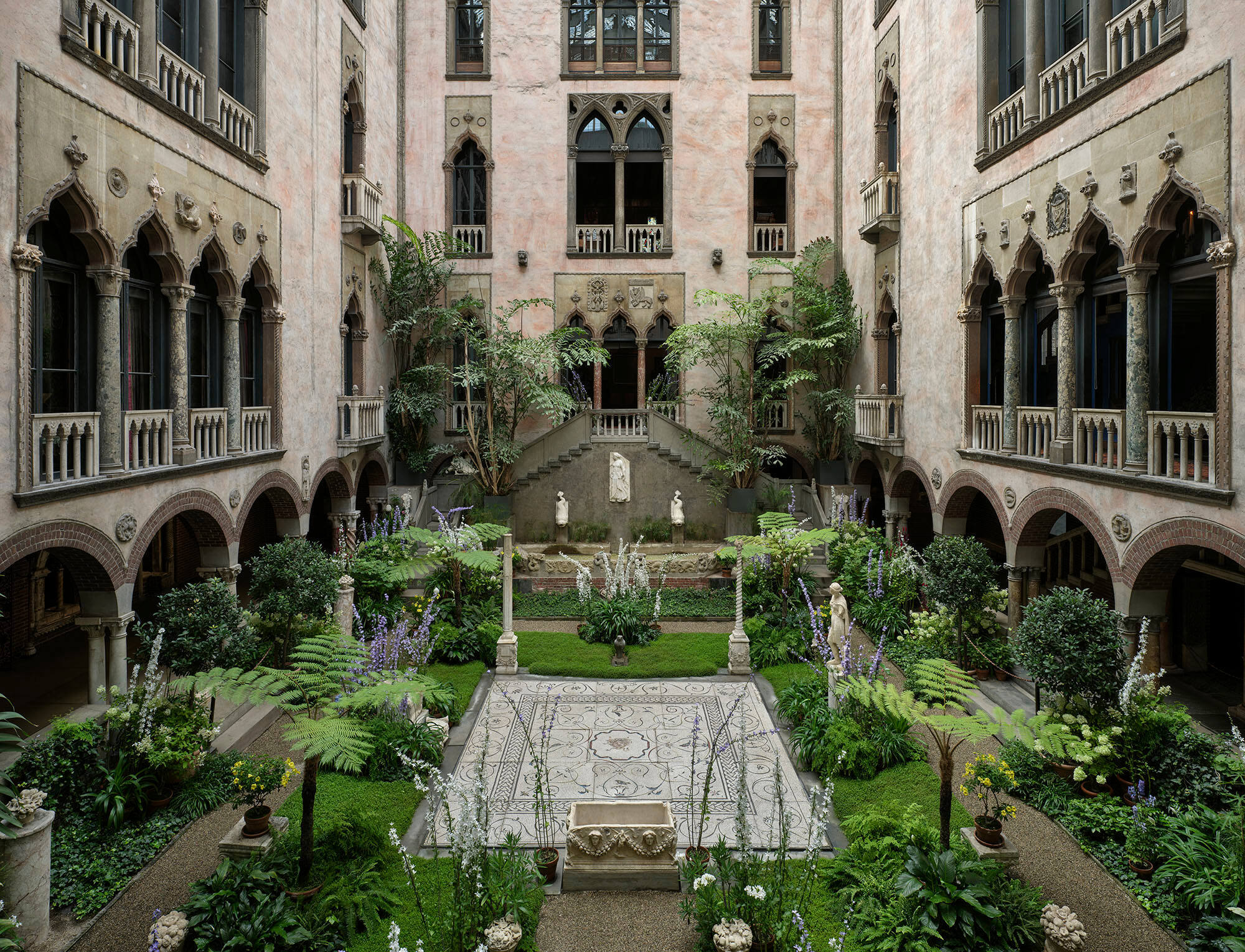 Inside the Courtyard is perhaps the most poignant piece of funeral sculpture in the collection: a child's sarcophagus of about CE 250, decorated with garlands, which many interpret as a nod to Isabella's own son, Jackie, who died in early childhood. It stands at the very center of the Courtyard, at the foot of the Medusa mosaic. By positioning this small sarcophagus, the Farnese Sarcophagus, and the Islamic tombstone in and around the garden of the Courtyard, Gardner echoed the nineteenth-century invention of landscaped cemeteries with elaborately carved monuments and mausoleums that invoke ancient architectural styles.
