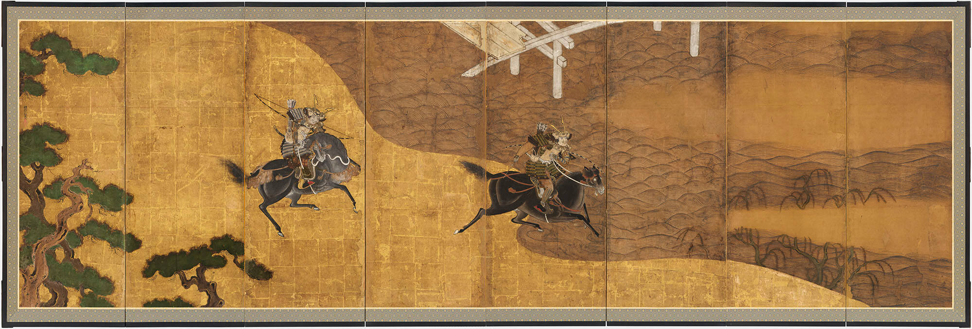 The battle of the River Uji is a famous battle that occurred just outside Kyoto, Japan, in 1182. Two rival warriors, Kajiwara Kagesuye and Sasaki Takatsuna, raced to see who would be the first to cross the River Uji and meet the enemy.  Sasaki won by tricking his competitor. A few yards behind as they approached the river, he called to Kajiwara, “Your saddle girth is loose! Don’t fall and be the laughing stock of the enemy.”  Kajiwara, seen on the left, looks down just before Sasaki dashes into the water triumphantly.