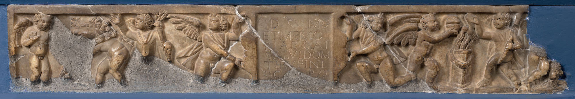 Inscribed (central tablet): DM/ETMEMO/RIAE GAI/SALVIDOMI / TI*RVFINI/CP (For the Manes [Chthonic deities, like Lares] and to the memory of / Gaius Salvius Domitius / Rufinus, [our] dear father)