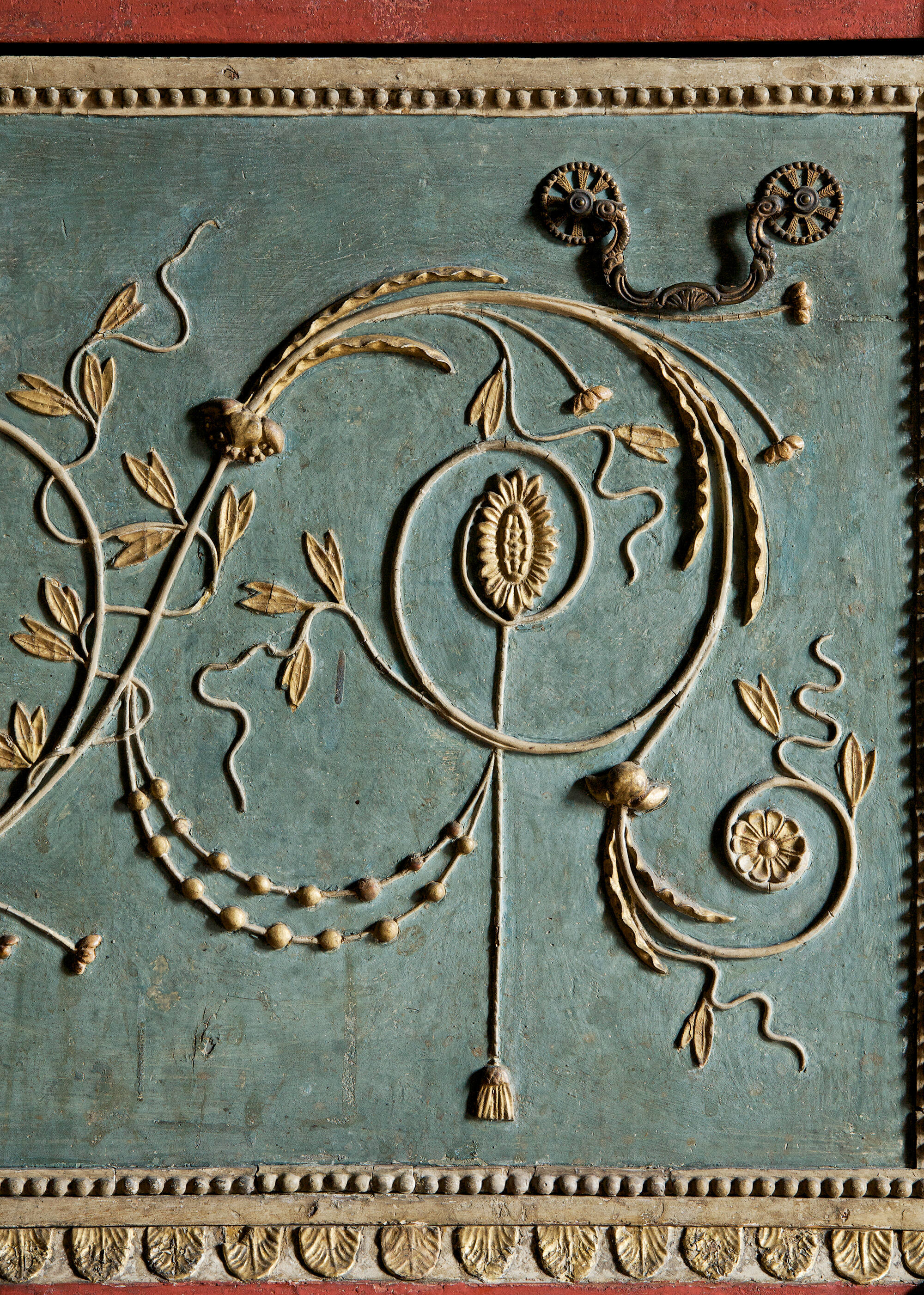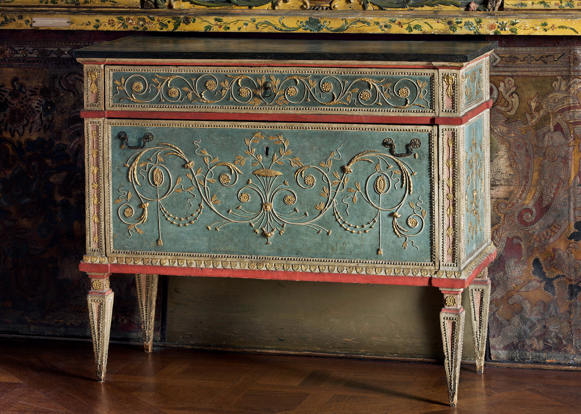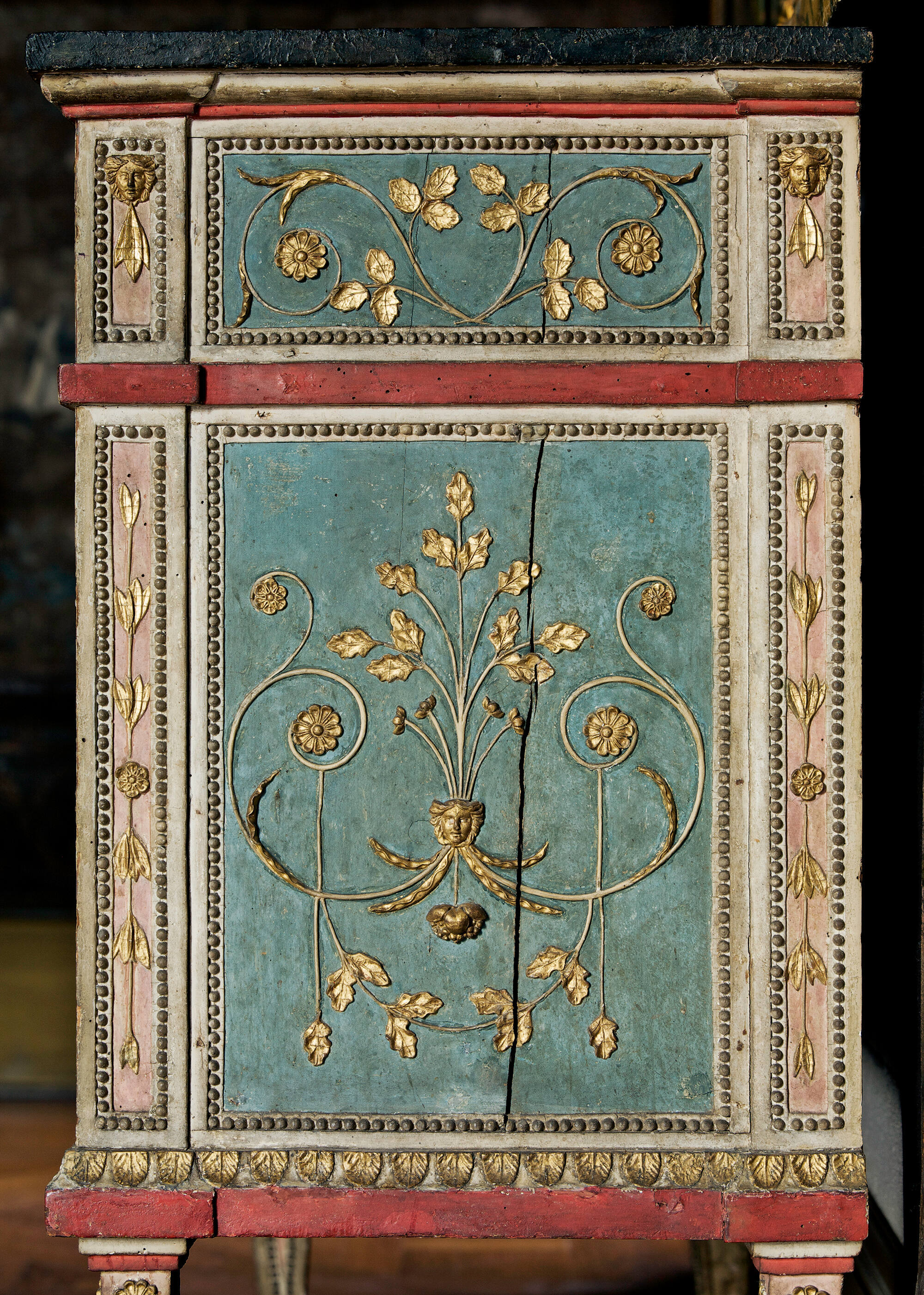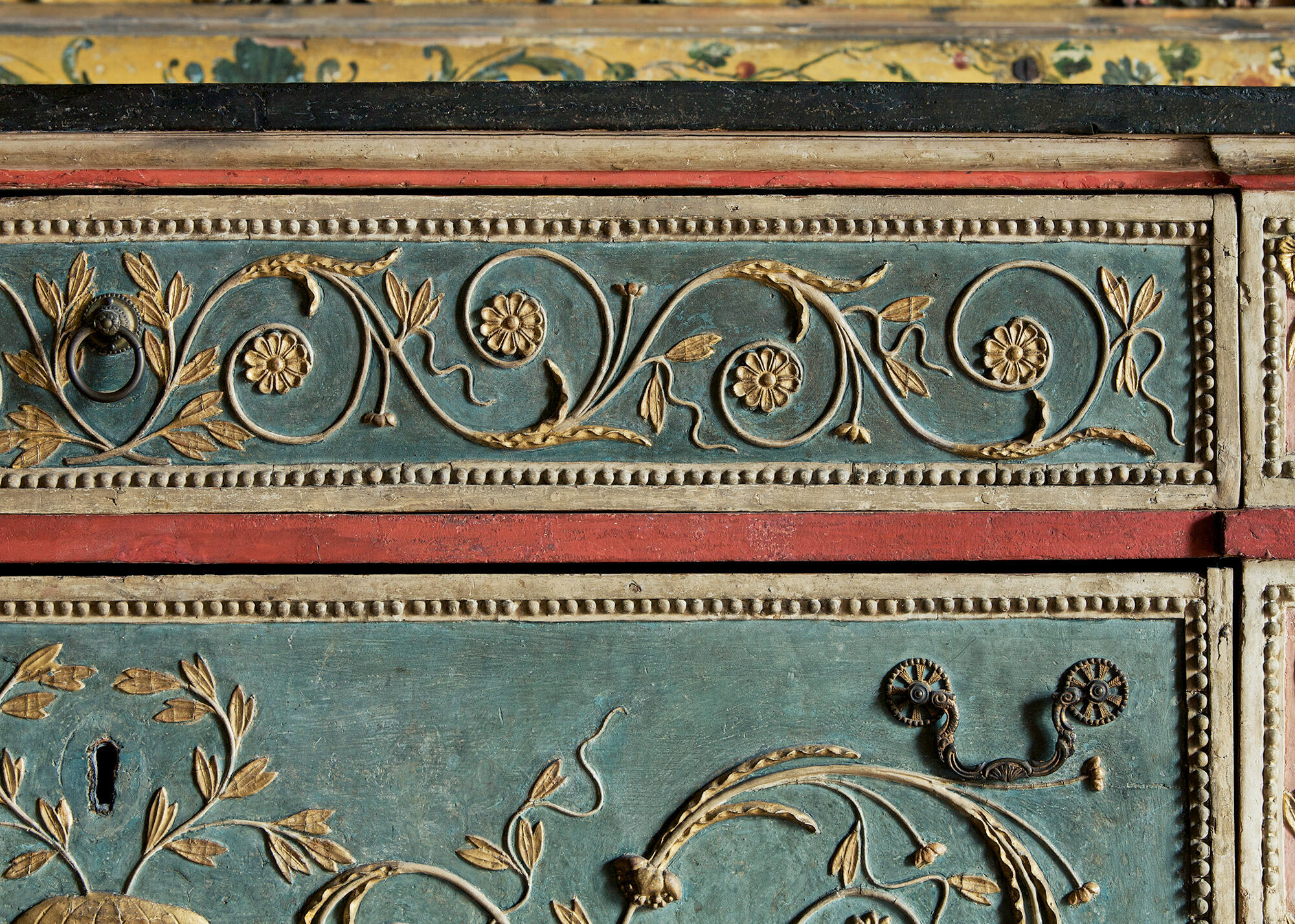 Painted and gilded pine, bronze (with chestnut for drawer rails)
