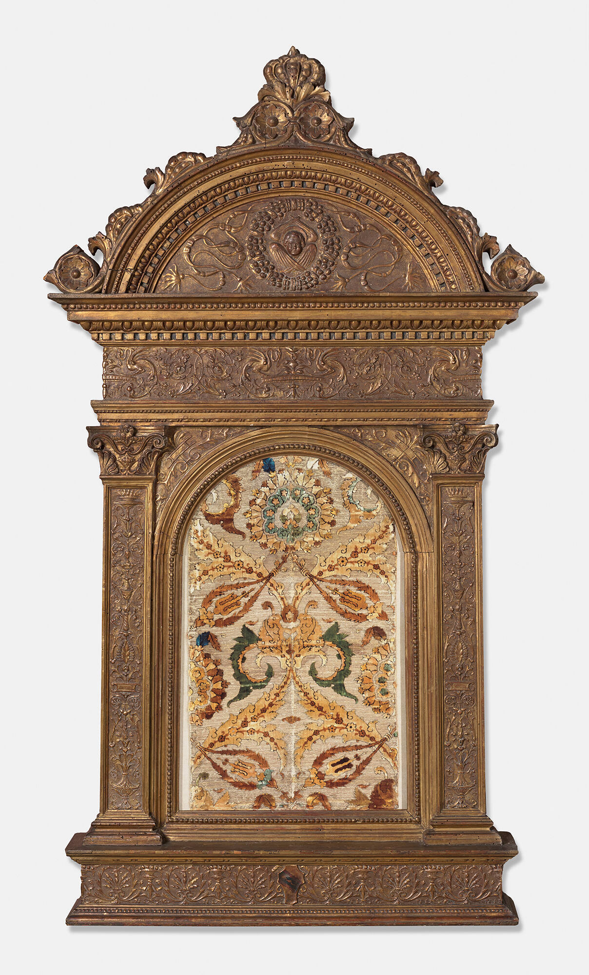 This intricate voided velvet is from the Safavid dynasty of Iran, which reigned from 1501-1722. Textiles from this period are considered to be the height of Iranian loom weaving. The Safavid Empire centralized the Iranian textile industry, which helped them create a large revenue stream for their empire, as well as luxurious fabrics, such as this one. It is appropriate that this textile is installed in the Titian Room, a room that Gardner intended to be about power and authority. The piece was probably cut from a larger furnishing or garment fabric.