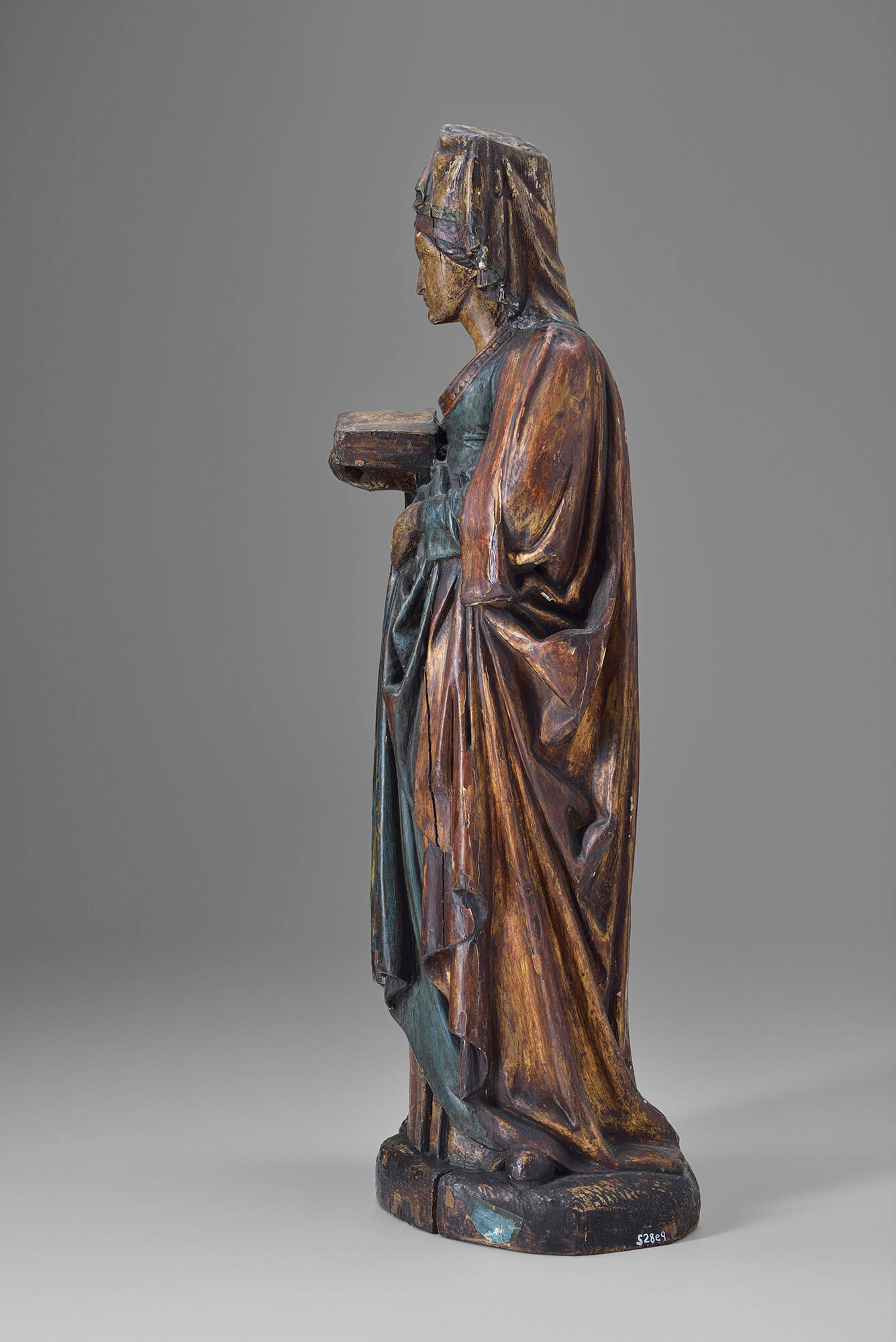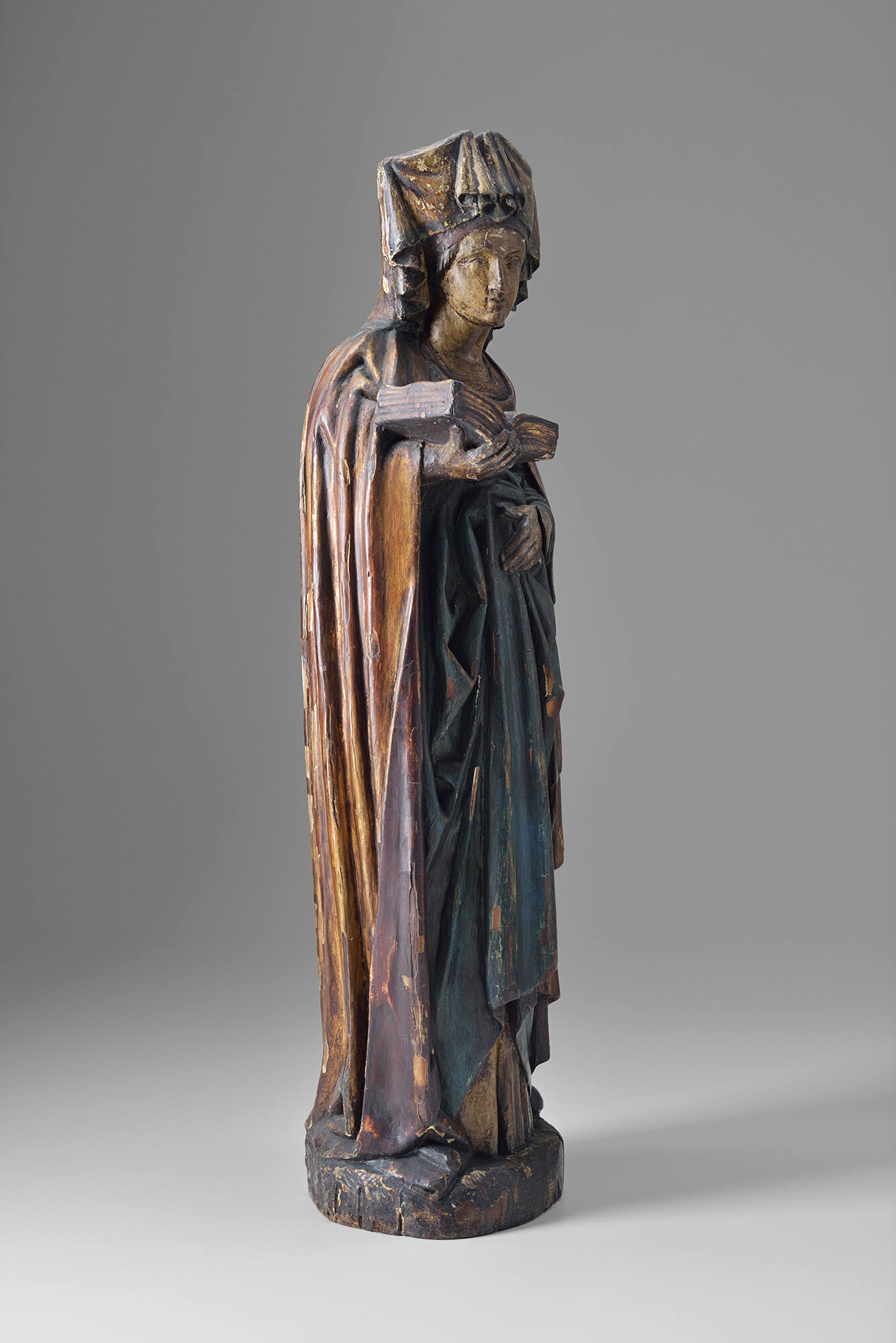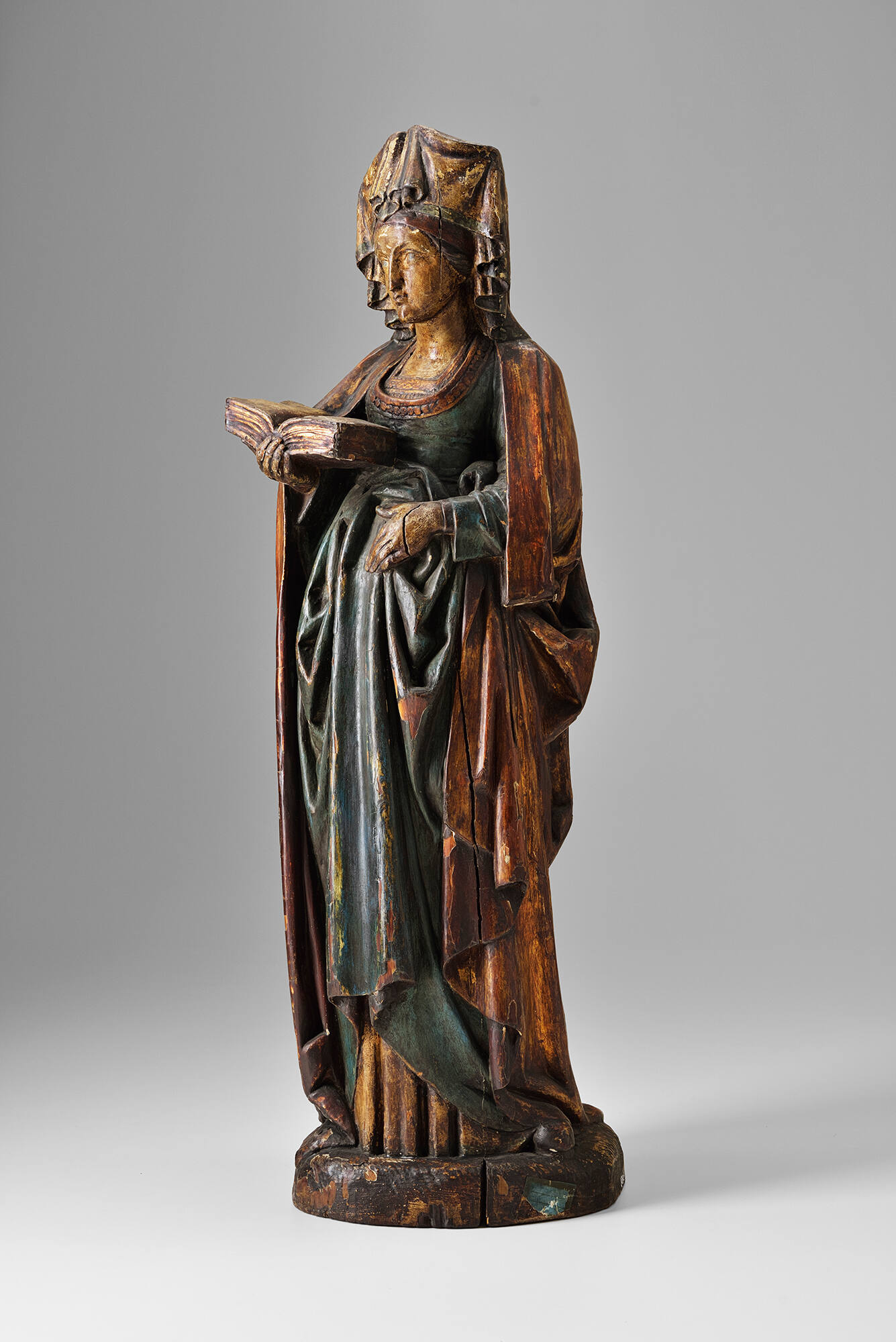 This French sculpture of a light-skinned female saint is made of wood decorated with multiple colors and gilding. The figure is standing, looking up. She is holding an open book in her right hand and her left hand is placed near her stomach. There are many folds in her scoop-necked dress, which appears mostly bluish-green, and in her cloak and headpiece, which appear mostly gold. Some of the decorations have faded or loosened over time, and there are some cracks in the wood, such as in the left hand. The back of the figure is rather flat, with less detail than the front.