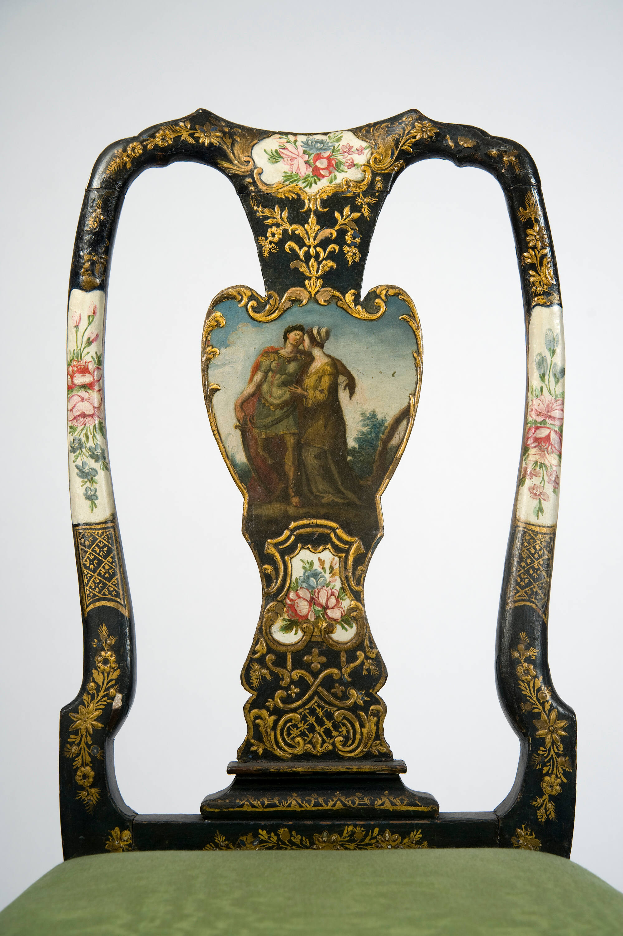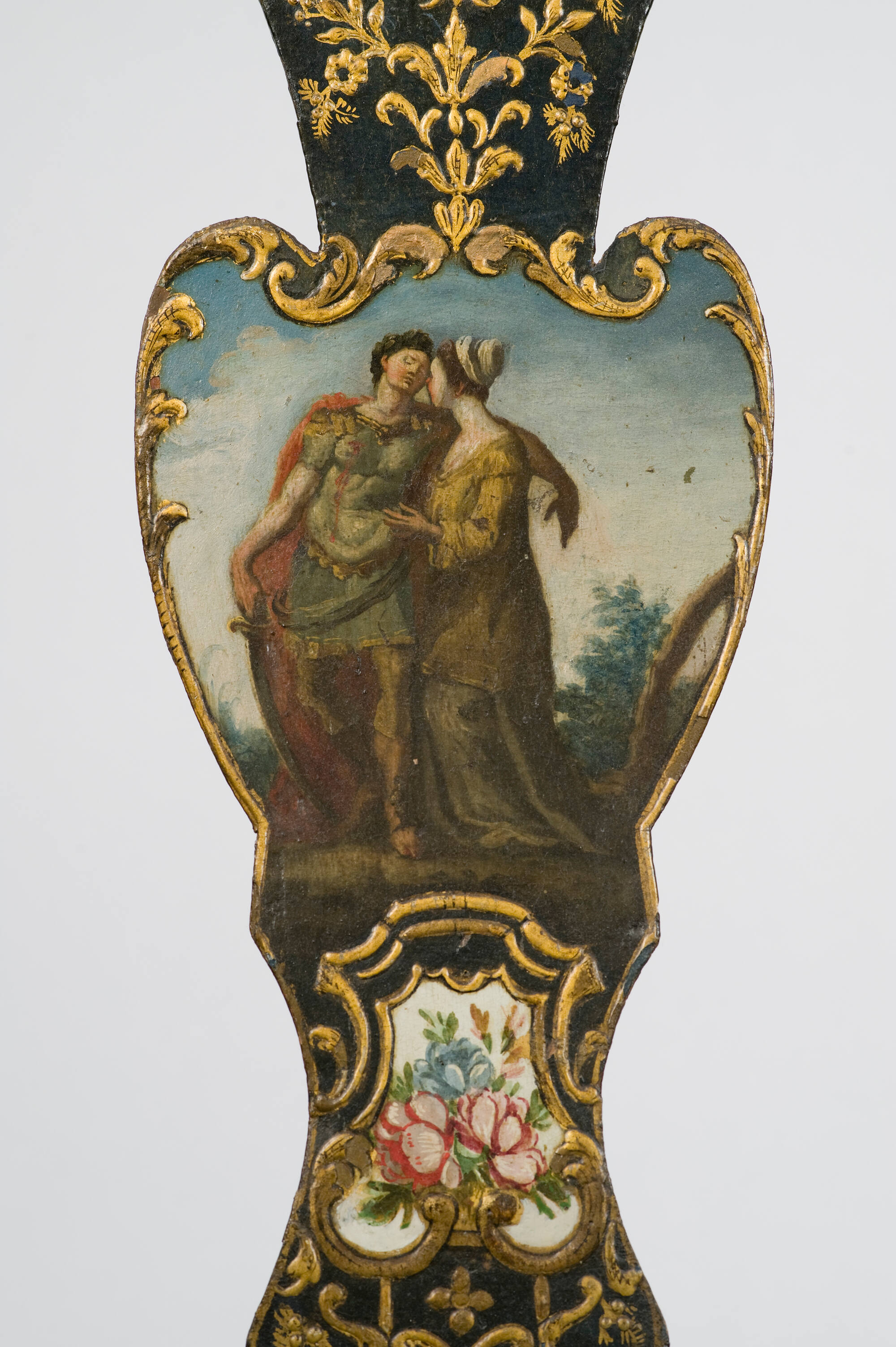 The slats on this set of chairs are delightfully painted with various figures in exotic ancient Middle Eastern, African, or Asian garb. Although painted furniture is often connected with Venice, the chairs possess an unusual mixture of stylistic forms and decorative designs, and may have been made in central Italy, perhaps Lucca or Rome.