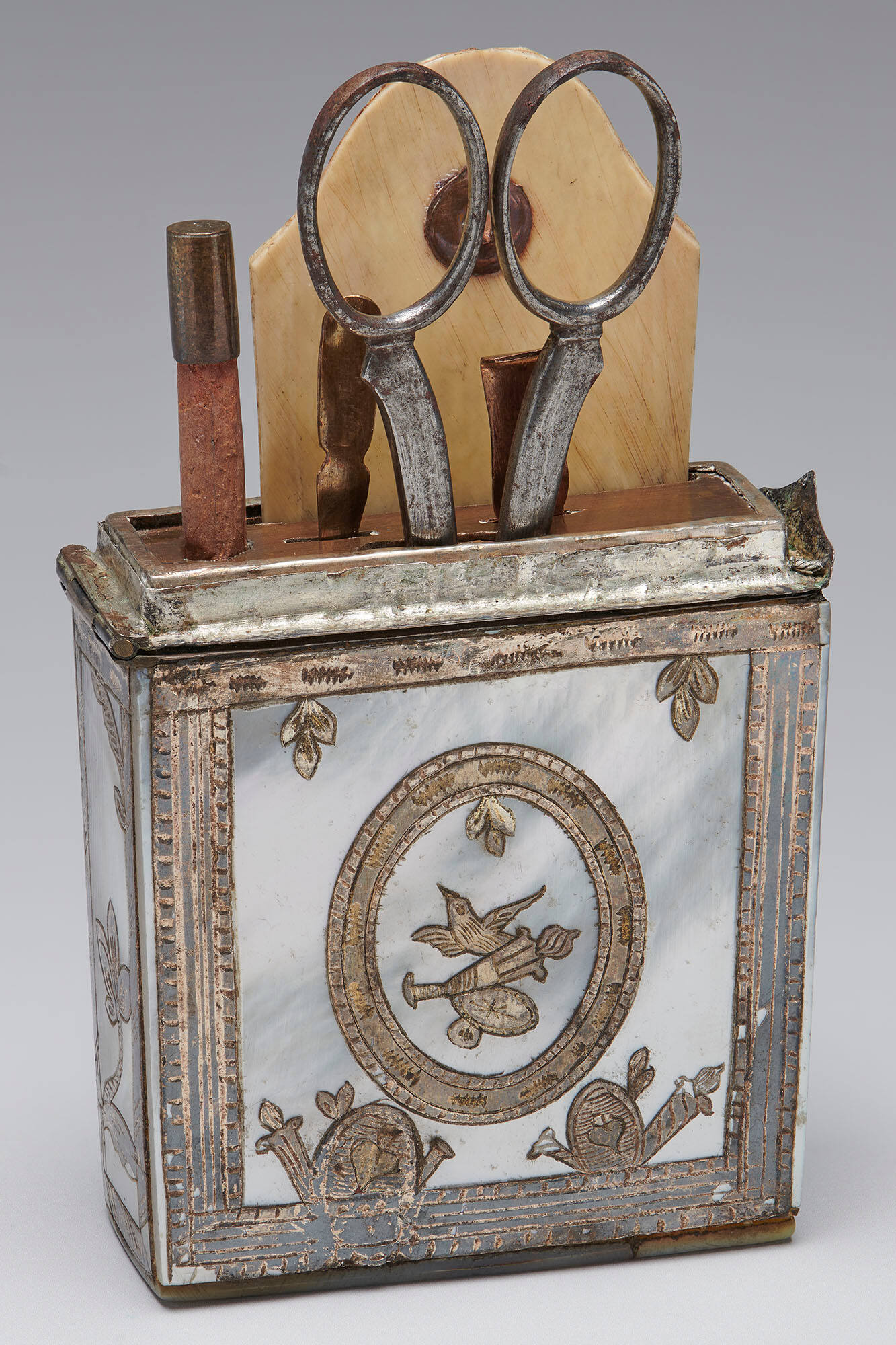 Paper with silver, brass, and mother-of-pearl veneer