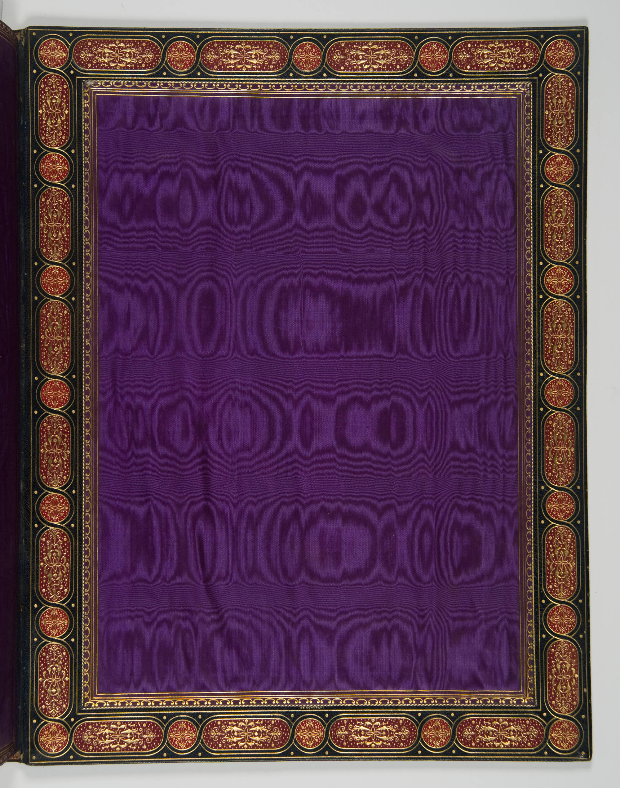 Dark blue goatskin with purple silk moiré doublures and fly-leaves framed by gilt-tooled, circular and oval compartments of red goatskin