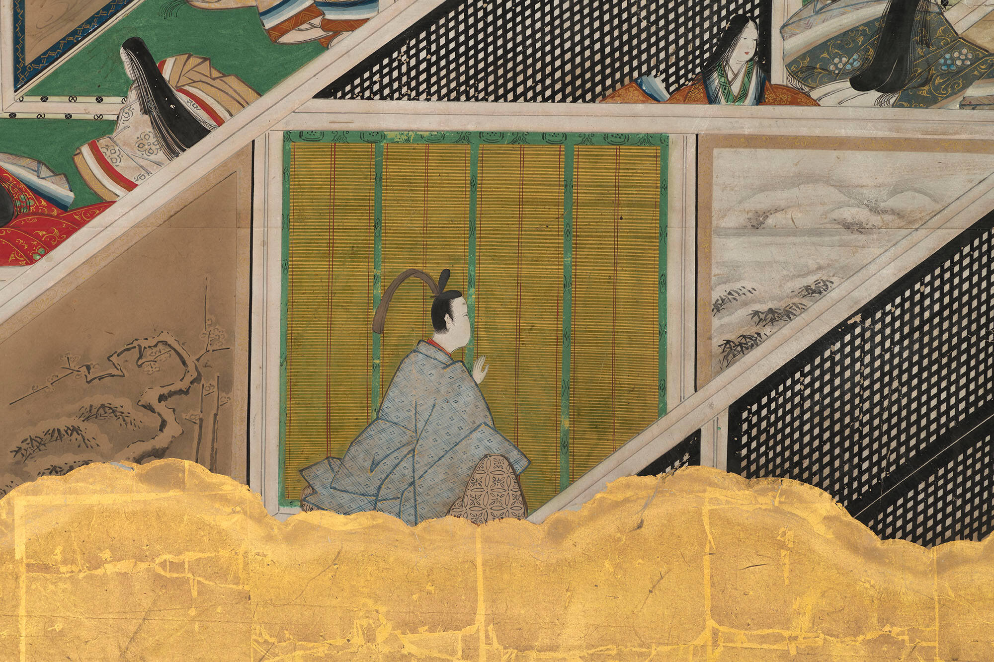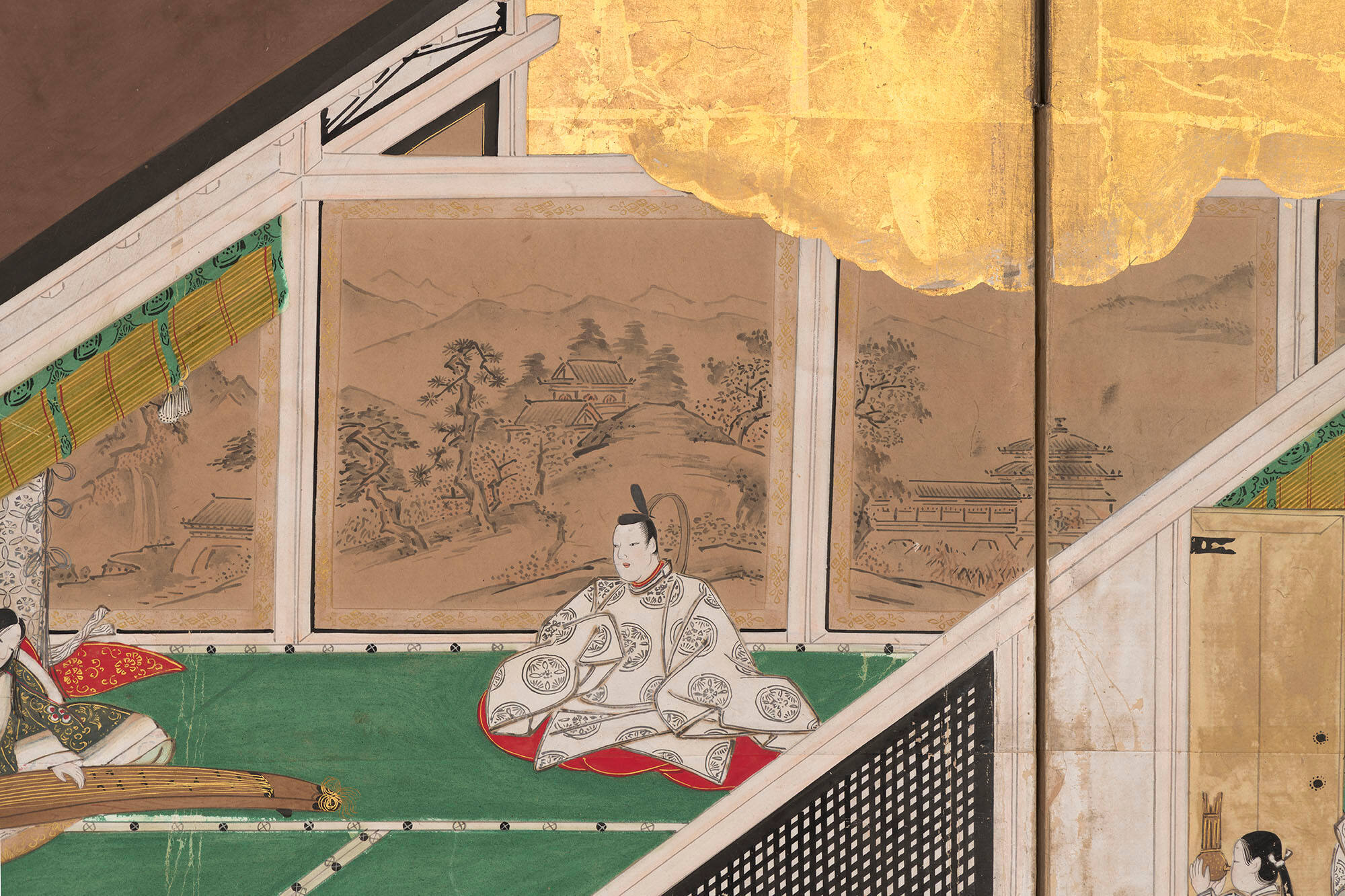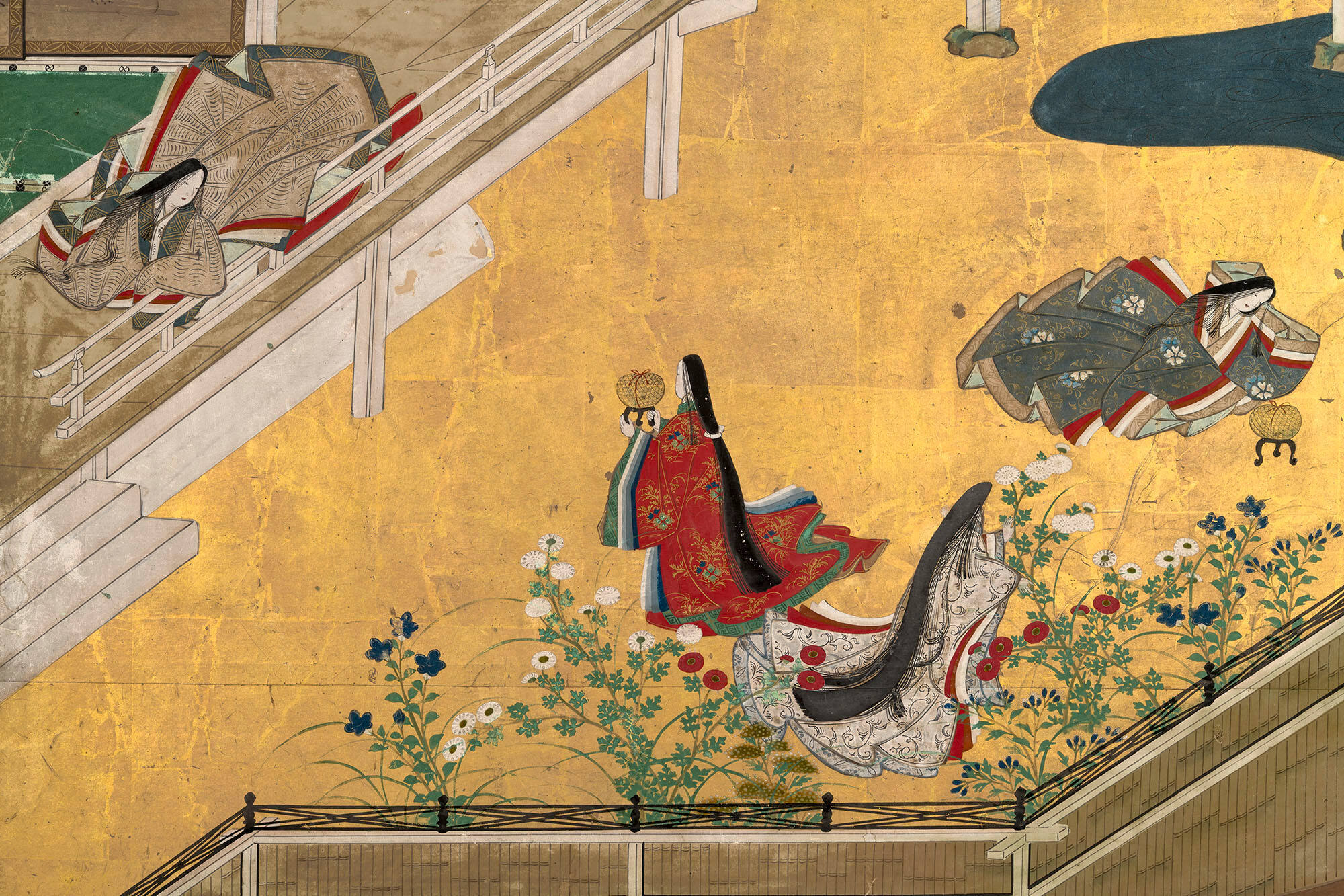 Nestled amid the golden clouds in this vibrant pair of screens are depictions of twelve chapters from the Tale of Genji, one of the world’s earliest novels. Written around the year 1000 by Murasaki Shikibu, a lady-in-waiting at the court in Kyoto, the story vividly portrays courtly customs through an intricate web of human relations. The protagonist Genji epitomizes the ideal male persona of the time: strikingly attractive and a master of all the arts, he was also a great lover. Indeed much of the long novel revolves around his liaisons with women of the court.