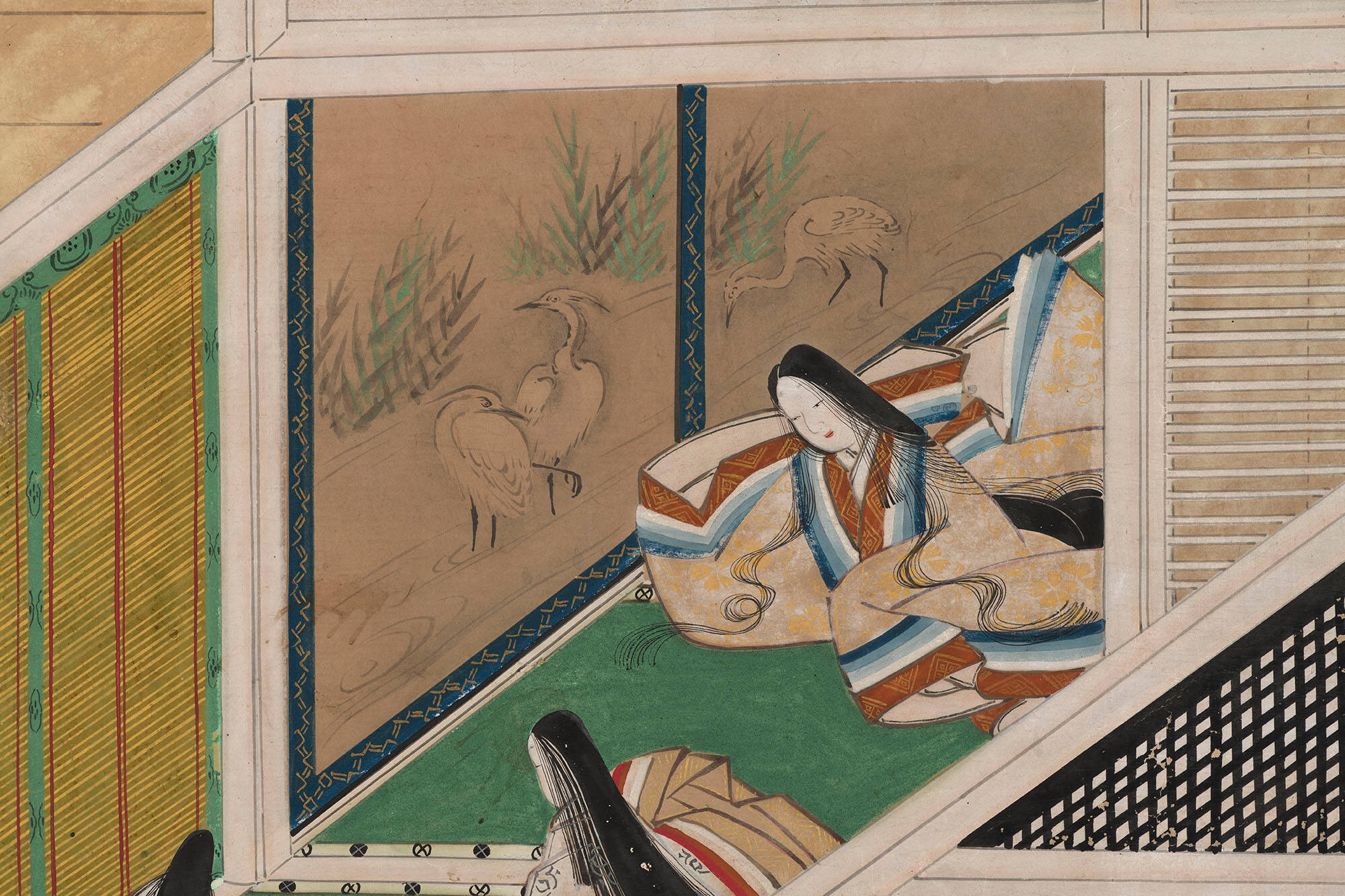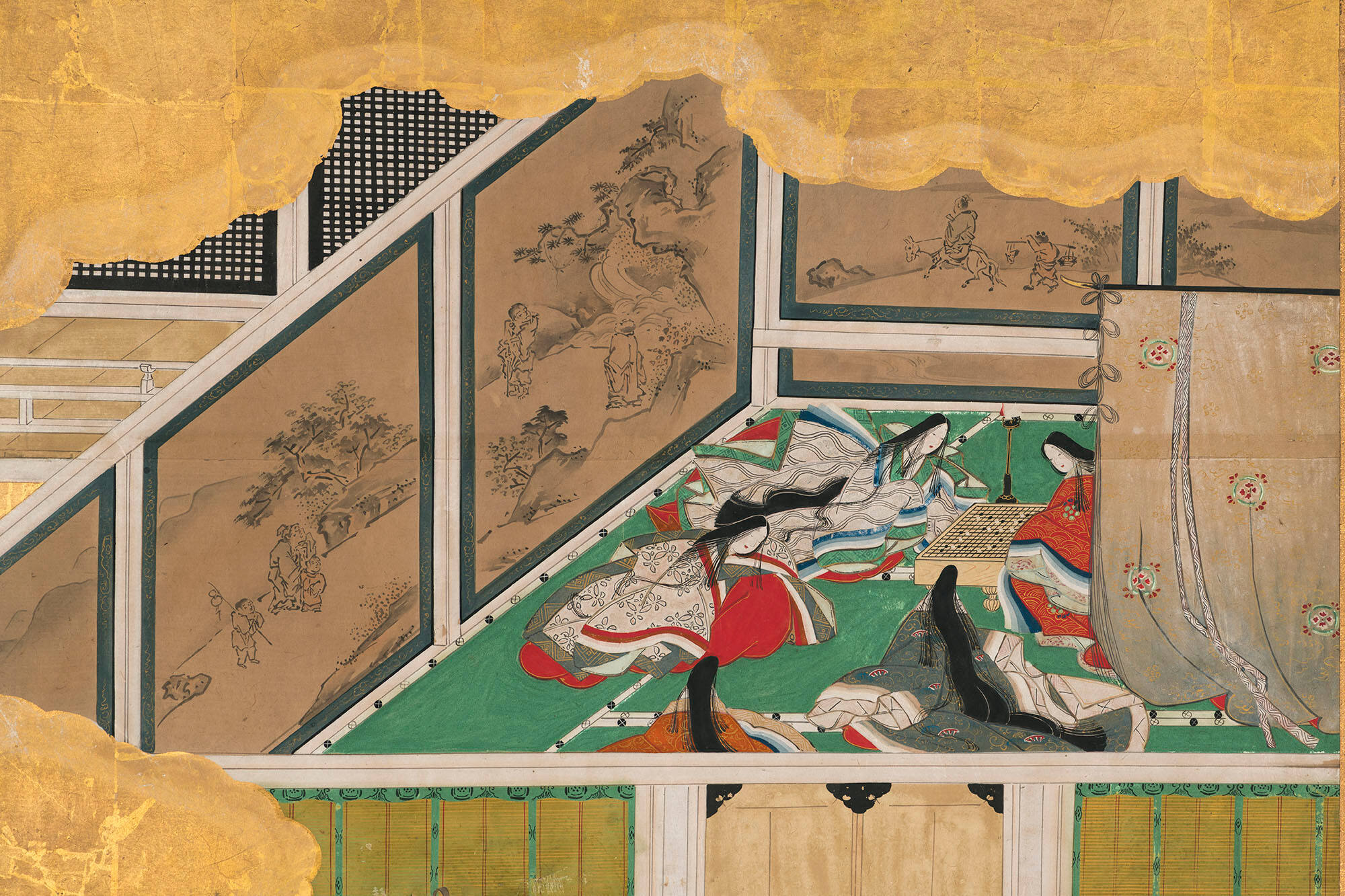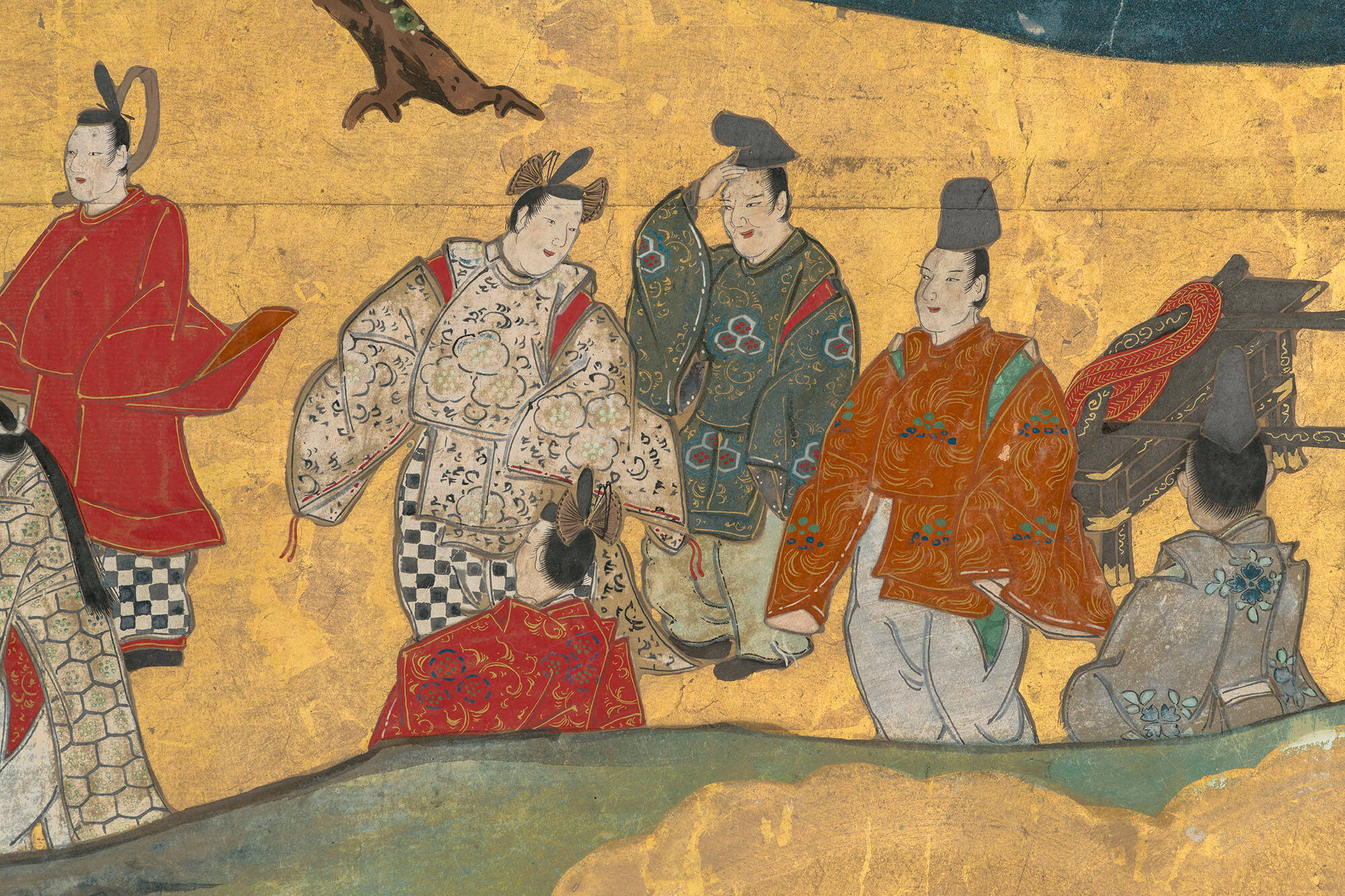 Nestled amid the golden clouds in this vibrant pair of screens are depictions of twelve chapters from the Tale of Genji, one of the world’s earliest novels. Written around the year 1000 by Murasaki Shikibu, a lady-in-waiting at the court in Kyoto, the story vividly portrays courtly customs through an intricate web of human relations. The protagonist Genji epitomizes the ideal male persona of the time: strikingly attractive and a master of all the arts, he was also a great lover. Indeed much of the long novel revolves around his liaisons with women of the court.