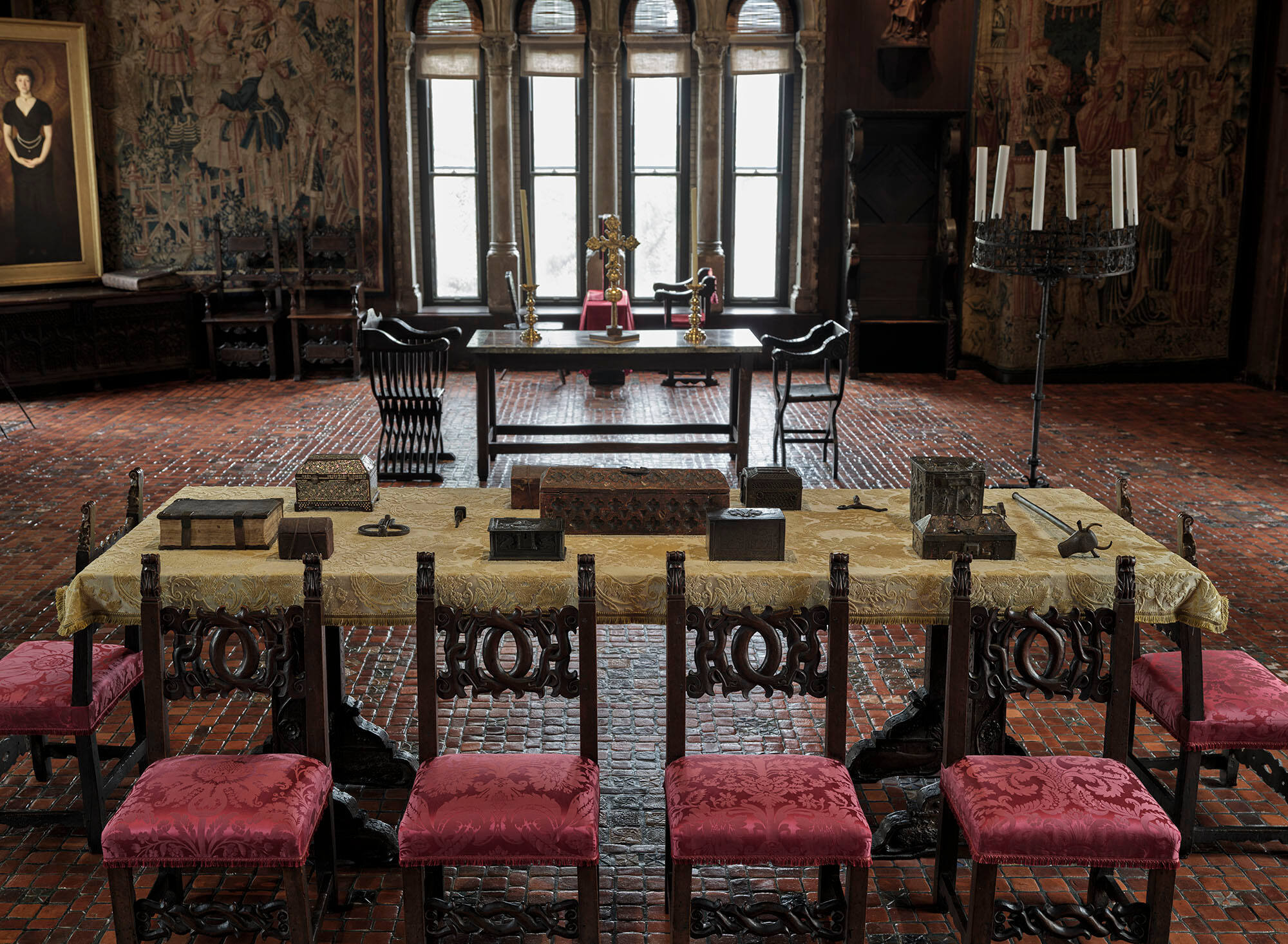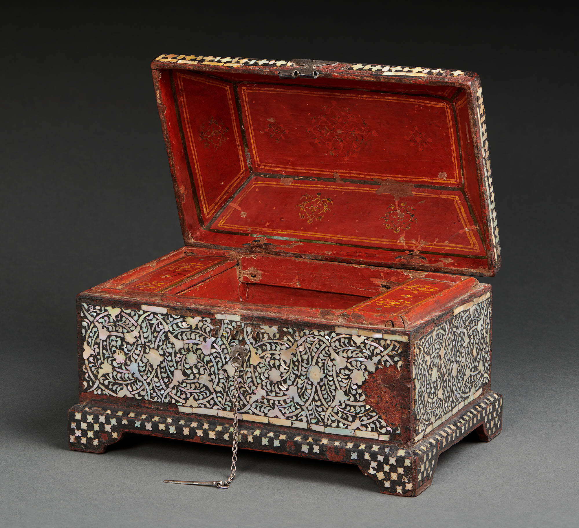 This casket is made of wood covered with colored resin and inlaid with mother-of-pearl. Although it was acquired in 1899 by Isabella Stewart Gardner as a Venetian work of the 17th or 18th century, it is actually Indian and at least a century older. Its form, materials, and decorations are closely related to caskets from the Indian state of Gujarat, which is on the western coast of India and a range of objects decorated with mother-of-pearl during the 16th and 17th centuries. At this time, Gujarati mother-of-pearl objects were produced both for local consumption, as well as for export to the Middle East and Europe. The precise origin of this type of rectangular casket with a beveled lid remains unclear. However, it may have its roots in Chinese decorative arts from as early as the 10th century. The form was then adopted in different regions throughout Asia. Gujarati caskets can be distinguished from earlier Chinese, Korean, and Timurid caskets by the plinth with bracket feet, which one can see in this casket.