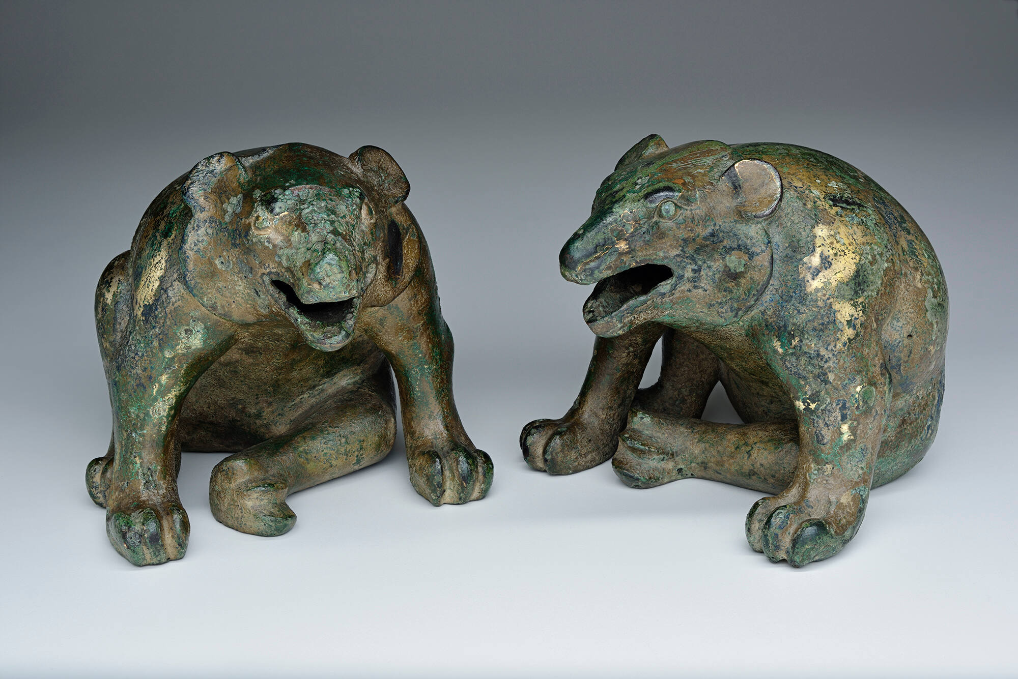 Delightfully naturalistic, these two bears sit heavily and somewhat awkwardly on the ground. With one hind leg tucked under, each one opens its mouth in a friendly growl. The carefully observed depiction of the animals cannily matches their original function, for these bronzes were meant to weight down the corners of straw or textile mats that were placed on low platforms for seating. Made in sets of four, mat weights have been excavated in aristocratic tombs of the Han dynasty. Often finely crafted, they appear to be highly prized personal possessions of daily use that were buried with their owners to represent the continuity between the living world and the afterlife.
