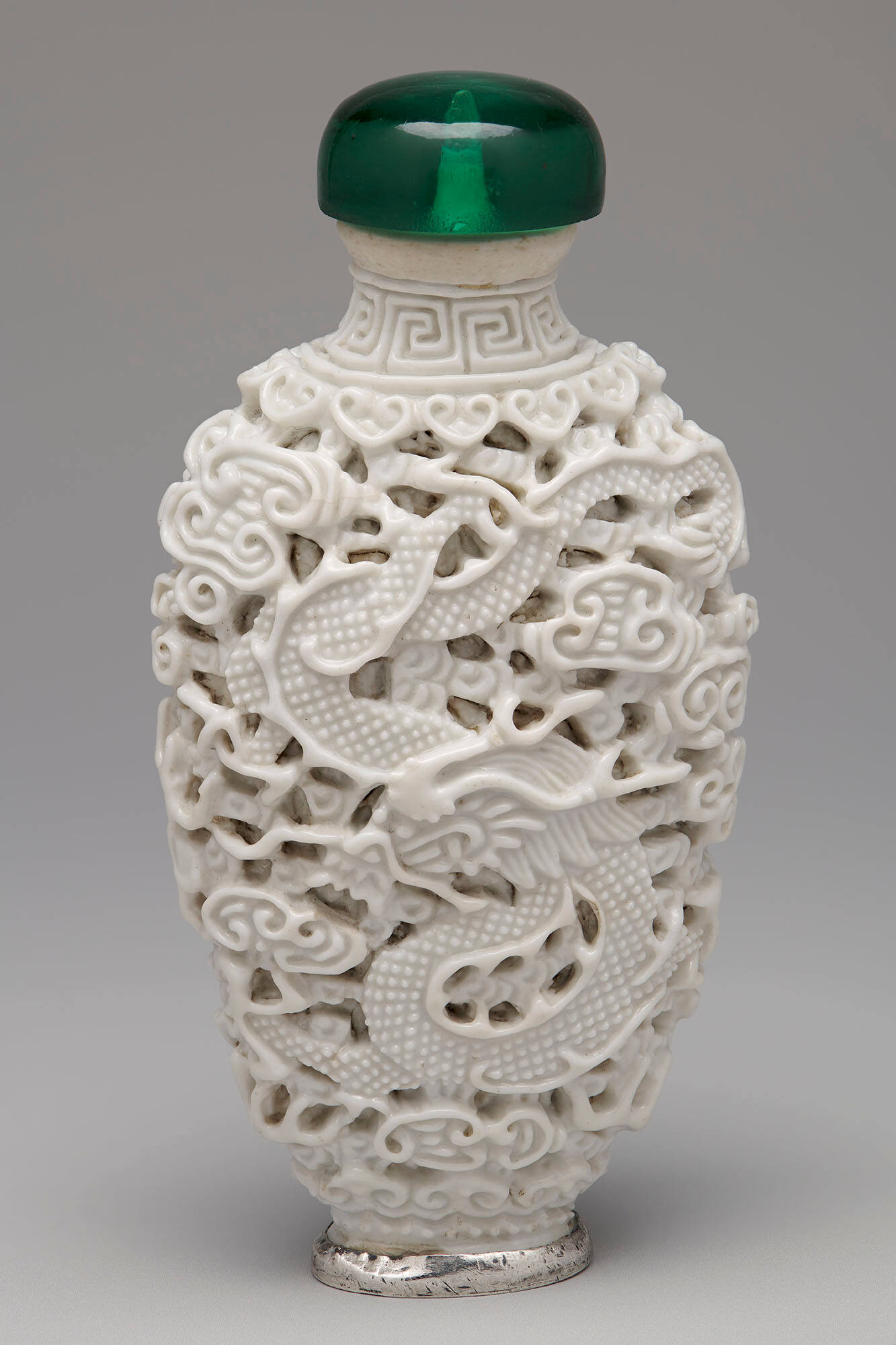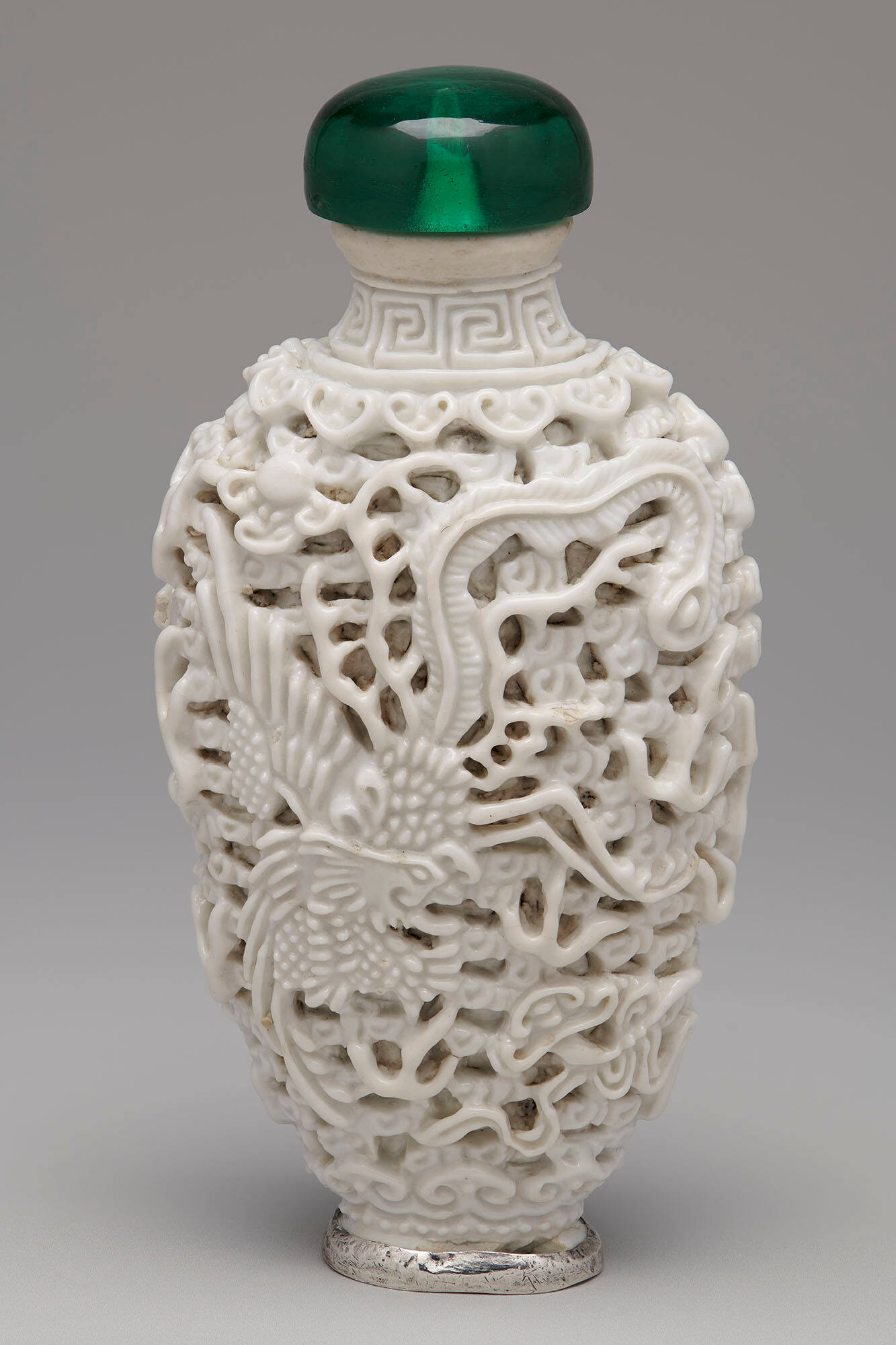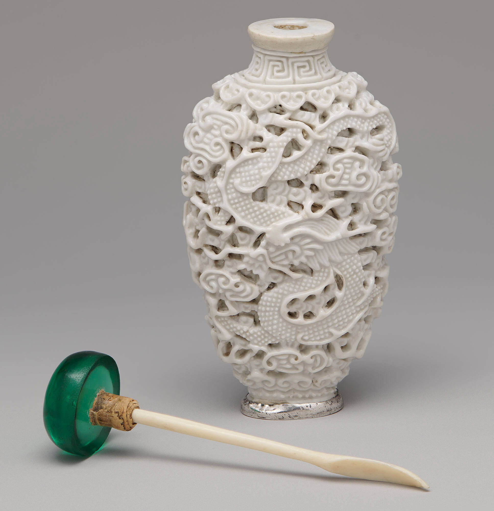 This bottle was created to hold snuff—a flavored powdered tobacco inhaled through the nose. Snuff—introduced to China by European missionaries and merchants—was widely used in the 1800s. Made from a variety of materials and sometimes elaborately decorated, Chinese snuff bottles have an airtight stopper to protect against humidity and a small scoop for removing the tobacco.
