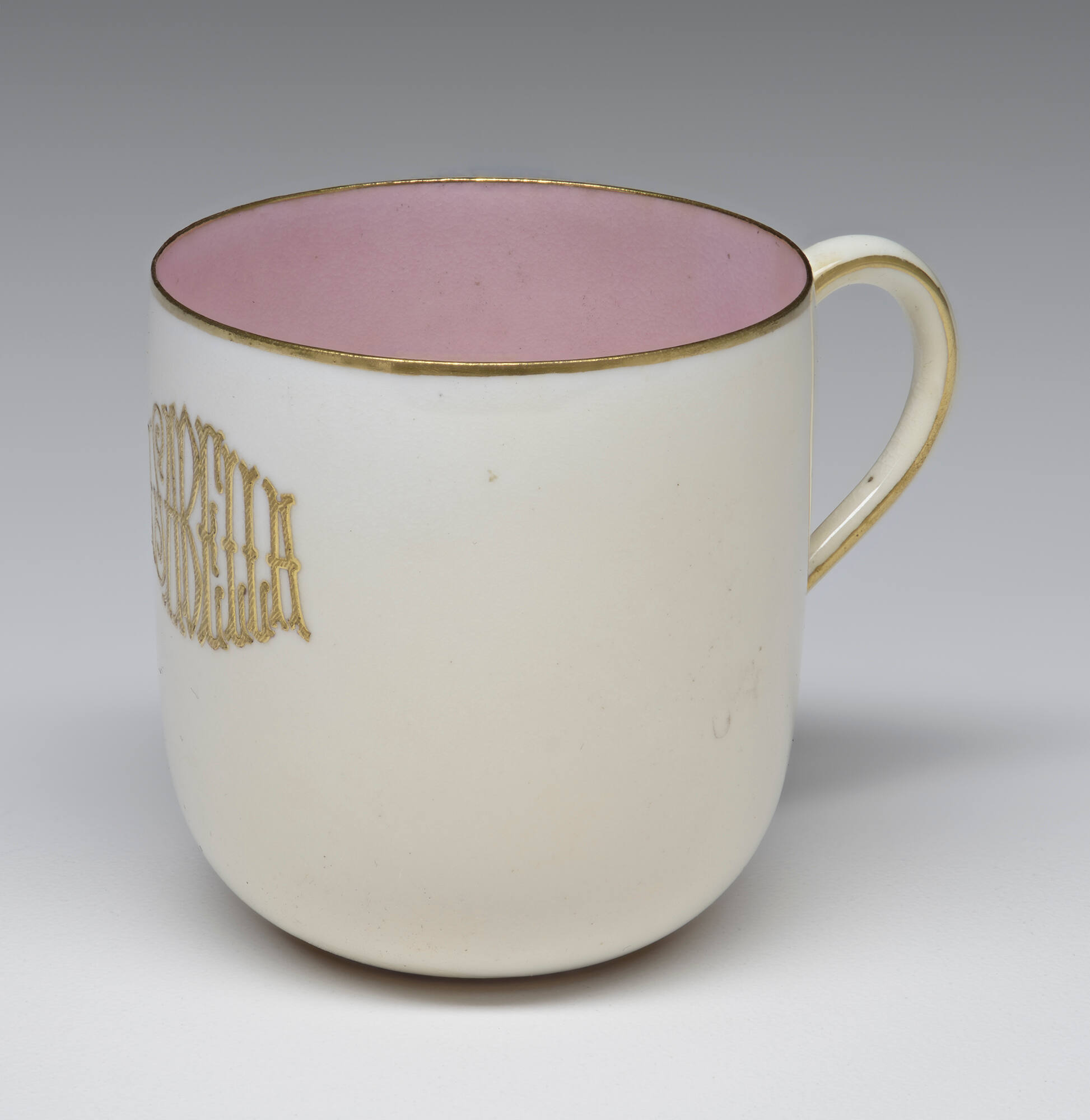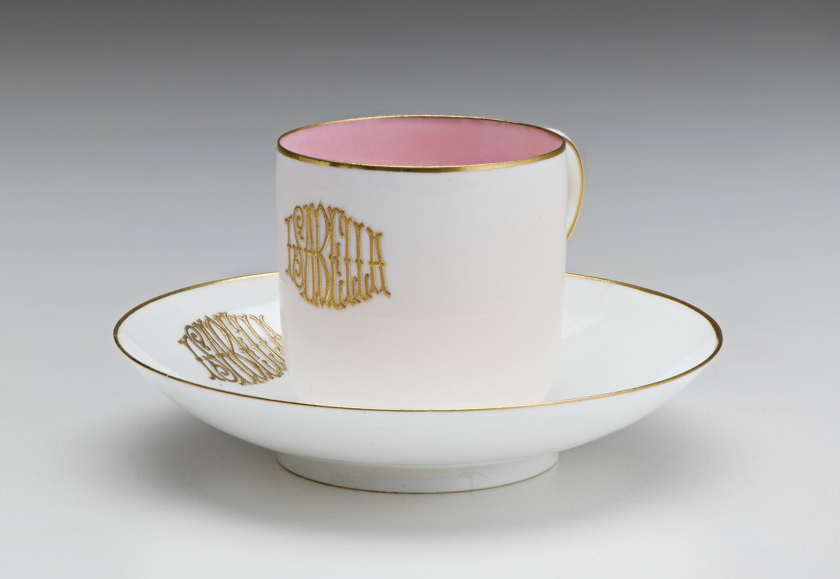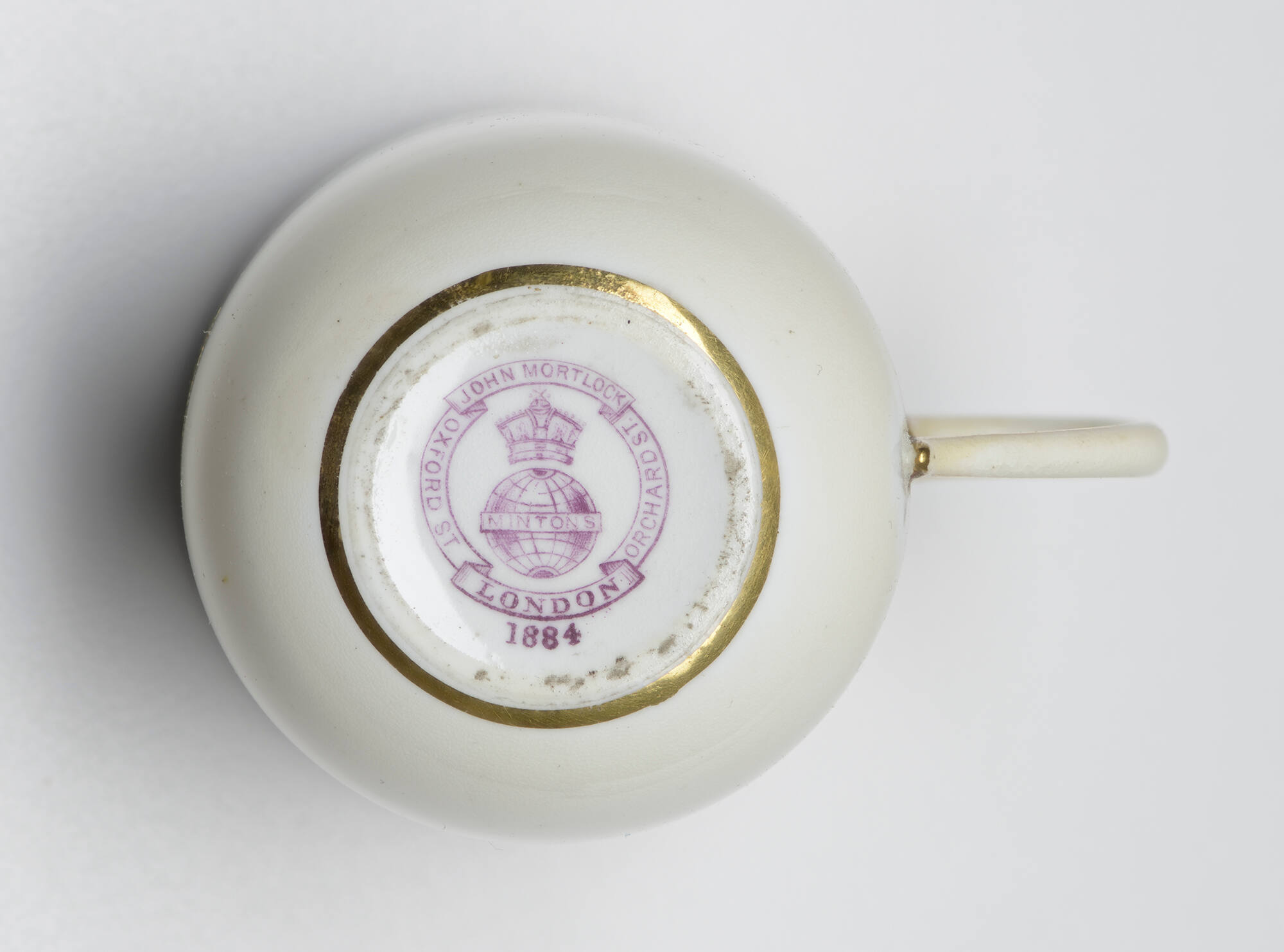 Created in 1884 in England, this cup and saucer were manufactured and sold by two prominent ceramics companies, both of which are marked on the underside of the cup. They were made by the Mintons Ceramic Manufactury; founded in Staffordshire, England, Mintons was an independent business from 1793-1968 and a leader in ceramic design. The cup and saucer are made from bone china, a type of porcelain composed of bone ash, feldspathic material, and kaolin, known for both its strength and delicate appearance. Attempting to create Chinese hard-paste porcelain, English potters in the mid-eighteenth century instead created bone china, which quickly became a popular alternative. Although created by the Mintons Ceramic Manufactory, the cup and saucer were sold by John Mortlock, one of the most important china retailers in England in the early nineteenth century.