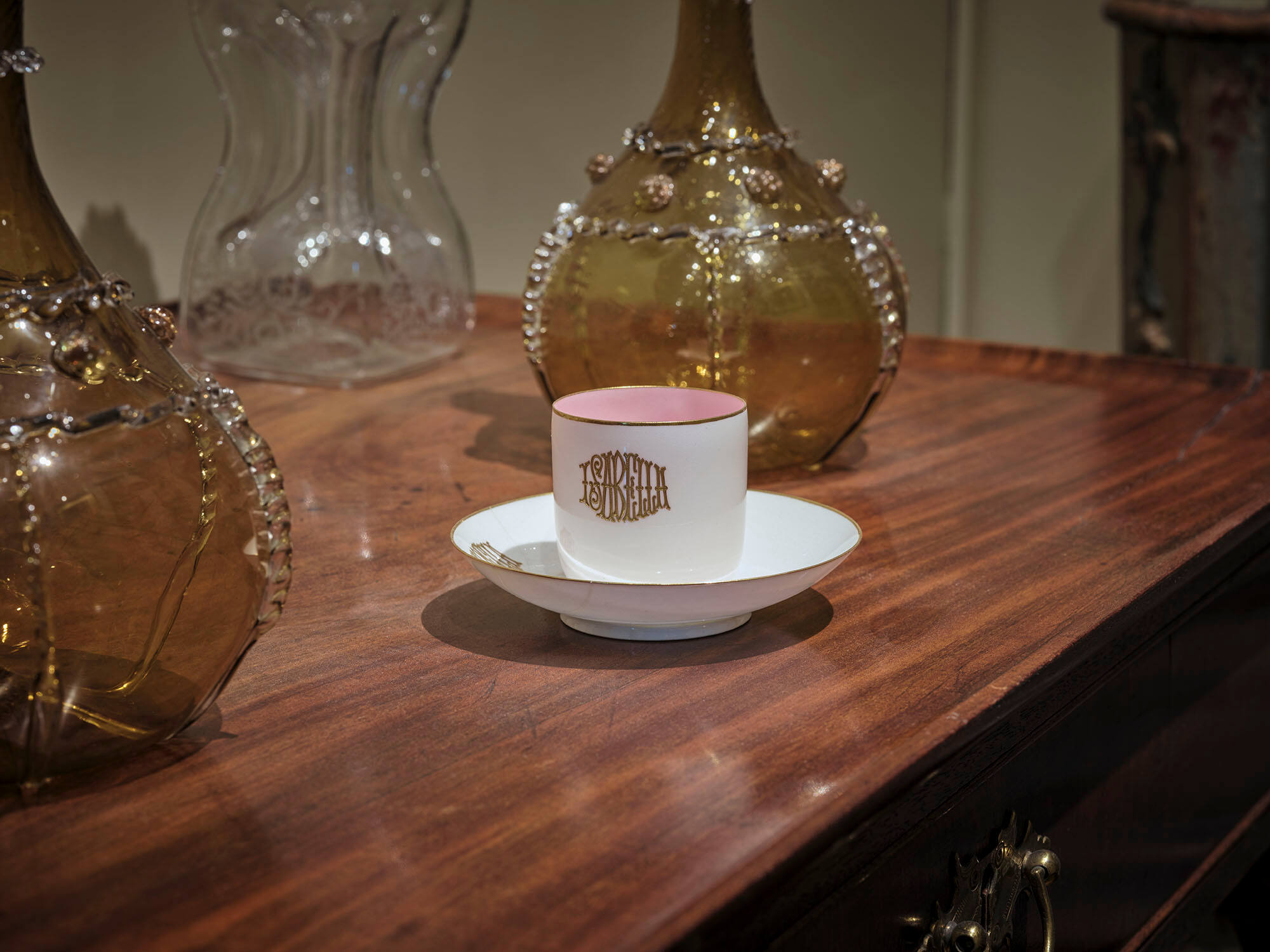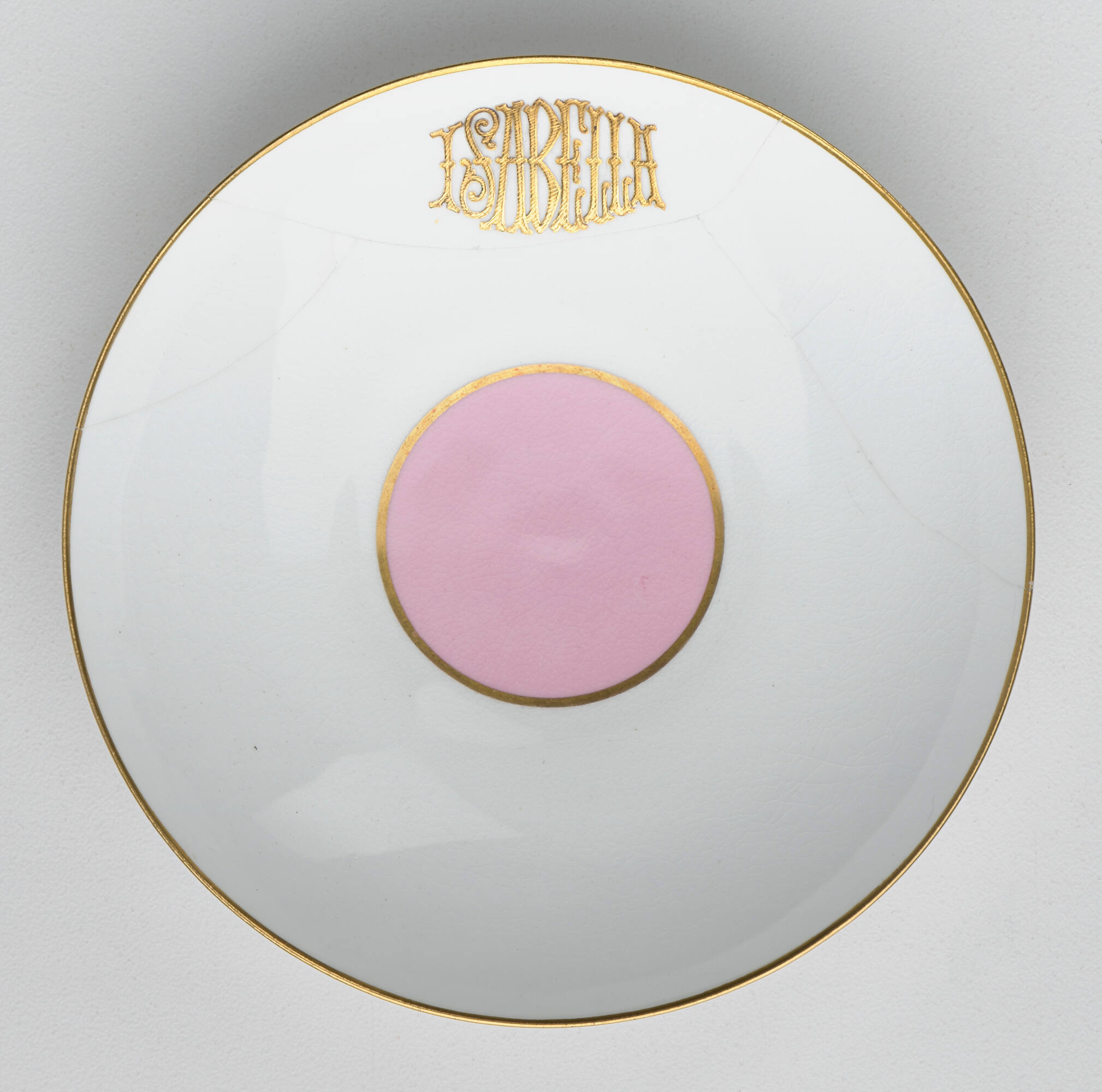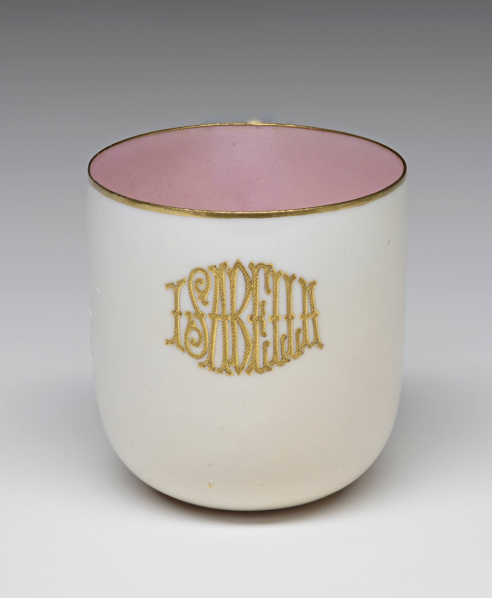 Created in 1884 in England, this cup and saucer were manufactured and sold by two prominent ceramics companies, both of which are marked on the underside of the cup. They were made by the Mintons Ceramic Manufactury; founded in Staffordshire, England, Mintons was an independent business from 1793-1968 and a leader in ceramic design. The cup and saucer are made from bone china, a type of porcelain composed of bone ash, feldspathic material, and kaolin, known for both its strength and delicate appearance. Attempting to create Chinese hard-paste porcelain, English potters in the mid-eighteenth century instead created bone china, which quickly became a popular alternative. Although created by the Mintons Ceramic Manufactory, the cup and saucer were sold by John Mortlock, one of the most important china retailers in England in the early nineteenth century.