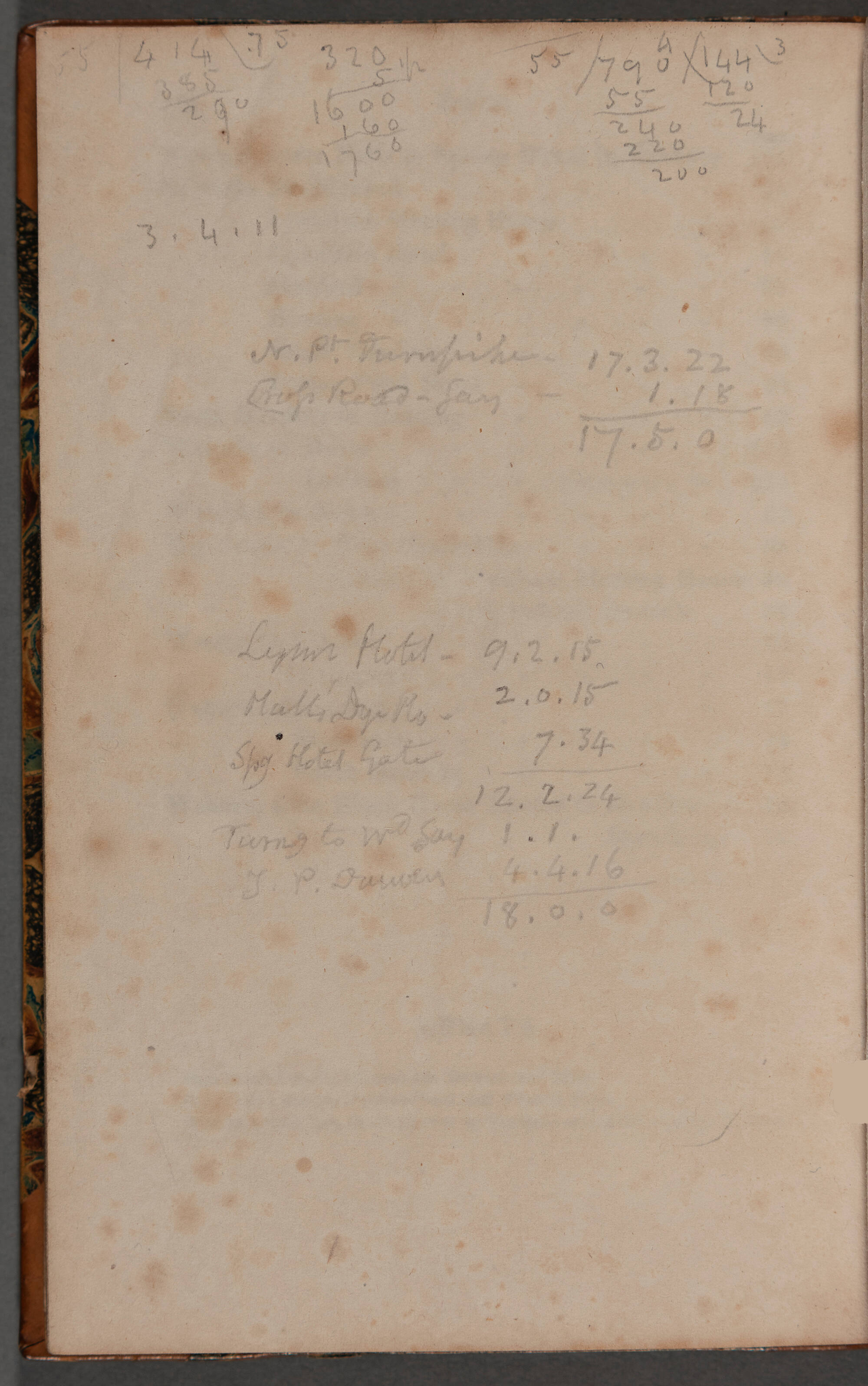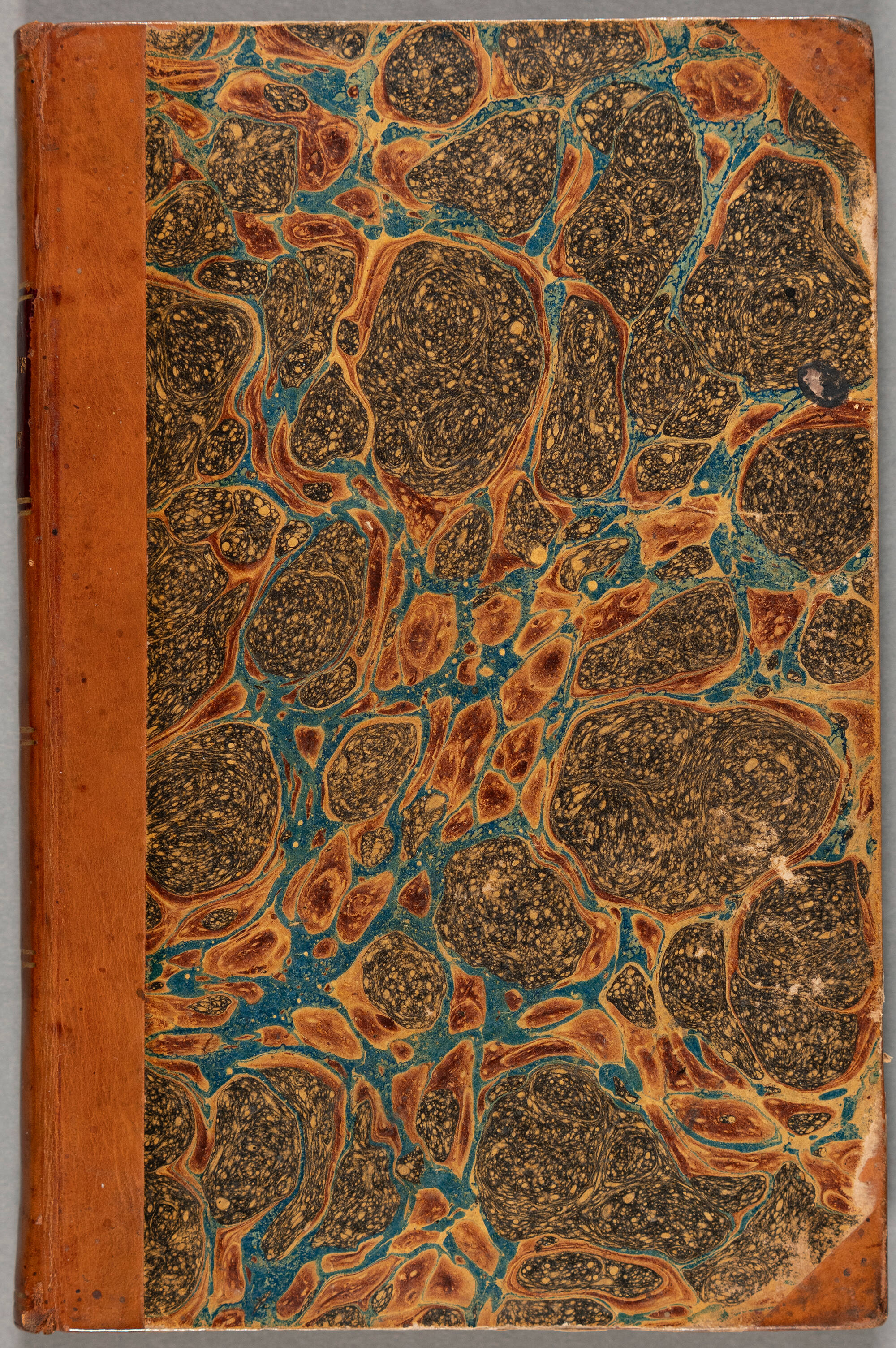 half-bound with brown leather; marbled board; gilt stamped lettering on spine