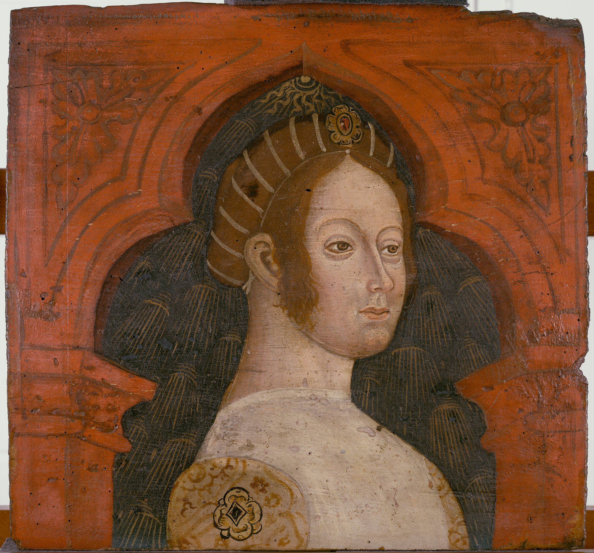 This panel and thirty-seven others in the Gardner's collection (museum nos. P30c2.1-38) likely decorated a ceiling in the castle, inserted in an inclined position along its support beams. The four coats of arms (museum nos. P30c2.2, .8, .25, and .30), however, were probably placed in the corners of the room, and it is possible that the other panels lined the upper walls of the room, much like their modern installation in the Gardner Museum's Gothic Room.