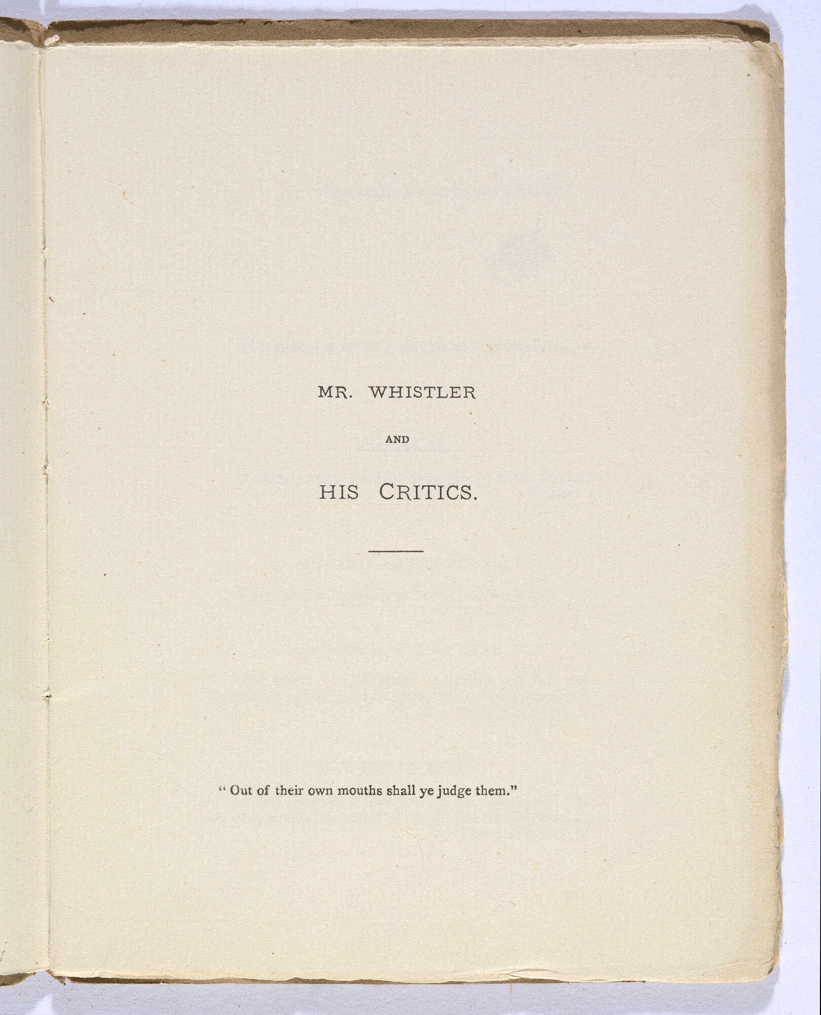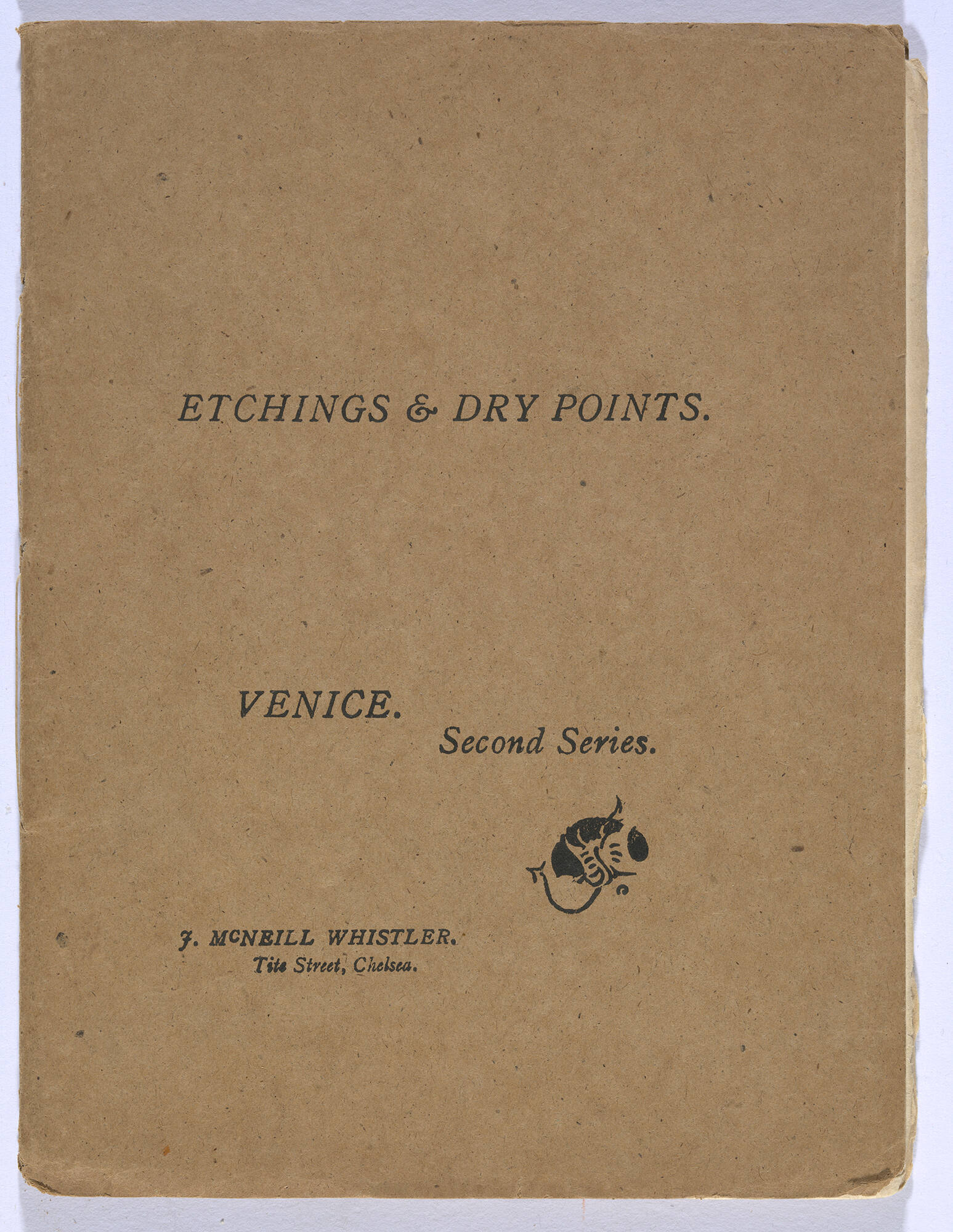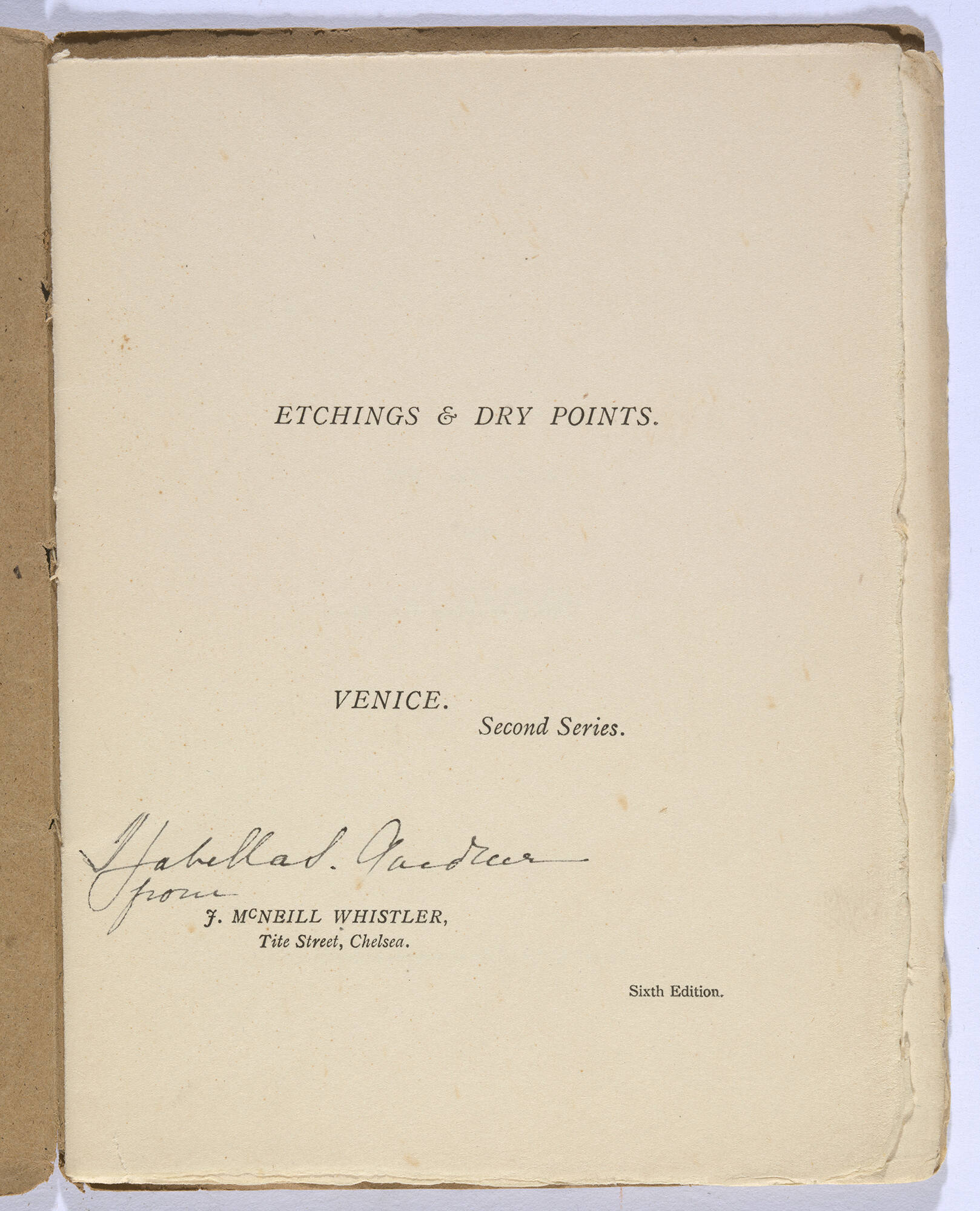 James McNeill Whistler composed this catalogue to accompany the publication of his second series of etchings and dry points of Venice. Bound in brown paper and stamped with his signature butterfly, the pamphlet wryly describes works in the series with derogatory excerpts from the critical press. Isabella Stewart Gardner included this book in her own catalogue, A Choice of Books from the Library of Isabella Stewart Gardner, in 1906.