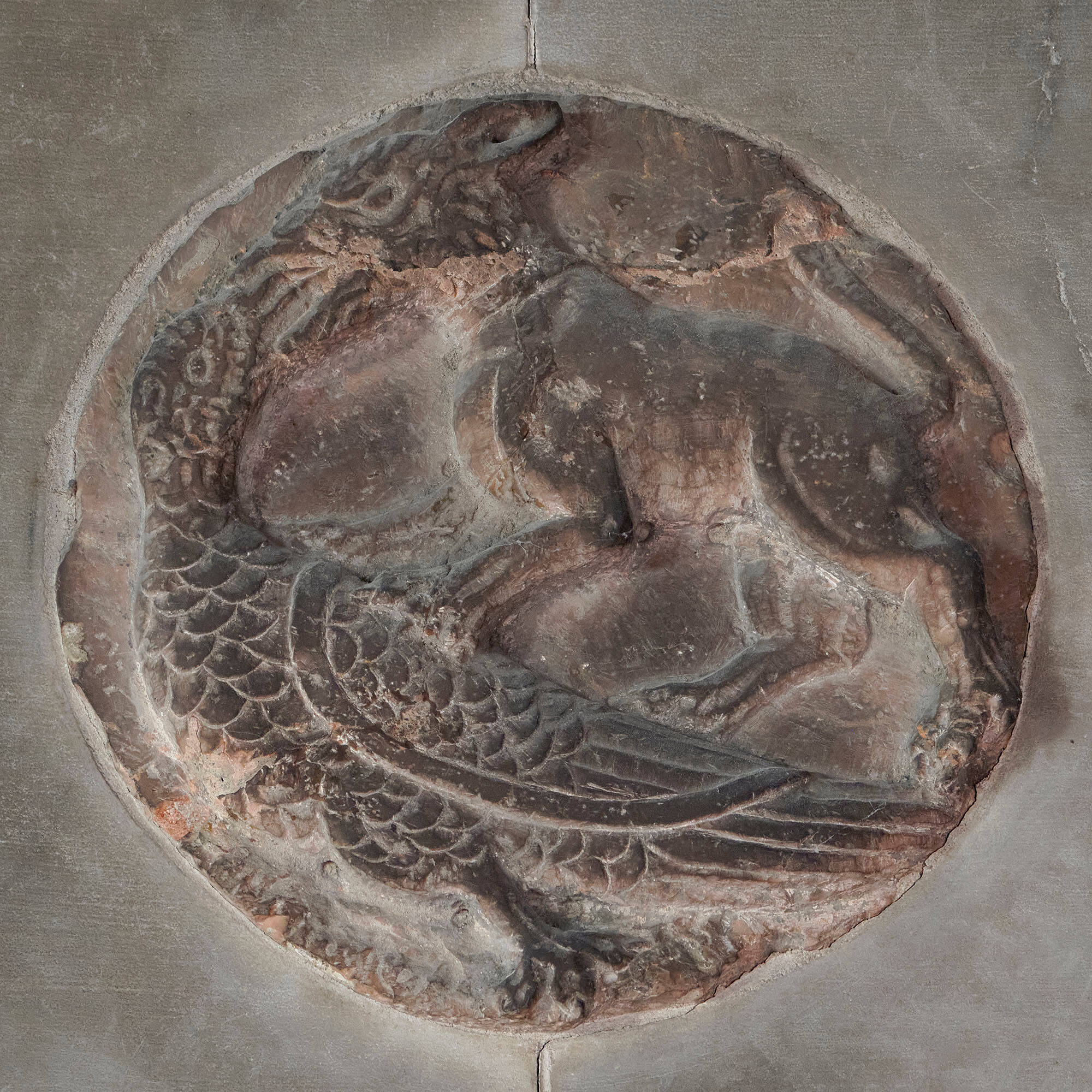 Beginning in September of 1897, Isabella Stewart Gardner purchased many pieces of Venetian relief sculpture and architectural elements in anticipation of the creation of her museum. These purchases included many marble medallions or 'paterae.' These medallions were all purchased in Venice, the majority coming from the dealers Francesco Dorigo and Moisé dalla Torre and several more from art dealers Antonio Marcato and Dino Barozzi. Gardner installed at least one of her medallions in the Conservatory at Green Hill, her home in Brookline, by about 1900, and 38 were installed in the Courtyard of Fenway Court by 1902. Four additional medallions were installed in the west wall of her Gothic Room on the third floor of the museum. These were possibly purchased with the facade that houses them from Moisé dalla Torre, Venice for 1,800 lire on 26 September 1899.
