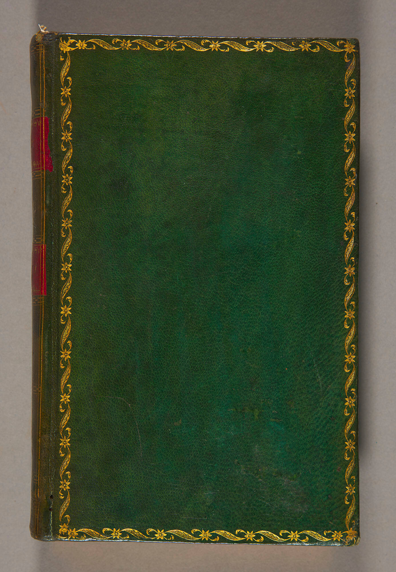 Green leather binding with gilded border around boards and tooled and gilded lettering and decoration on spine