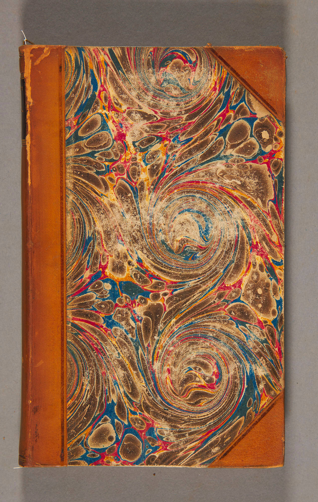Three-quarters bound: marbled paper boards, light brown spine and corners. Gilded lettering on spine.