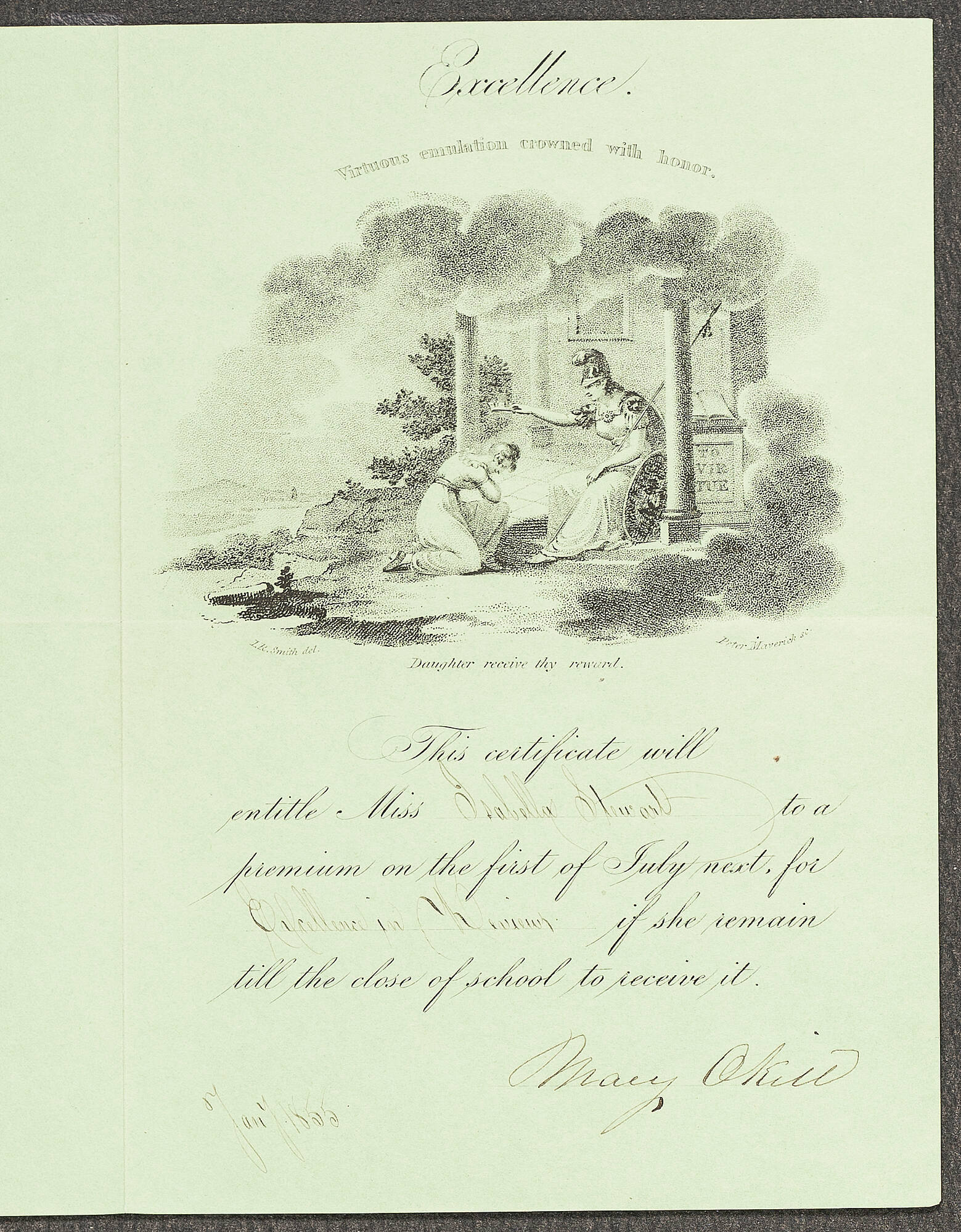 Inscribed in ink (underneath illustration): This certificate will / entitle Miss I. Stewart to a / premium on the first of July next, for / Six Perfect Weeks if she remain / till the close of school to receive it. / Mary Okill / January 1855