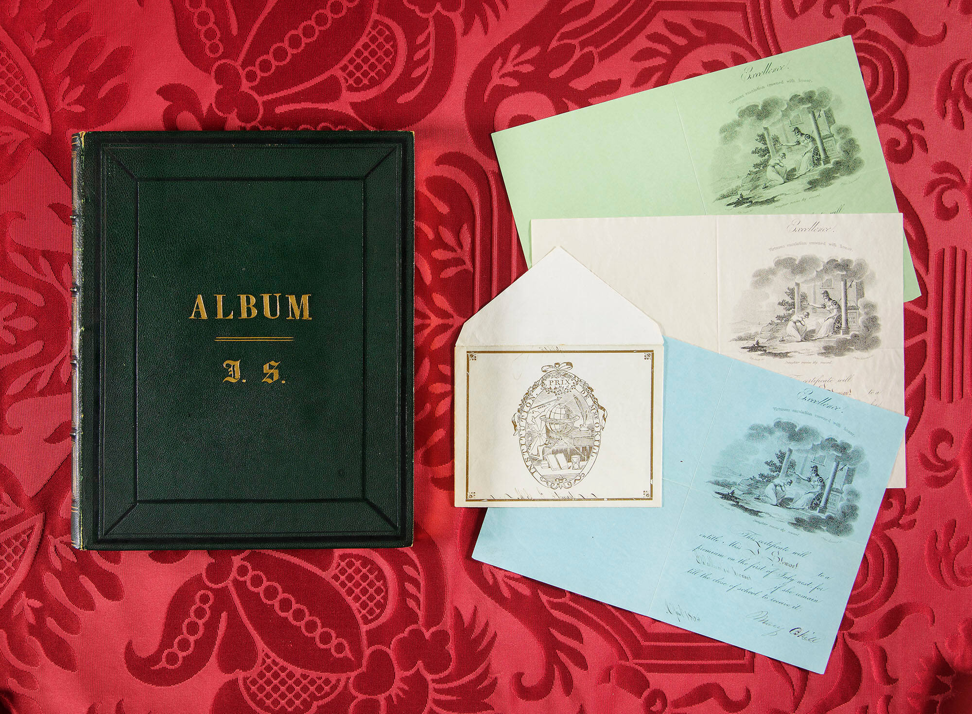 Reticent when asked about her childhood, Isabella Stewart Gardner nevertheless saved a number of books, albums, and paper ephemera as relics of her youth. She retained several certificates like this one from the school run by Miss Okill in New York City. A rebellious student by her own admission, young Belle Gardner was awarded a “premium” “if she remain till the close of school to receive it.”