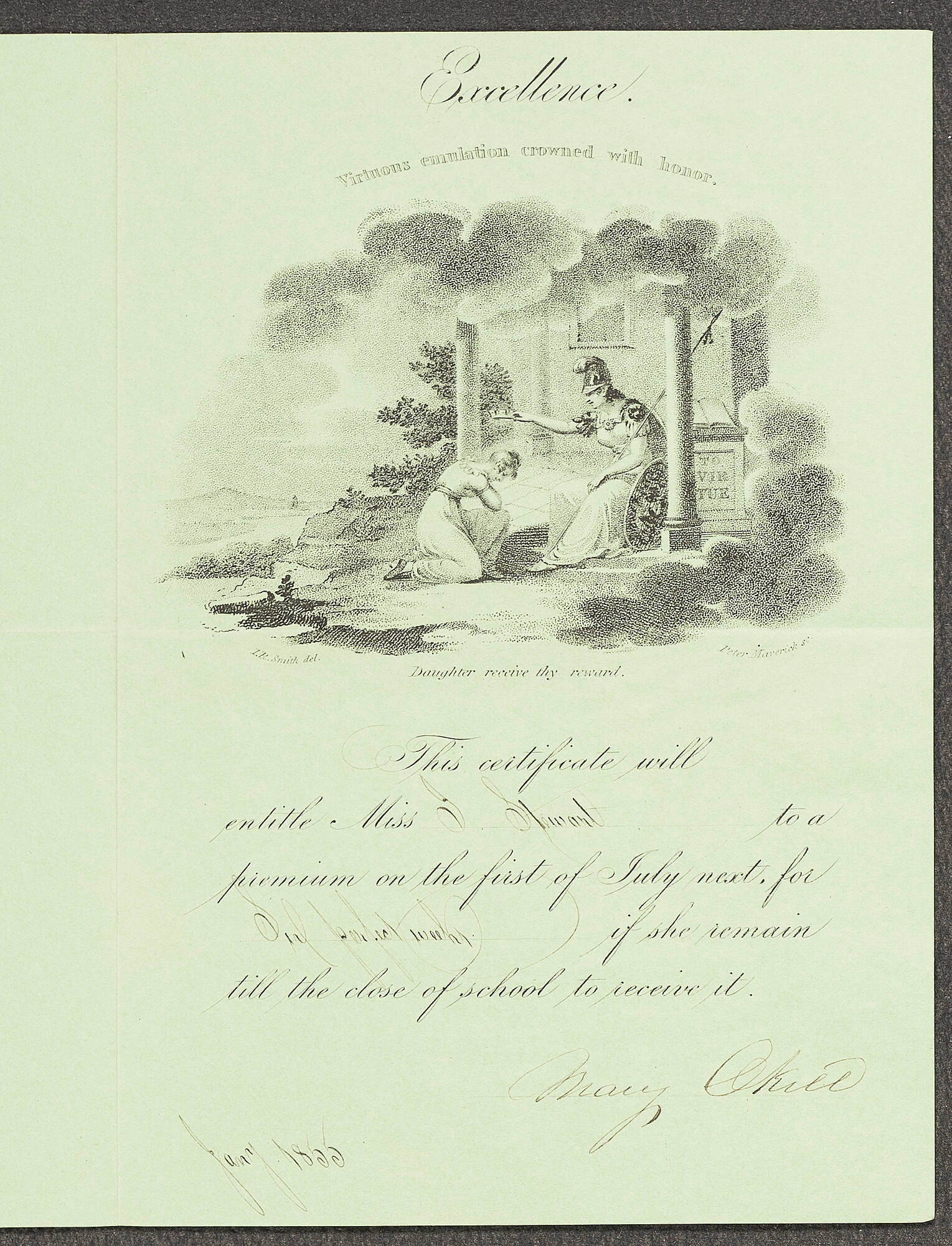 Mary Okill - Certificate of Excellence, January 1855