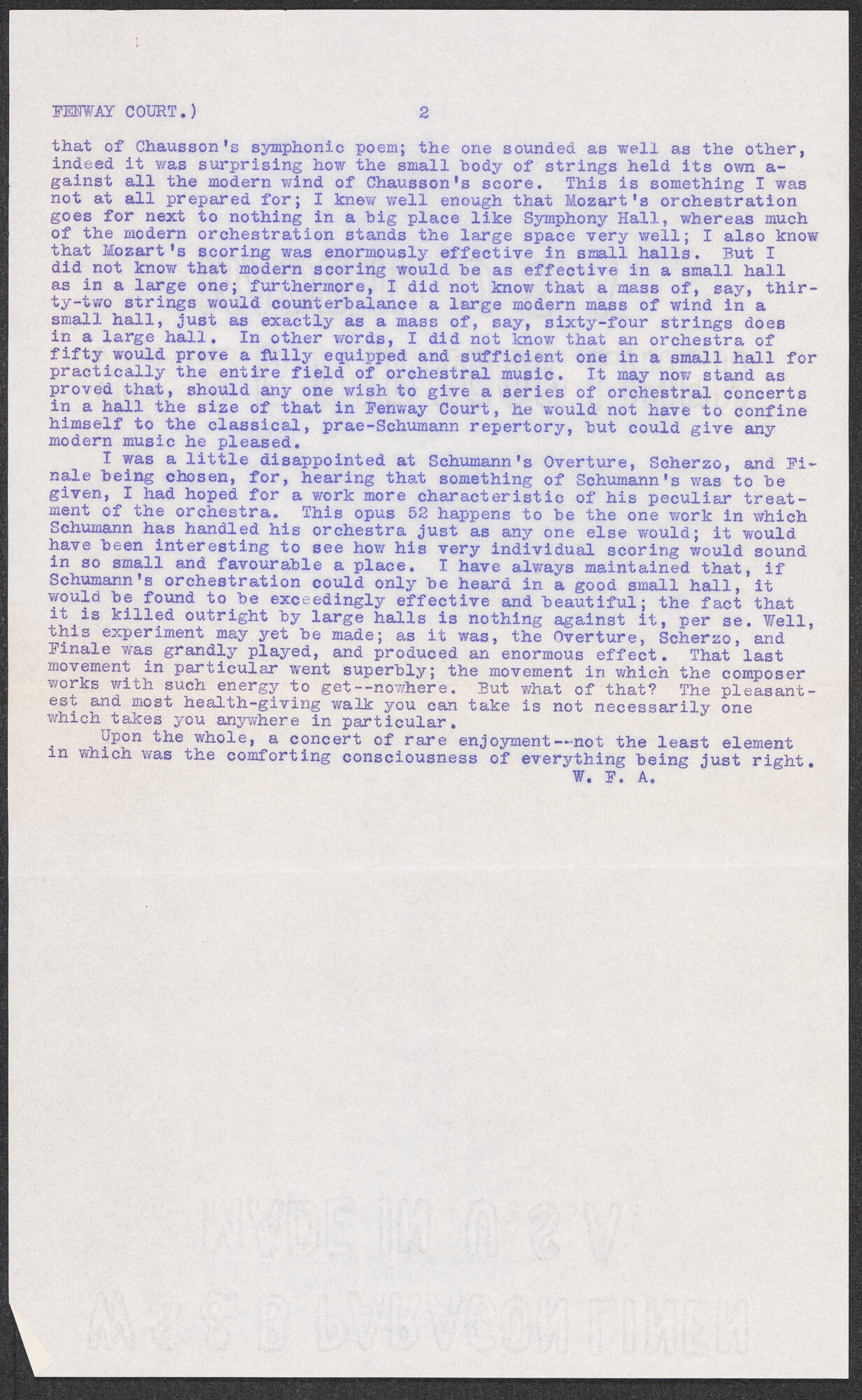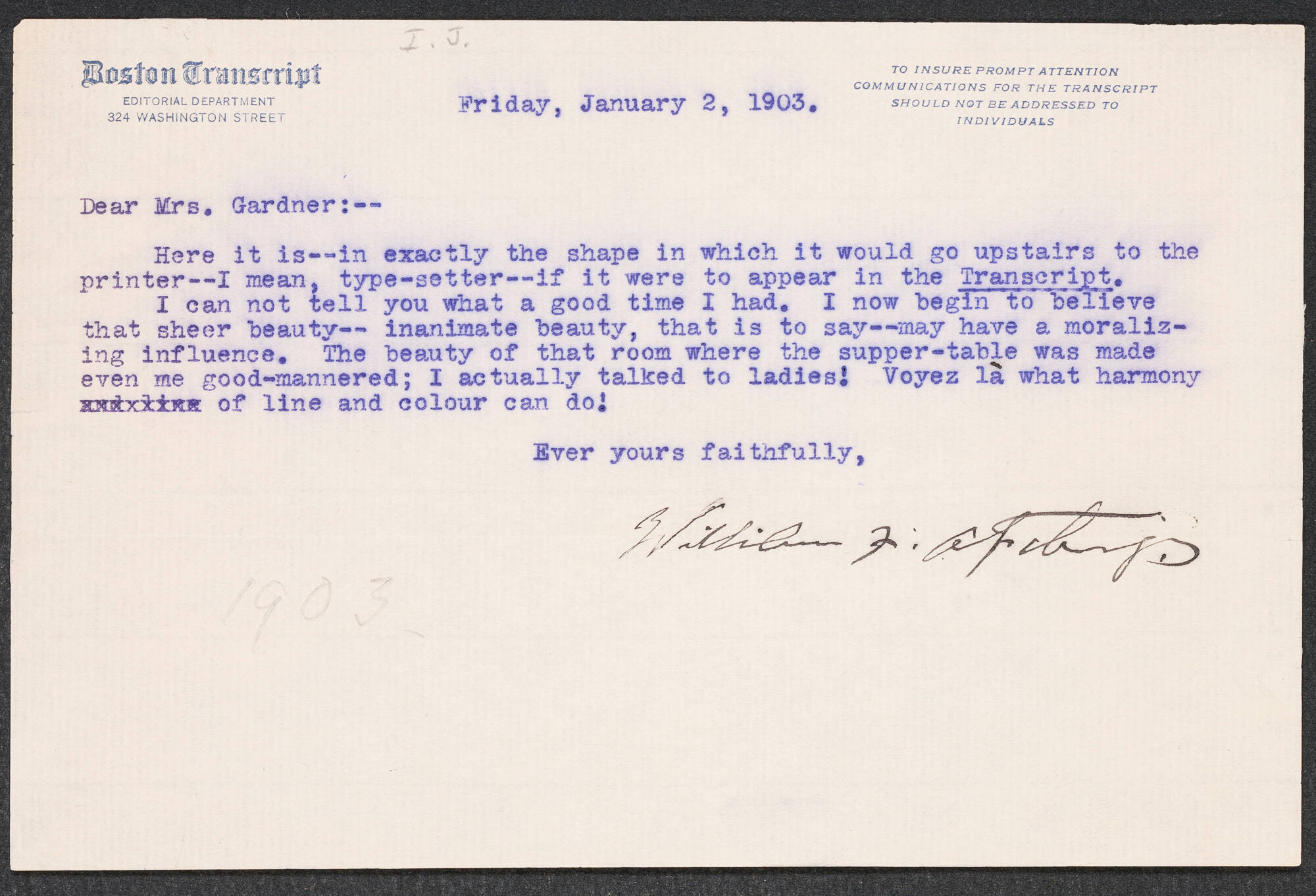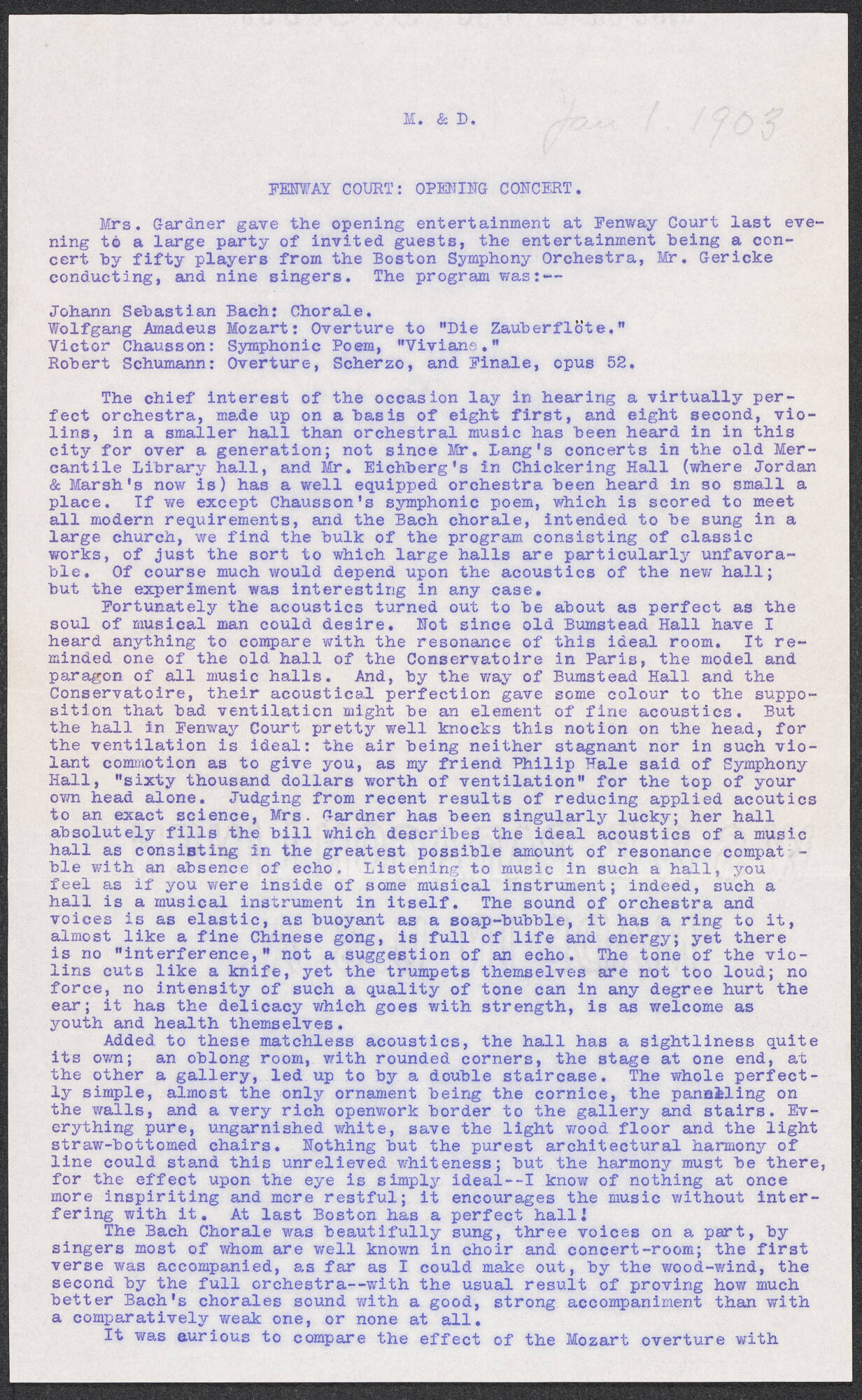 Letter to Isabella Stewart Gardner from Boston with Final Draft of Article About the First Concert "Fenway Court: Opening Concert"