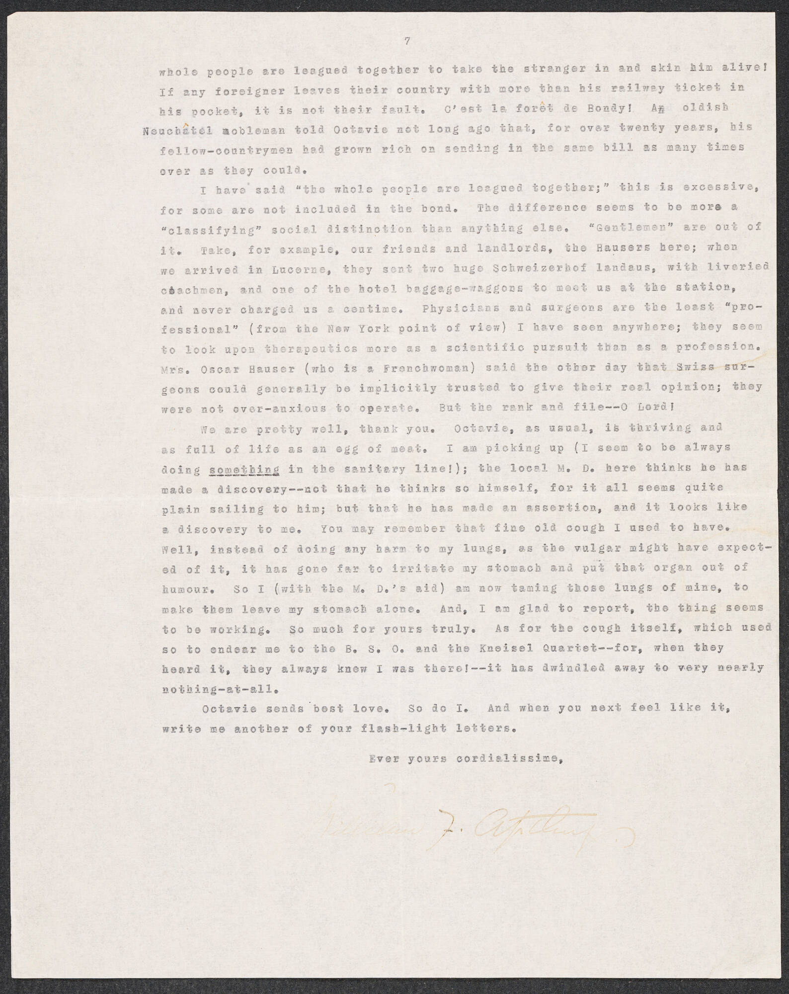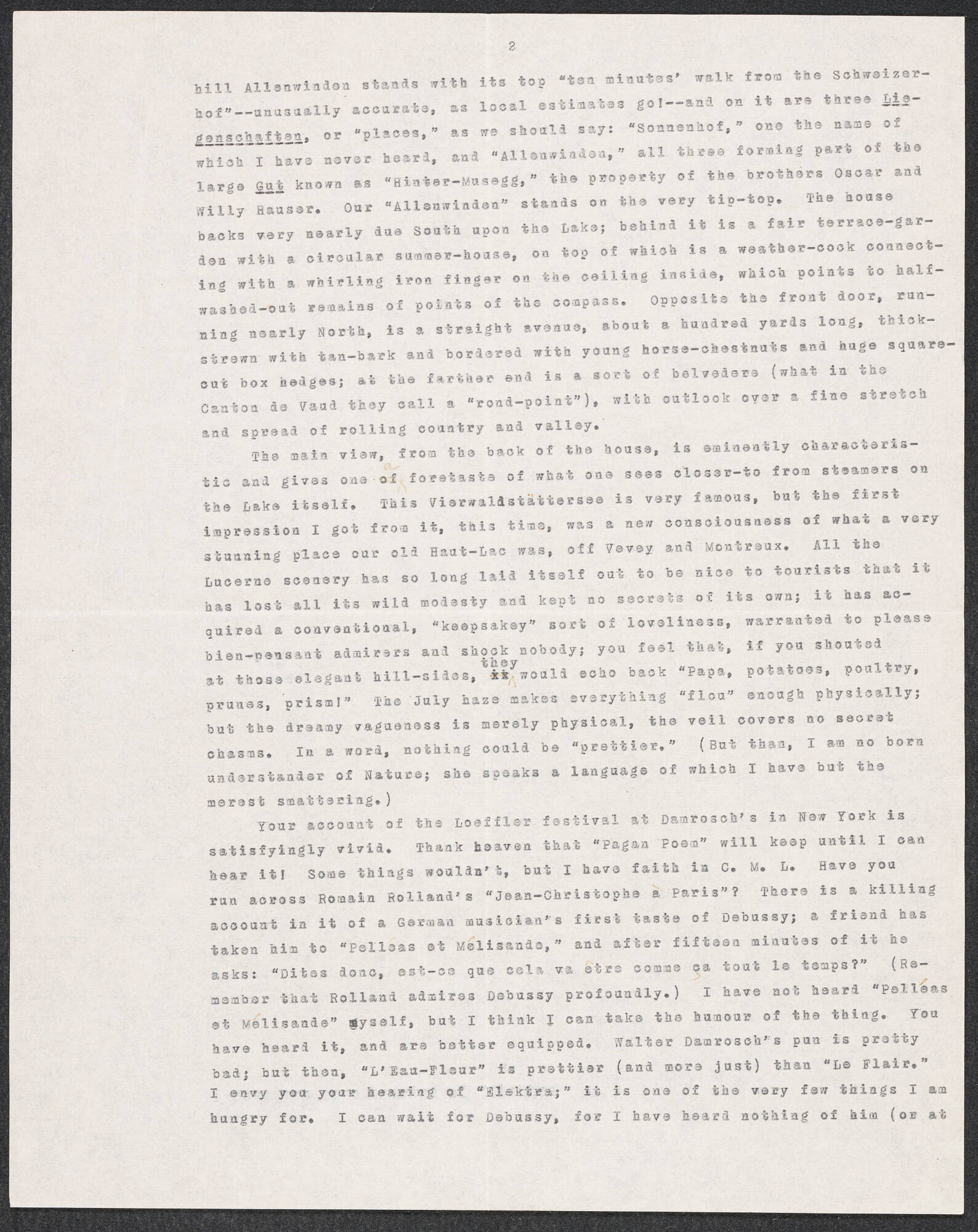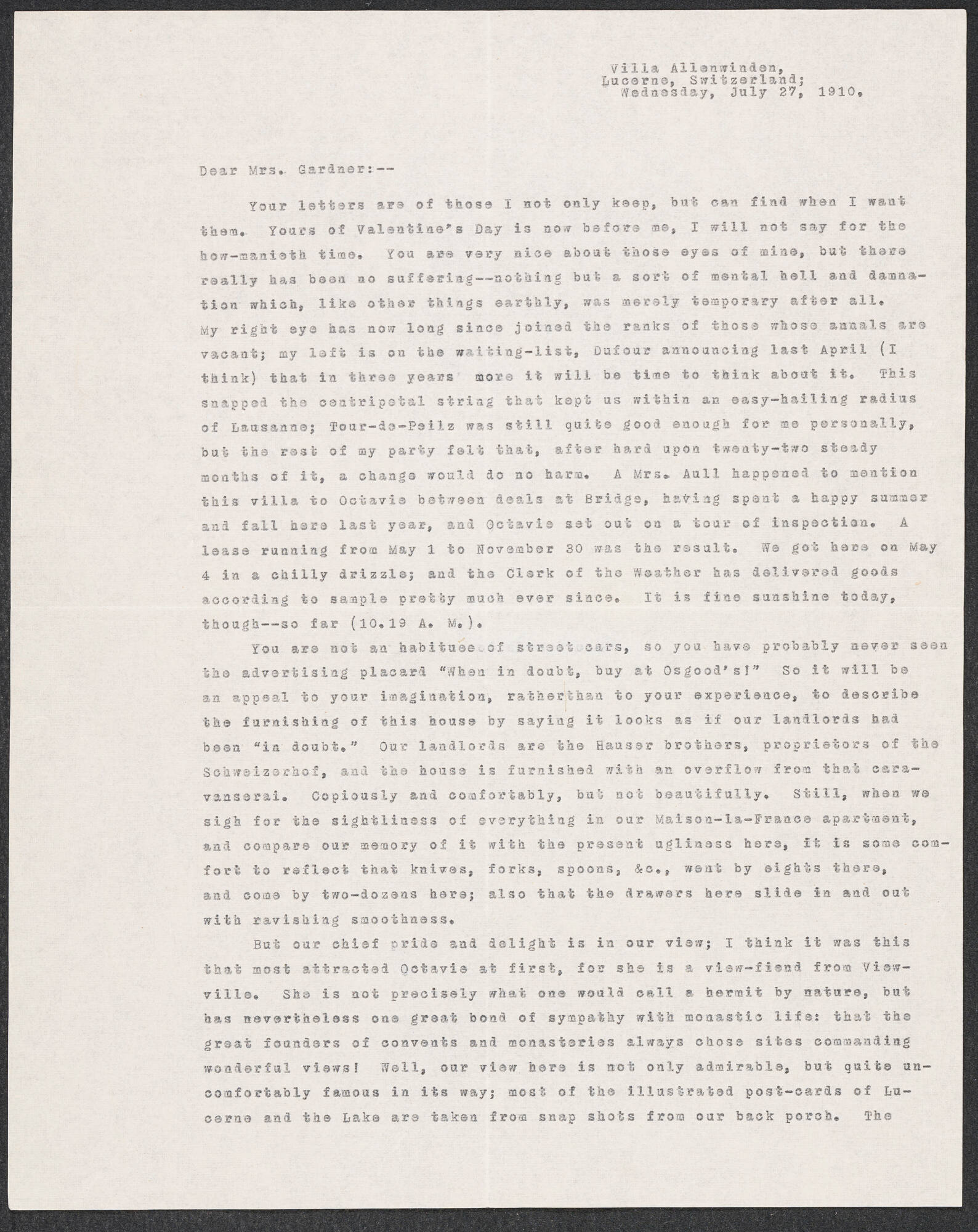 Letter to Isabella Stewart Gardner from Villa Allenwinden, Lucerne, Switzerland