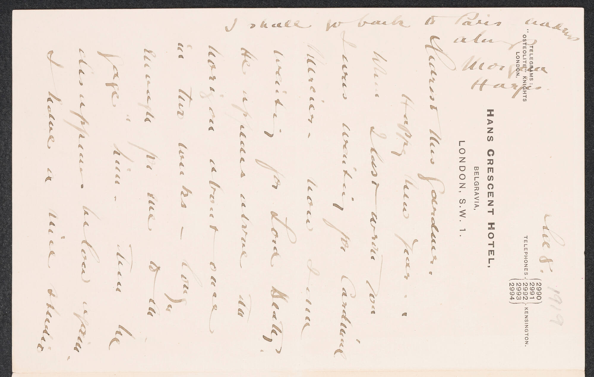 Stationery printed: Hans Crescent Hotel, / Belgravia / London, S.W.1 /...