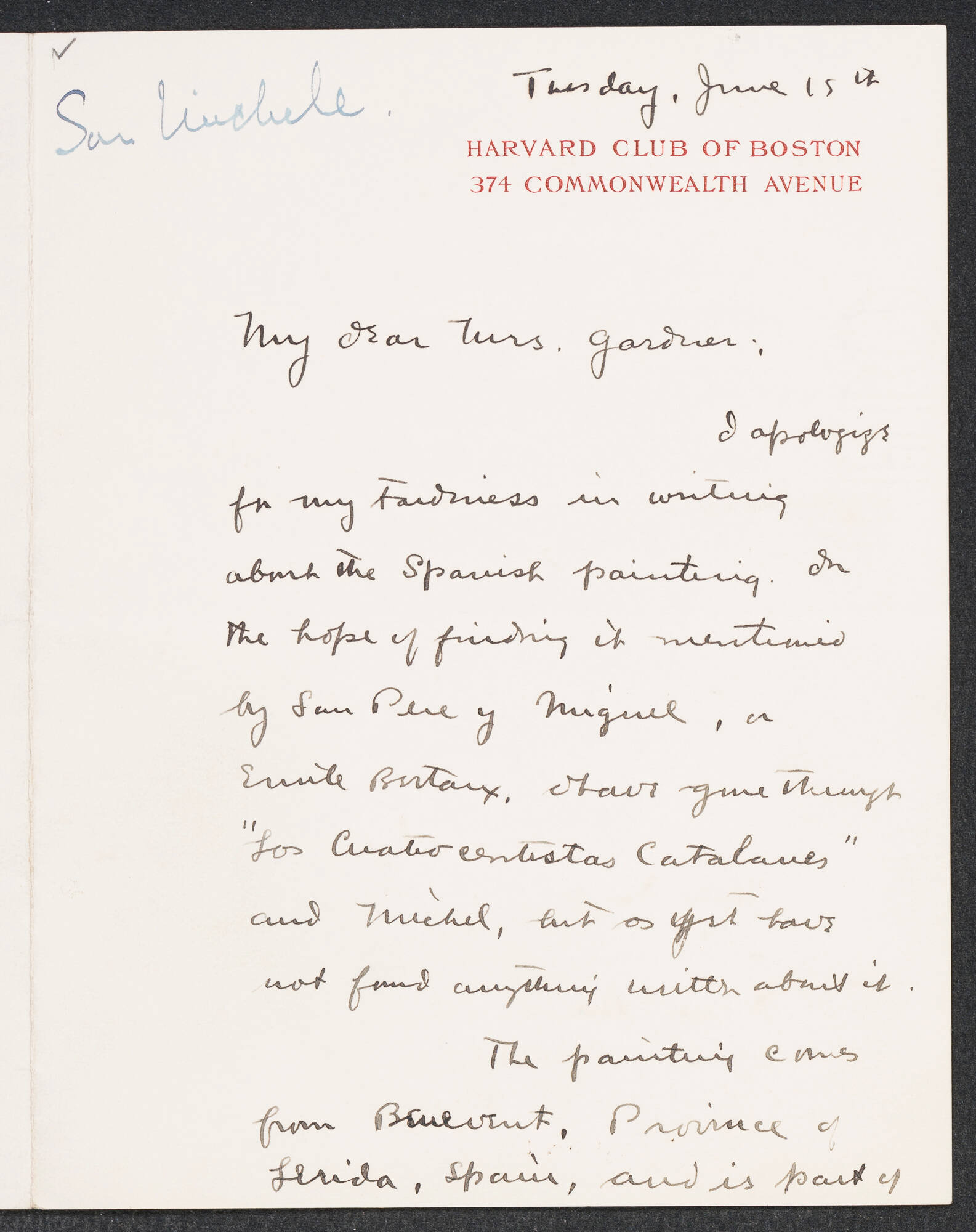 Inscribed in ink in the hand of Isabella Stewart Gardner (upper left): San Michele
