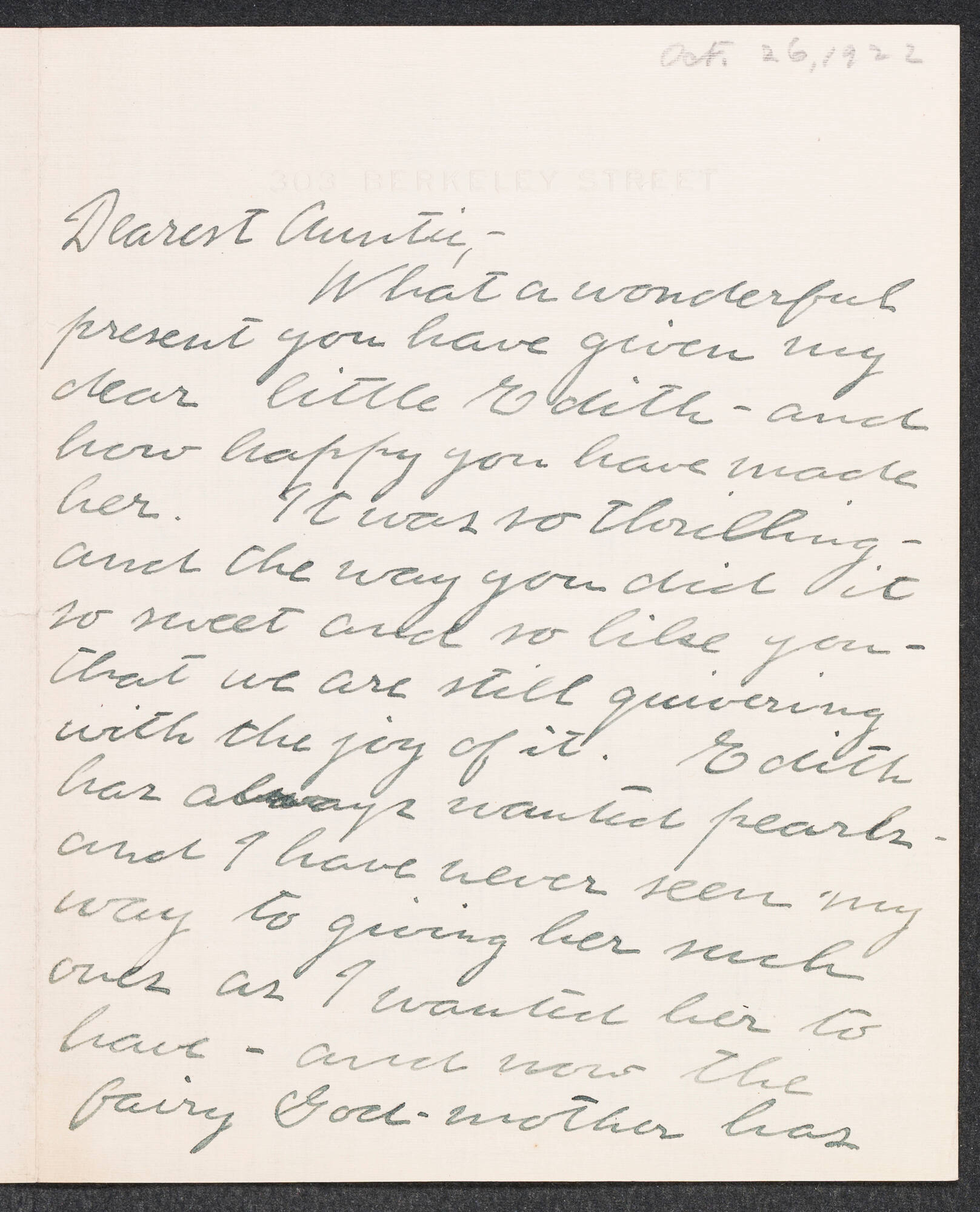 Letter to Isabella Stewart Gardner from 303 Berkeley Street, Boston