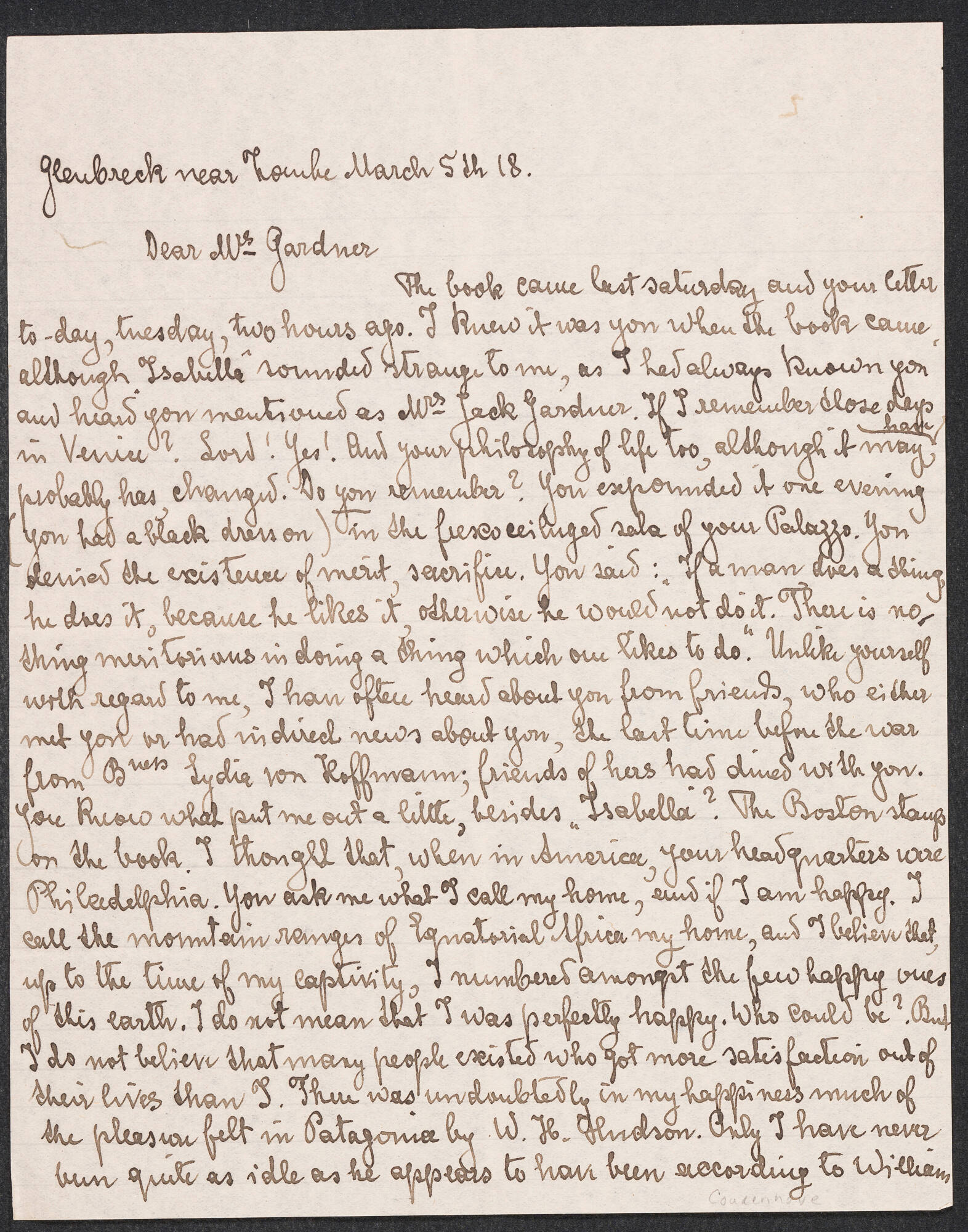 Letter to Isabella Stewart Gardner from Glenbreck Estate, Zomba, Nyasaland Protectorate [Malawi]
