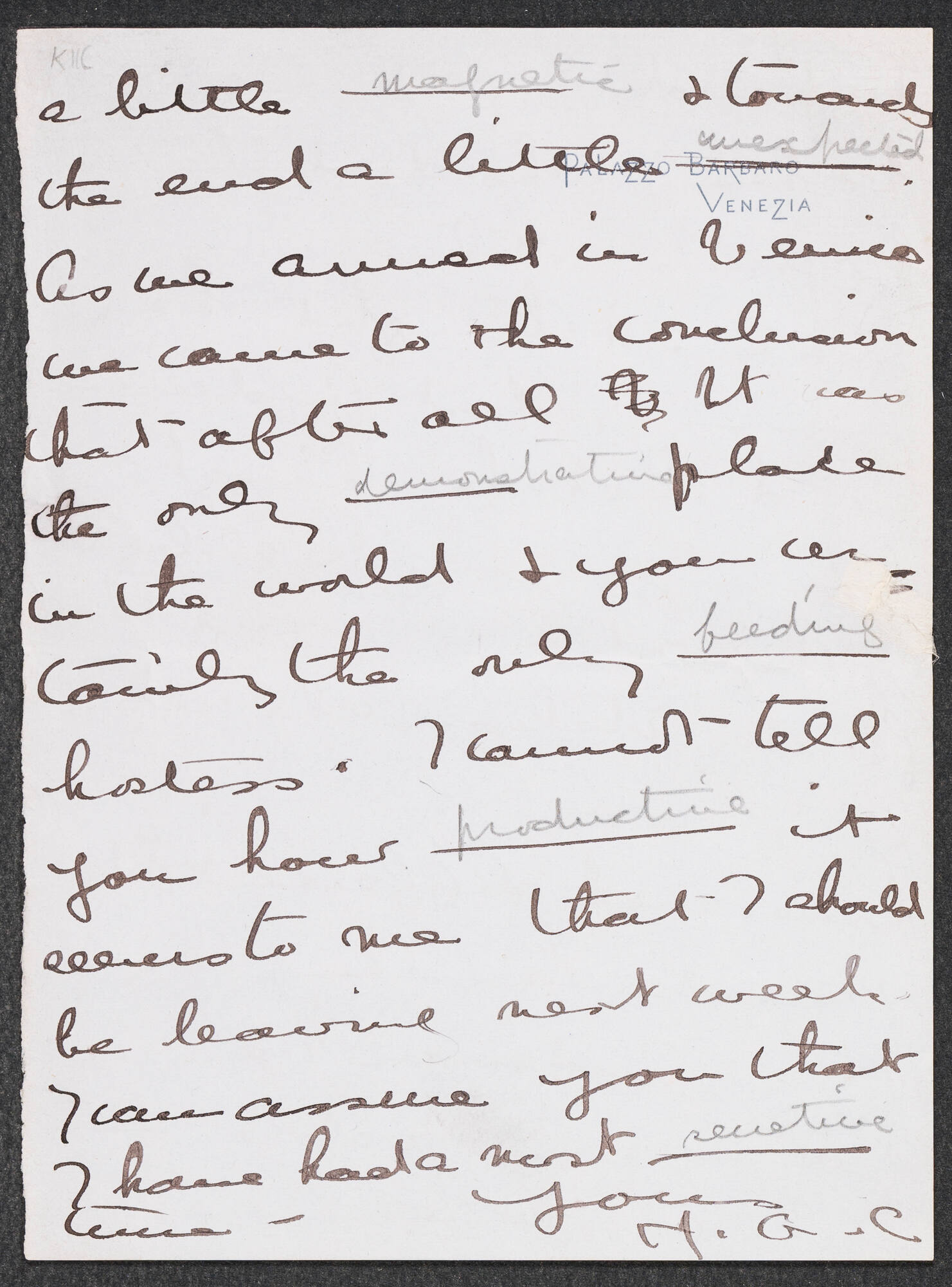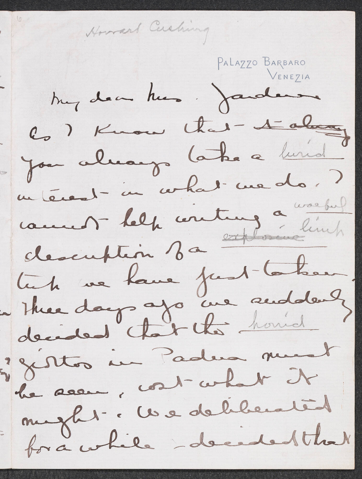 Letter to Isabella Stewart Gardner from Palazzo Barbaro, Venice