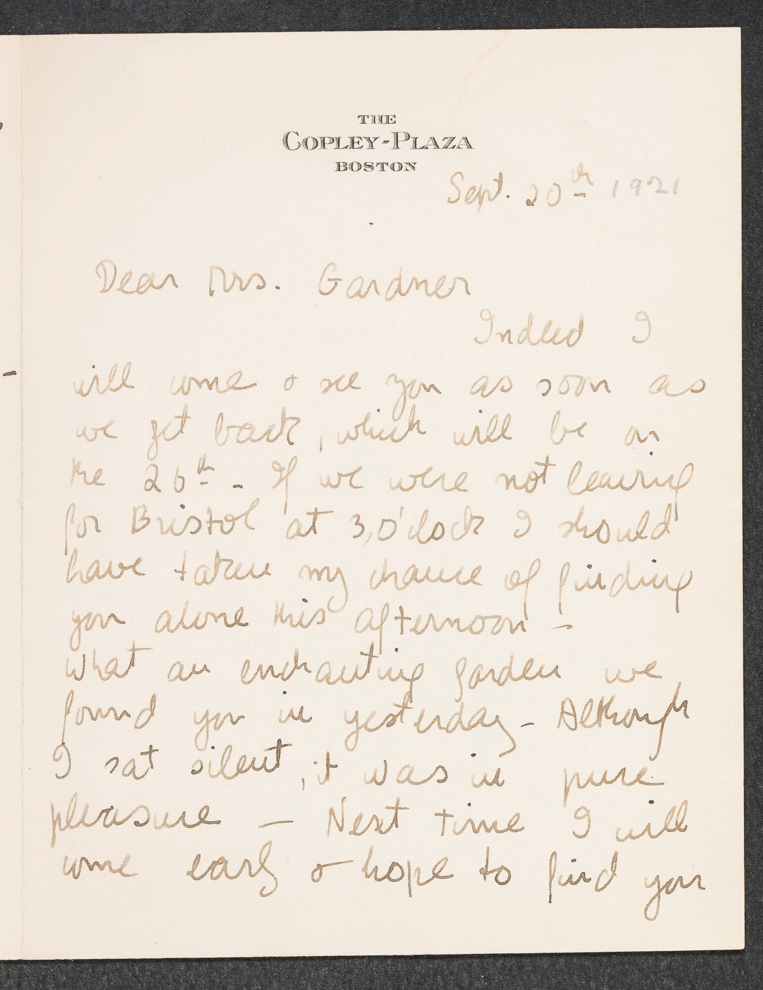Letter to Isabella Stewart Gardner from the Copley Plaza, Boston, 21 September 1921