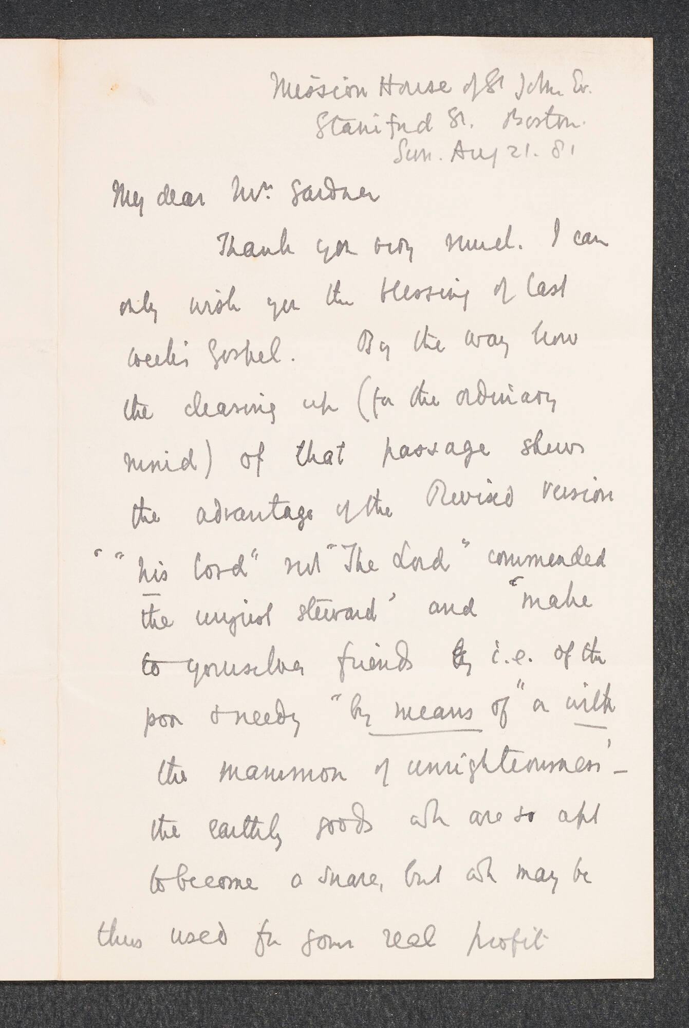 Letter to Isabella Stewart Gardner from the Mission House of Saint John the Evangelist, Staniford Street, Boston