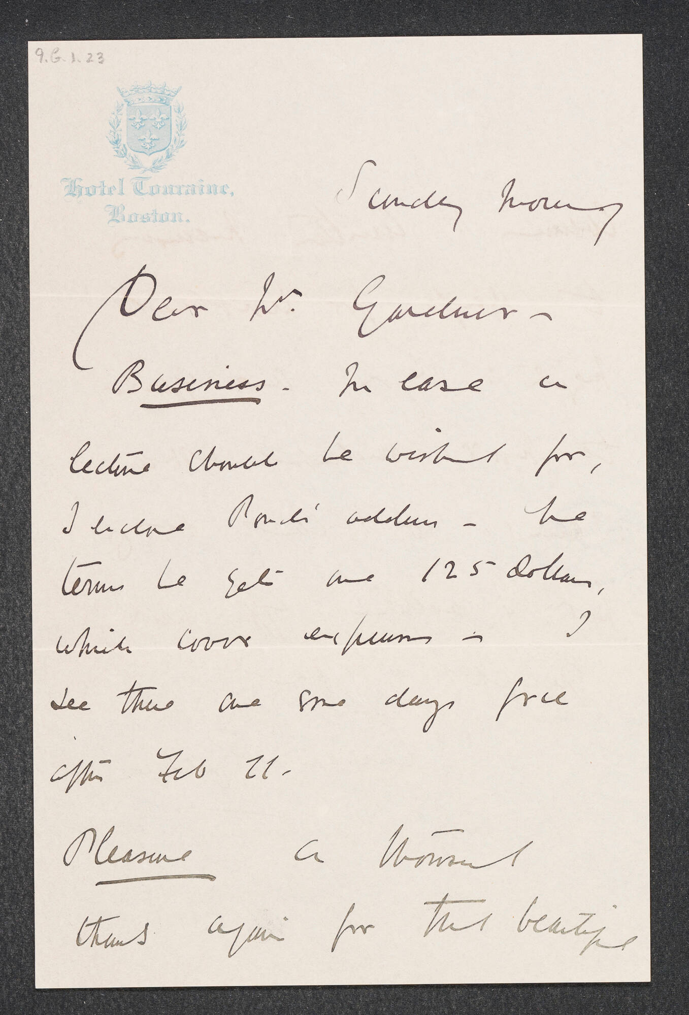 Letter to Isabella Stewart Gardner from Hotel Touraine, Boston