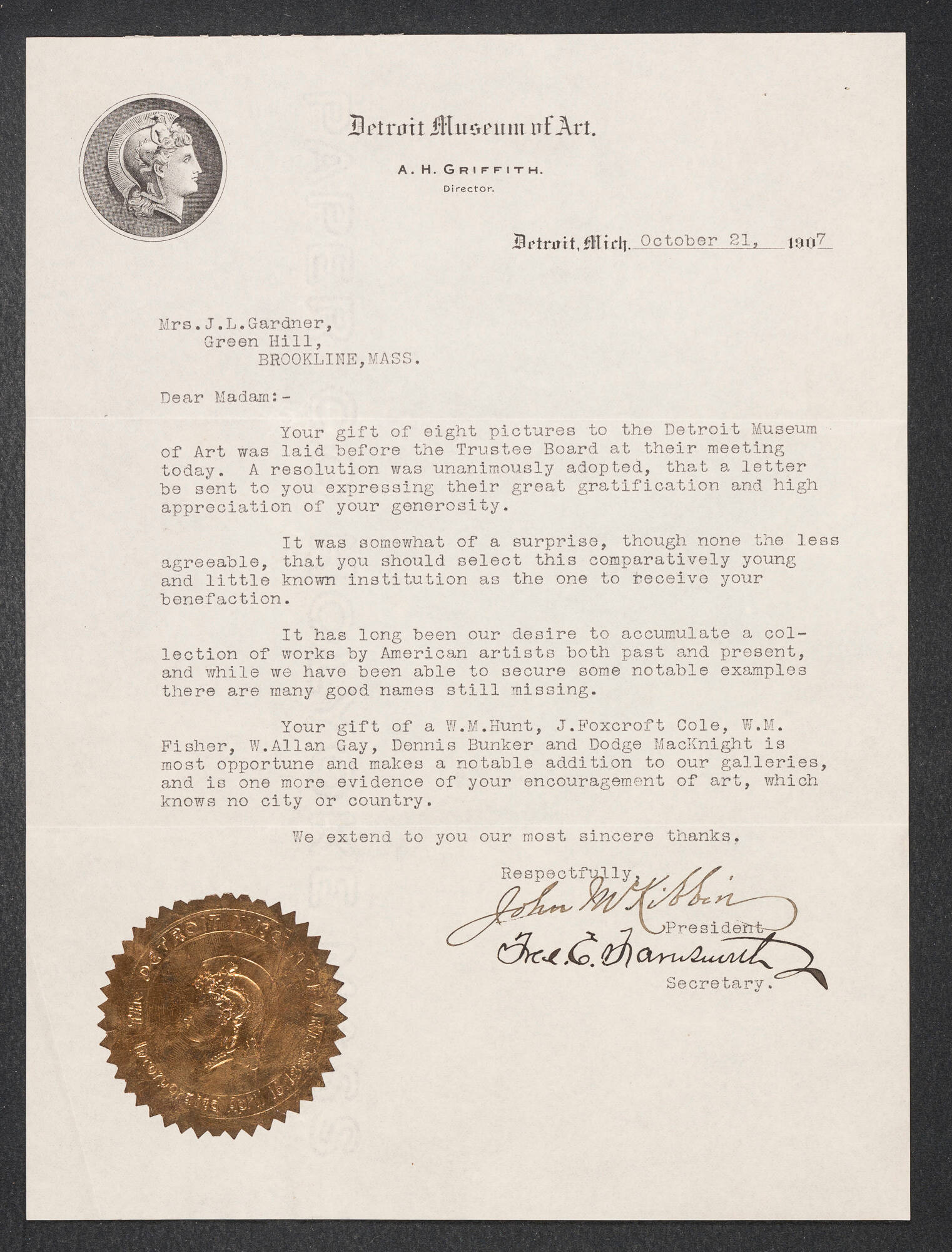 Letter to Isabella Stewart Gardner from Detroit Museum of Art, Detroit, 21 October 1907
