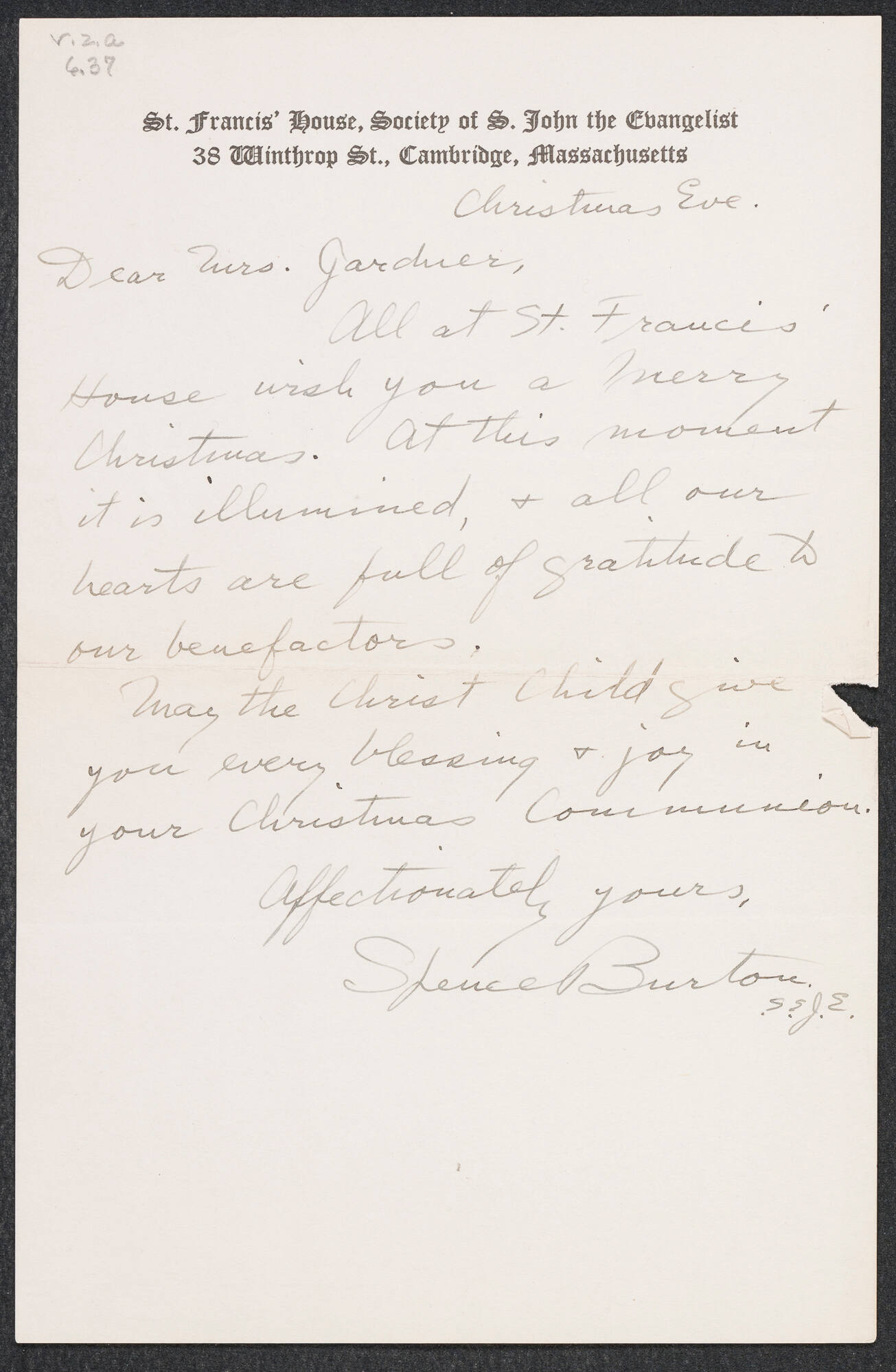 Letter to Isabella Stewart Gardner from St. Francis House, Society of S. John the Evangelist, 38 Winthrop Street, Cambridge, Massachusetts