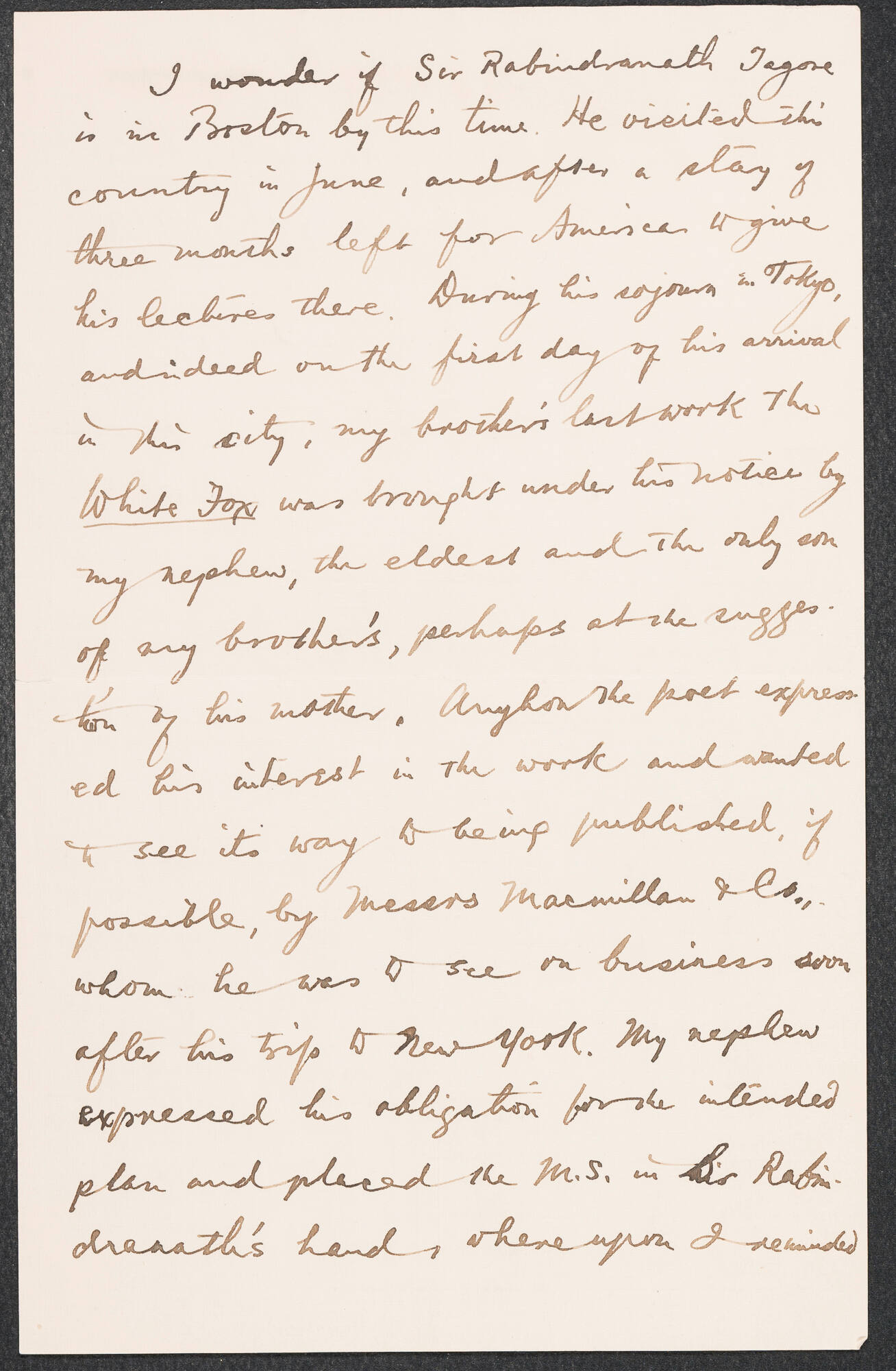Art historian and philosopher Okakura Kakuzō adapted the Japanese legend of Kuzunoha into a libretto for an opera, “The White Fox.” He dedicated it to Isabella who displayed the manuscript in the Okakura Case in the Blue Room. In this letter, Okakura’s brother Yoshisaburo informing Gardner that the polymath and Nobel laureate Rabindranath Tagore (1861–1941) wished to have the work published.