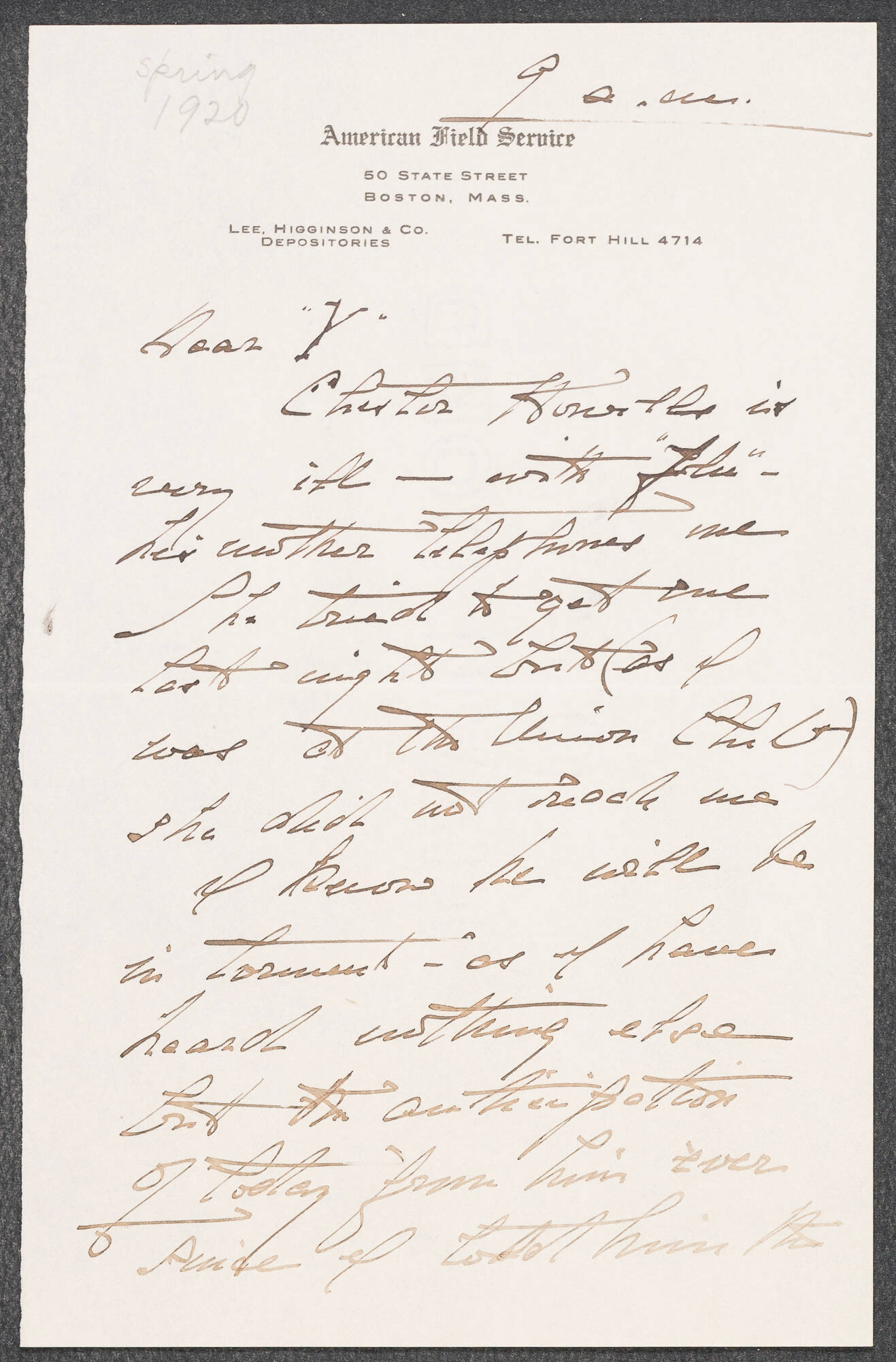 Letter to Isabella Stewart Gardner from American Field Service, 50 State Street, Boston, 1920