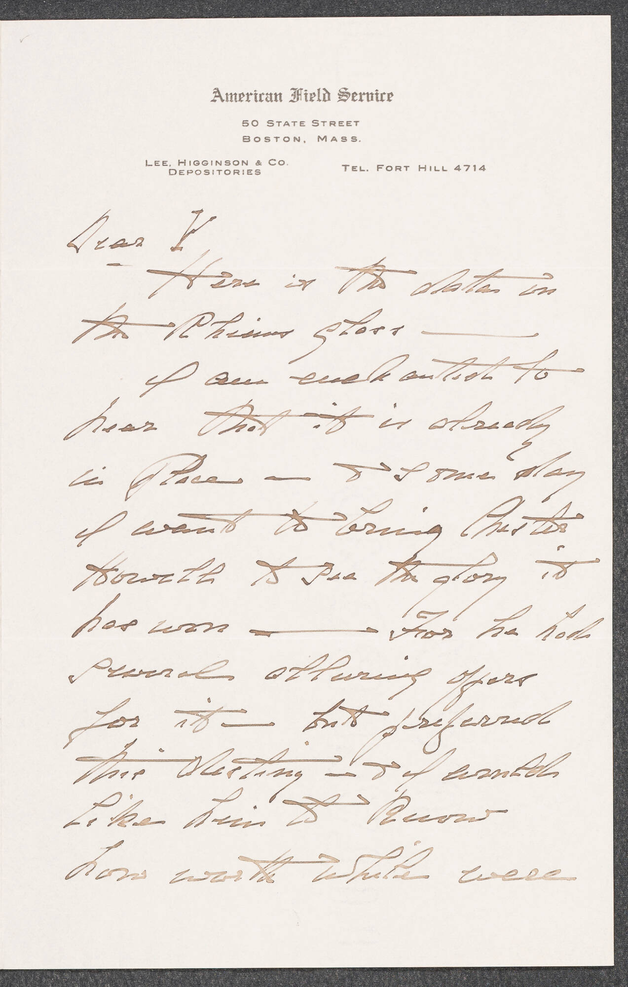 Letter to Isabella Stewart Gardner from American Field Service, 50 State Street, Boston, early 20th century