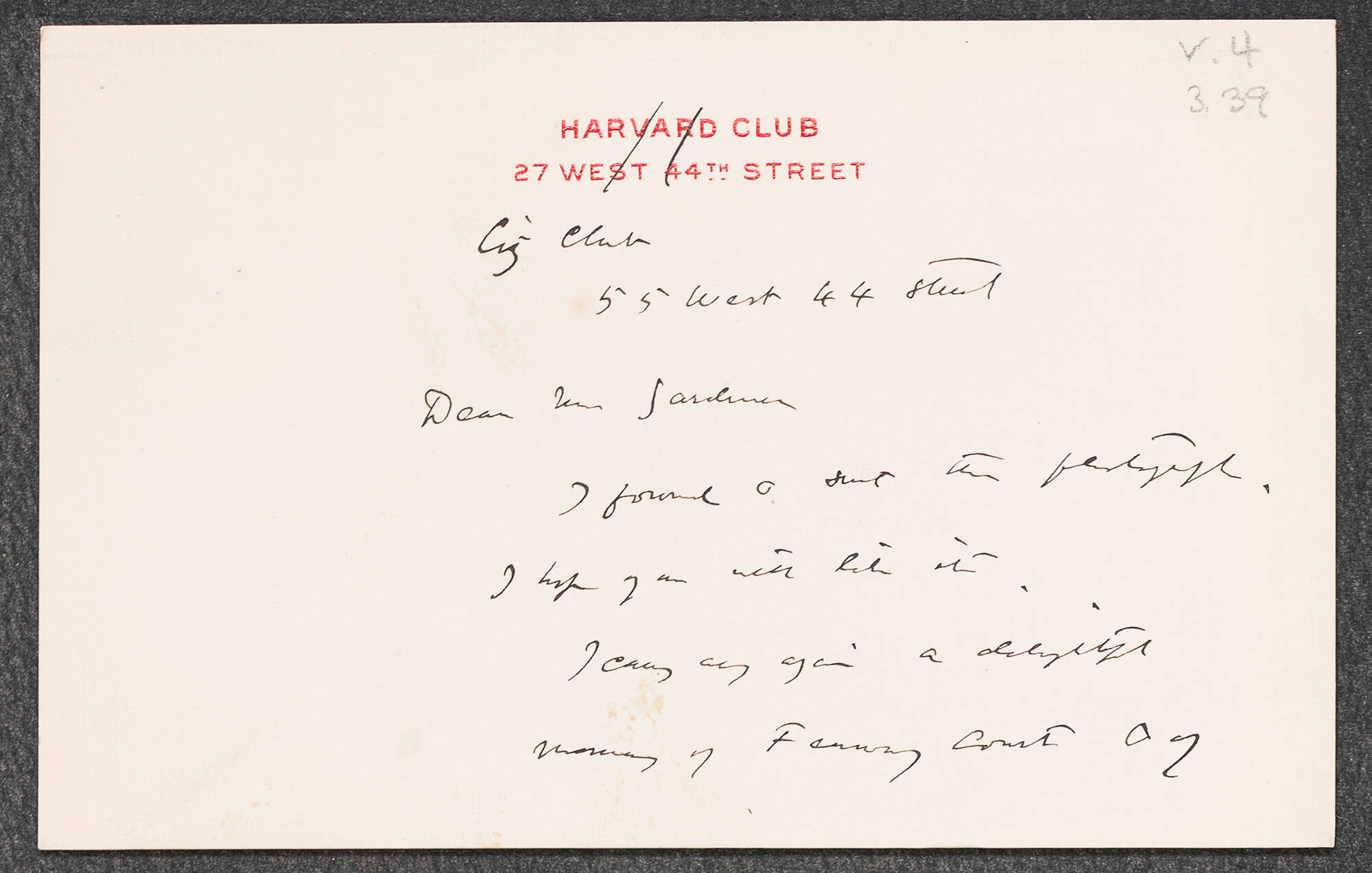 Printed in ink (on recto, upper center): [crossed out] HARVARD CLUB / 27 WEST 44th STREET