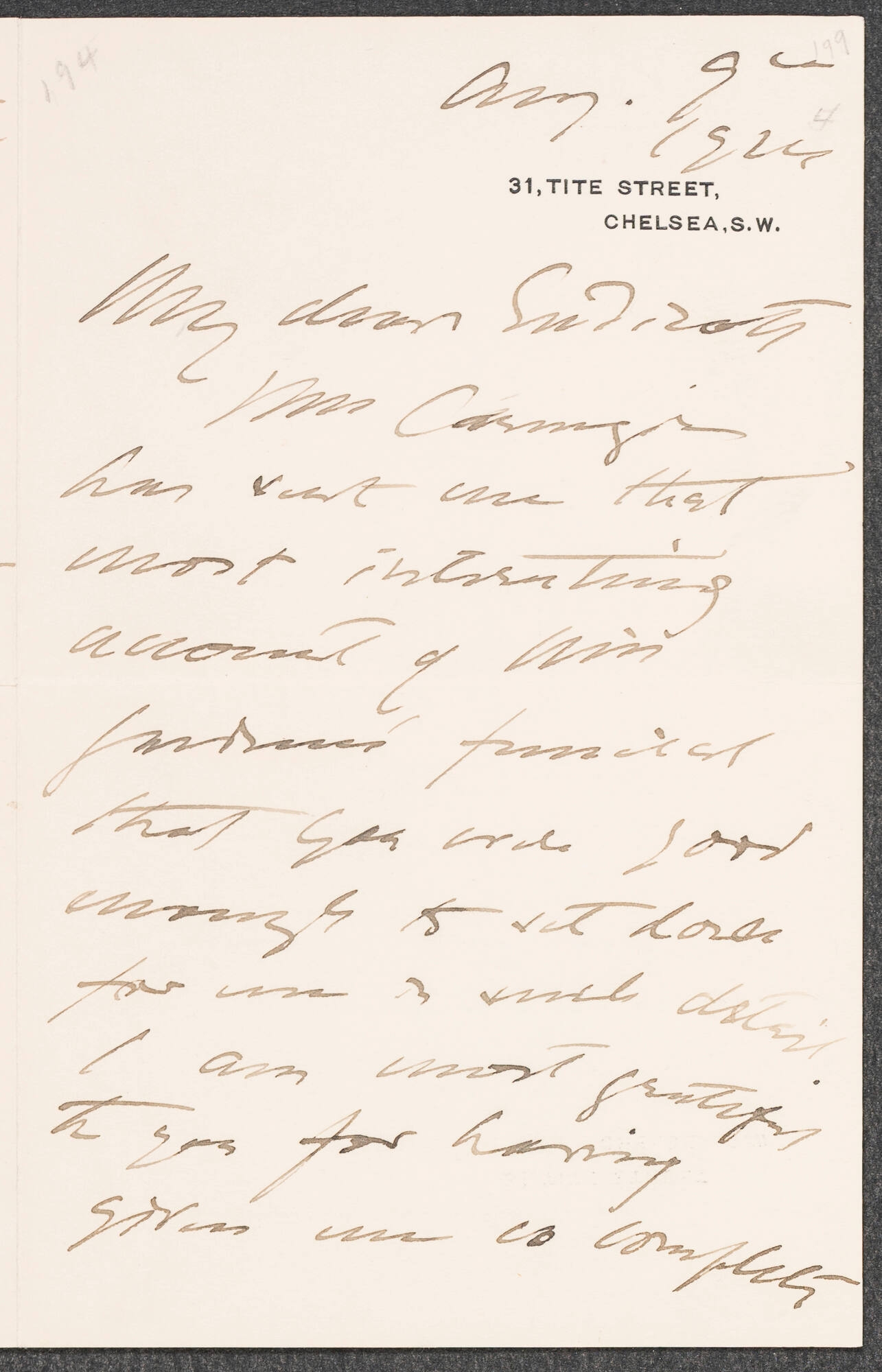 Letter to Isabella Stewart Gardner from 31 Tite Street, Chelsea, S.W., London