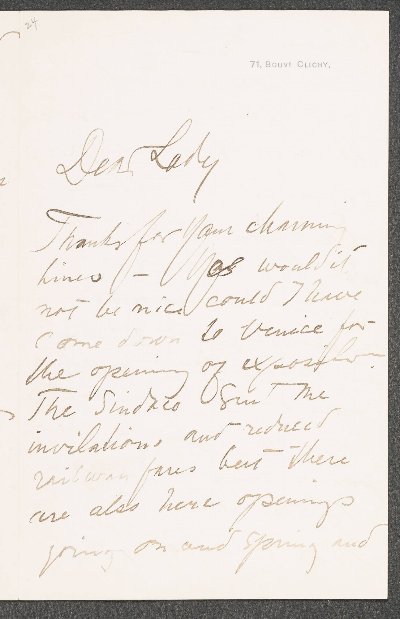 Letter to Isabella Stewart Gardner from 71 Boulevard Clichy, Paris