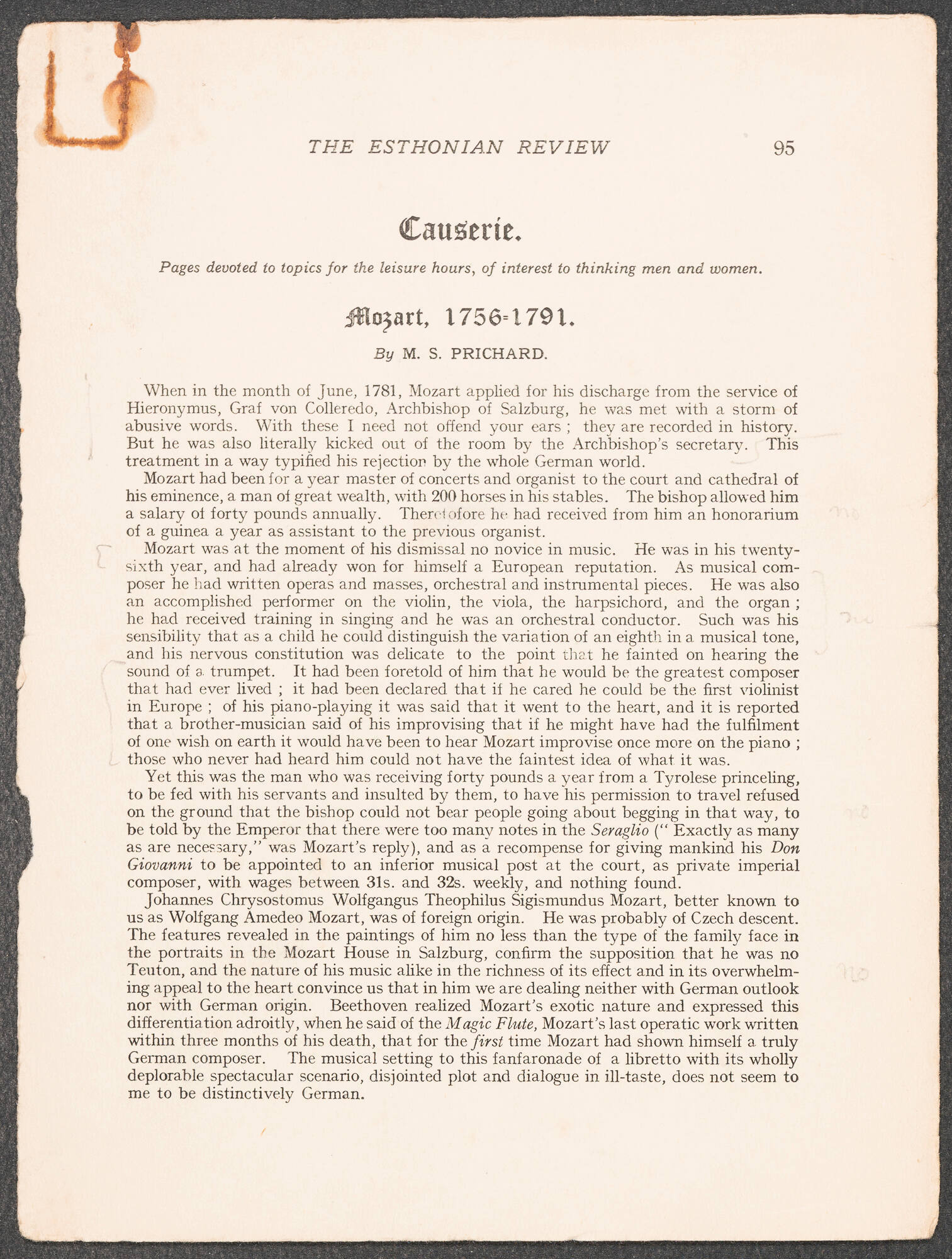 Inscribed in ink in Matthew Stewart Prichard's hand (recto): Esthonian Review on Mozart