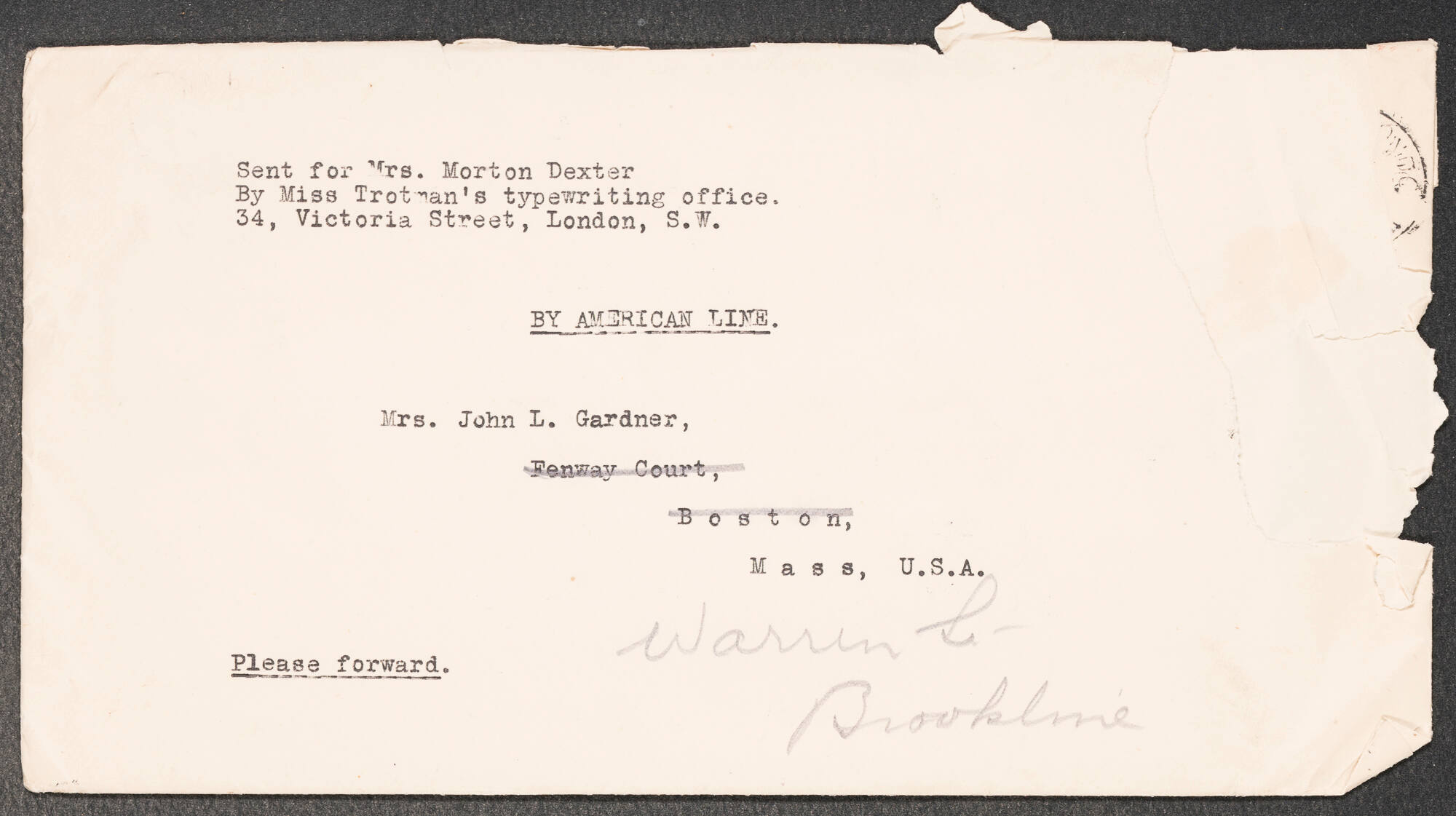 Nina Wutrich, "In the Soldier's Service: Mary Dexter, Isabella Stewart Gardner, and Caring for the Soldiers of WWI," Inside the Collection (blog), Isabella Stewart Gardner Museum, 8 November 2022, https://https://www.gardnermuseum.org/blog/soldiers-service-mary-dexter-isabella-stewart-gardner-and-caring-soldiers-wwi