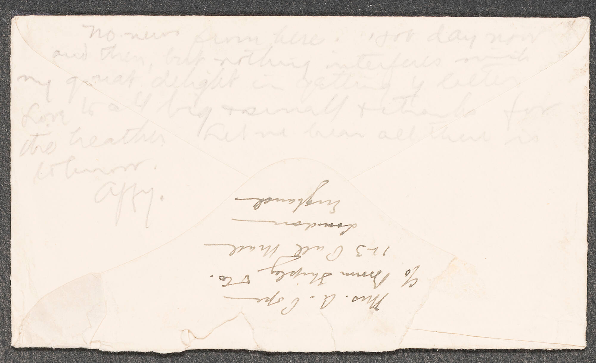 Envelope inscribed in ink (verso upper): Mrs. A. Pope / c/o [illeg] Shipley & Co / 123 Pall Mall / London / England