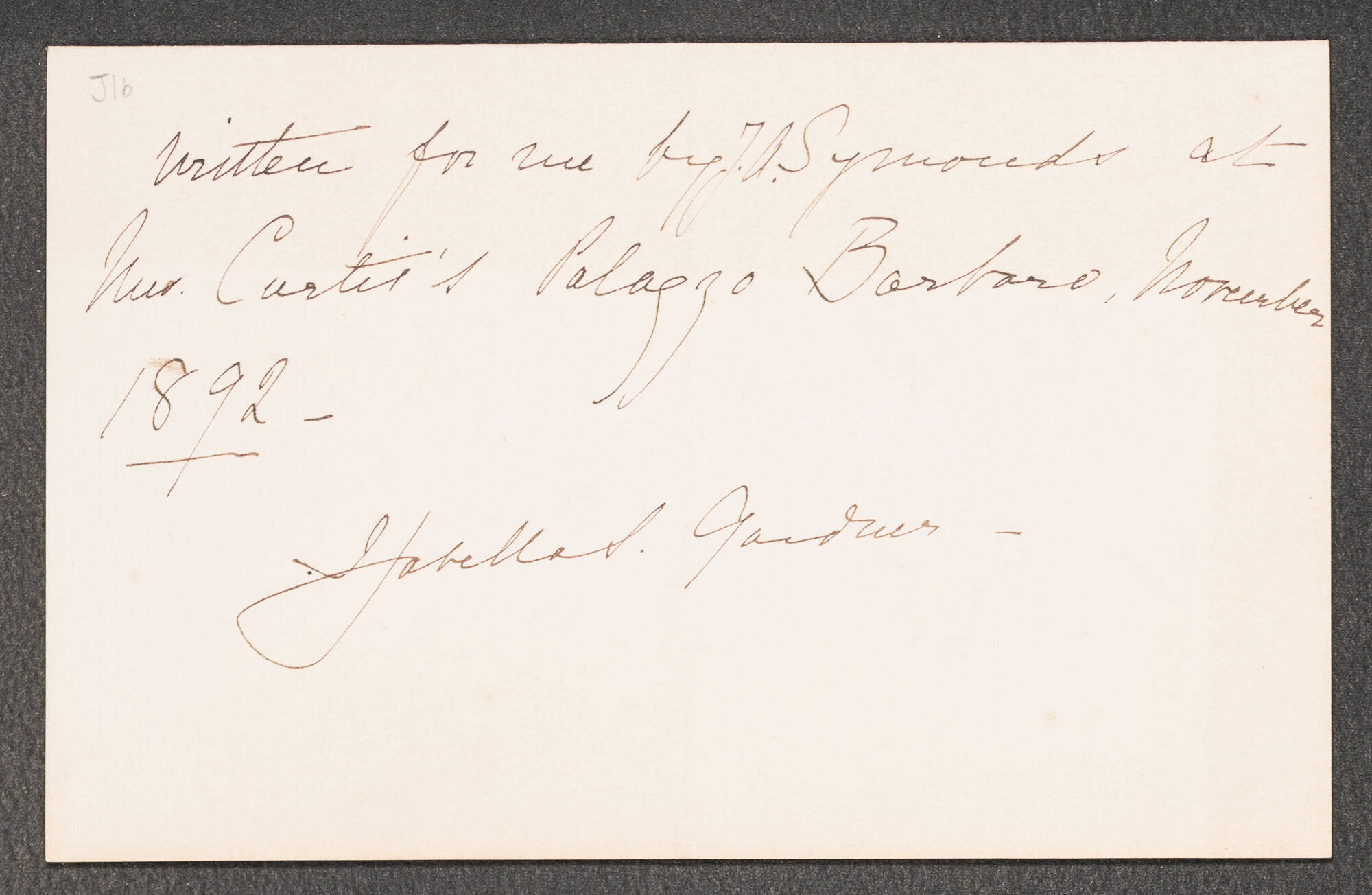 Inscribed in ink in Isabella Stewart Gardner's hand (verso): Written for me by J.A.Symonds at / Mrs. Curtis's Palazzo Barbaro, November / 1892 - / Isabella S. Gardner
