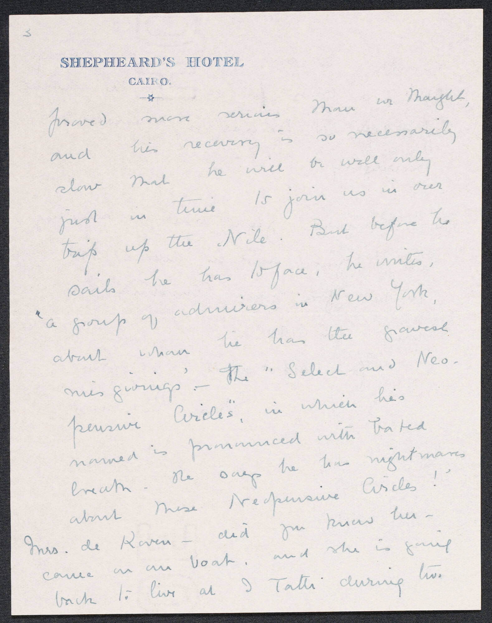 Letter to Isabella Stewart Gardner from Shepheard's Hotel, Cairo