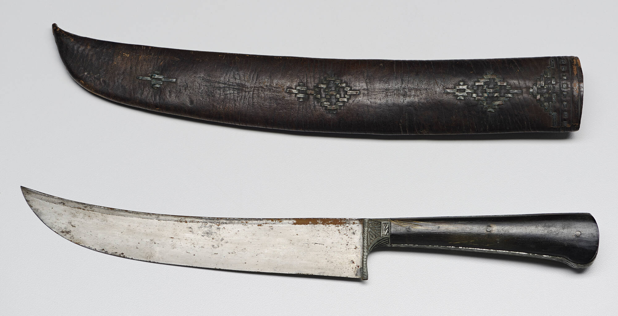 Steel blade with bone and silver handle and leather sheath with copper details